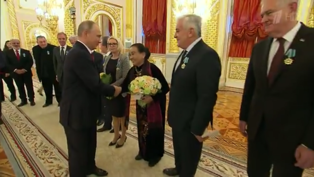 PGS.TSKH Nguyễn Tuyết Minh – cố vấn khoa học của Phòng đọc Thế giới Nga thuộc Khoa Quốc tế của ĐHQGHN là đại diện duy nhất của Việt Nam nhận Huy chương Puskin từ Tổng thống Nga Putin, tại Điện Kremlin, ngày 4/11/2017 (xem chi tiết tin).