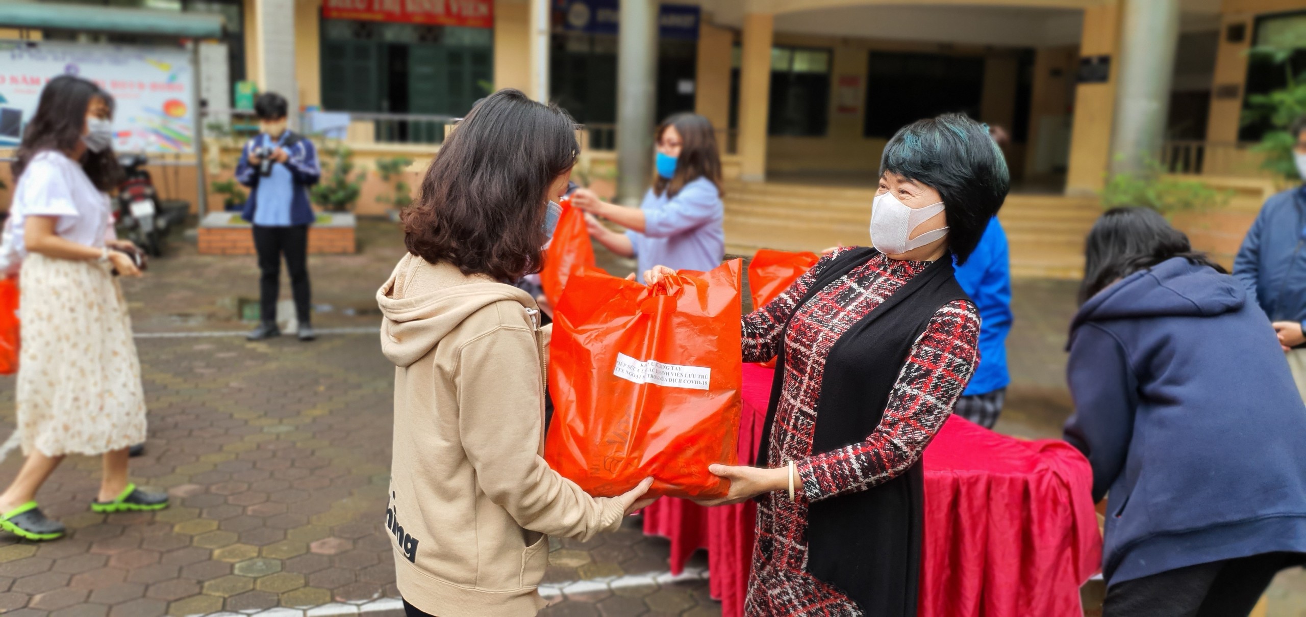 Tại đây 60 suất quà gồm các nhu yếu phẩm như bánh mỳ, mỳ tôm, sữa, nước rửa tay,… đã được gửi tới tận tay các bạn đoàn viên, sinh viên.