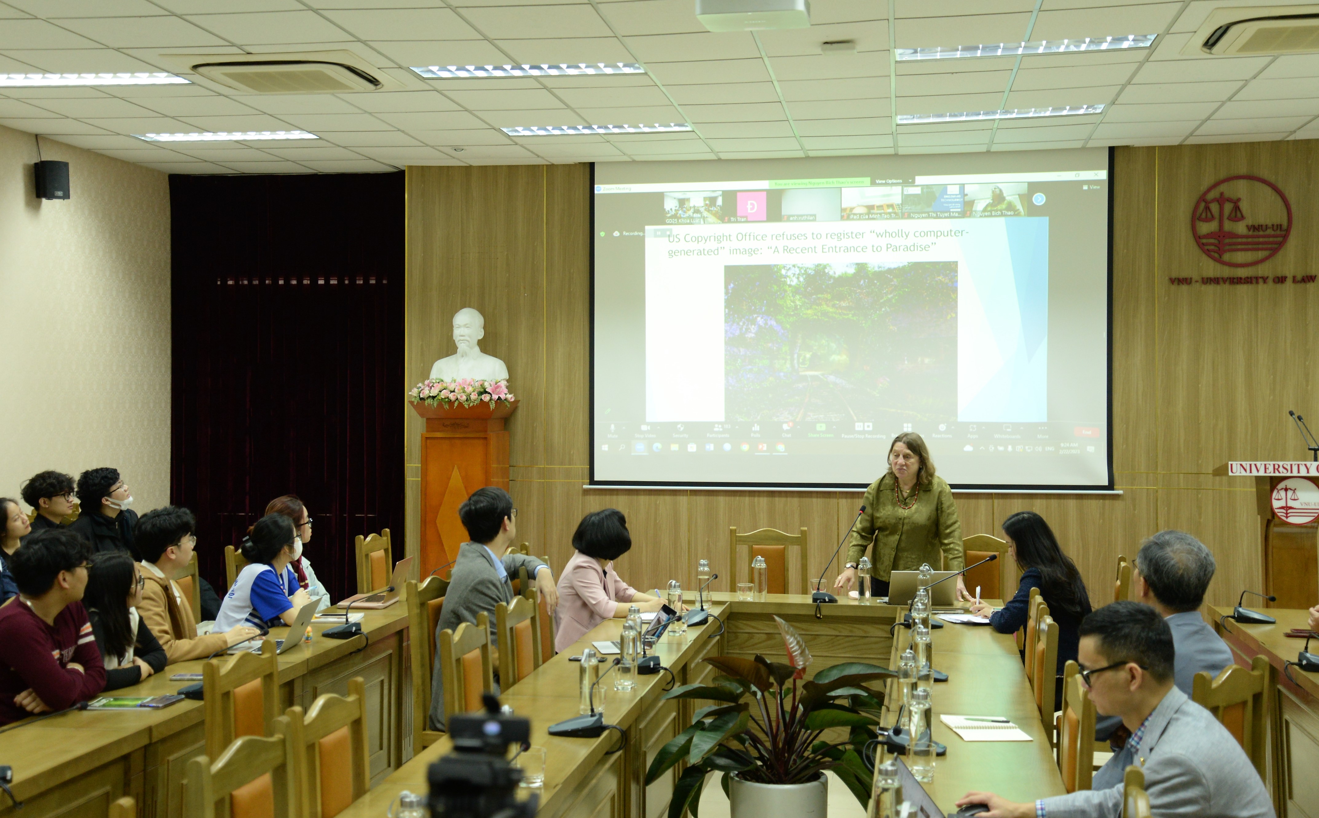 Là một trong những chuyên gia hàng đầu về sở hữu trí tuệ tại Hoa Kỳ, GS. Jane C. Ginsburg đã giới thiệu và chia sẻ cùng giảng viên, học viên, sinh viên về kinh nghiệm trong việc bảo hộ và thực thi quyền tác giả liên quan đến trí tuệ nhân tạo (AI) tại Hoa Kỳ, cũng như các trường hợp mà một tác phẩm được bảo hộ quyền tác giả. Theo GS thì trong luật pháp Hoa Kỳ, cơ quan sở hữu trí tuệ sẽ phải xem xét mức độ đóng góp của những nhân tố thực hiện sáng chế để quyết định xem họ có phải là nhà sáng chế hay không và trong trường hợp tác phẩm nghệ thuật do AI tạo ra cũng có những vấn đề tương tự do những tác phẩm này thiếu “quyền tác giả của con người”.