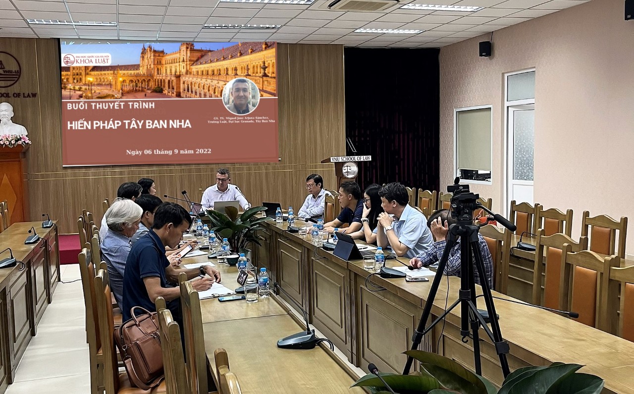 Ngày 06/9/2022, Khoa Luật, Đại học Quốc gia Hà Nội (ĐHQGHN) đã tổ chức buổi thuyết trình với chủ đề “Hiến pháp Tây Ban Nha” do GS. Miguel Jose Arjona Sánchez, Trường Luật, Đại học Granada, Tây Ban Nha là diễn giả chính.