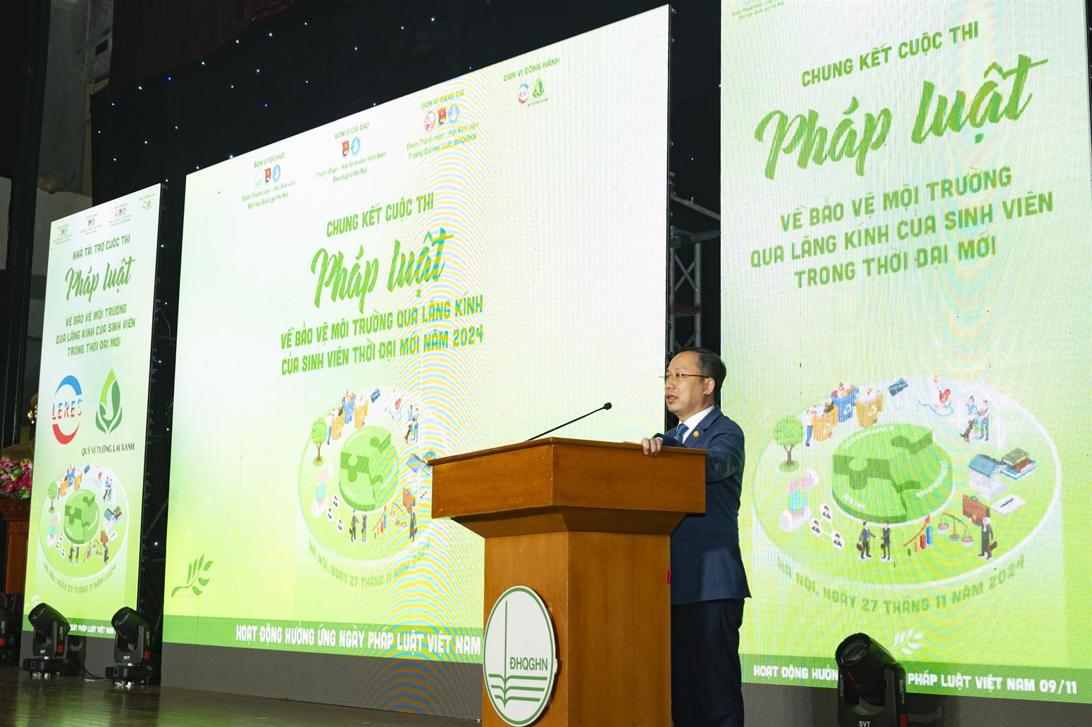 Phát biểu khai mạc buổi lễ, Phó Bí thư Thành đoàn Hà Nội Đào Đức Việt cho biết bảo vệ môi trường không chỉ là trách nhiệm pháp lý mà còn là trách nhiệm đạo đức, trách nhiệm xã hội của mỗi cá nhân và cộng đồng. Trong bối cảnh thế giới và Việt Nam đang đối mặt với biến đổi khí hậu, ô nhiễm môi trường, và sự suy giảm tài nguyên thiên nhiên, vai trò của pháp luật càng trở nên quan trọng hơn bao giờ hết. Đồng thời, giới trẻ, những người mang trong mình trí tuệ, sự sáng tạo và nhiệt huyết, chính là lực lượng tiên phong trong việc nắm bắt, hiểu biết về pháp luật để đưa ra các sáng kiến bảo vệ môi trường, thúc đẩy lối sống xanh và xây dựng một tương lai bền vững. Đồng chí cũng gửi lời cảm ơn đến Đảng ủy – Ban Giám đốc ĐHQGHN và Ban Giám hiệu Trường Đại học Luật, ĐHQGHN đã quan tâm, hưởng ứng và đăng cai cuộc thi; các cơ quan, tổ chức, nhà tài trợ và các chuyên gia đồng hành xuyên suốt hành trình diễn ra cuộc thi.