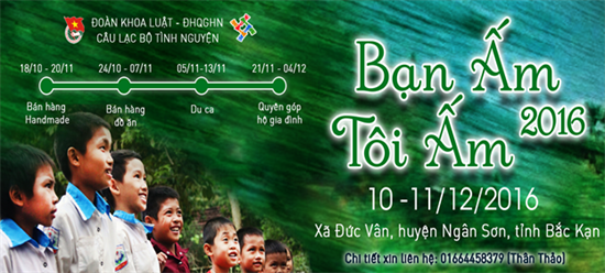 “Bạn ấm – Tôi ấm” là chương trình tình nguyện thường niên vào mùa đông của CLB Tình Nguyện Khoa Luật – ĐHQGHN đi đến những vùng miền còn gặp nhiều khó khăn với mục đích giúp đỡ phần nào cuộc sống của người dân về cả vật chất lẫn tinh thần. Năm nay, dưới sự chỉ đạo của Đoàn Khoa Luật và tiếp nối thành công của các mùa trước,“Bạn ấm – Tôi ấm 2016” sẽ được tổ chức tại xã Đức Vân, huyện Ngân Sơn, tỉnh Bắc Kạn.
