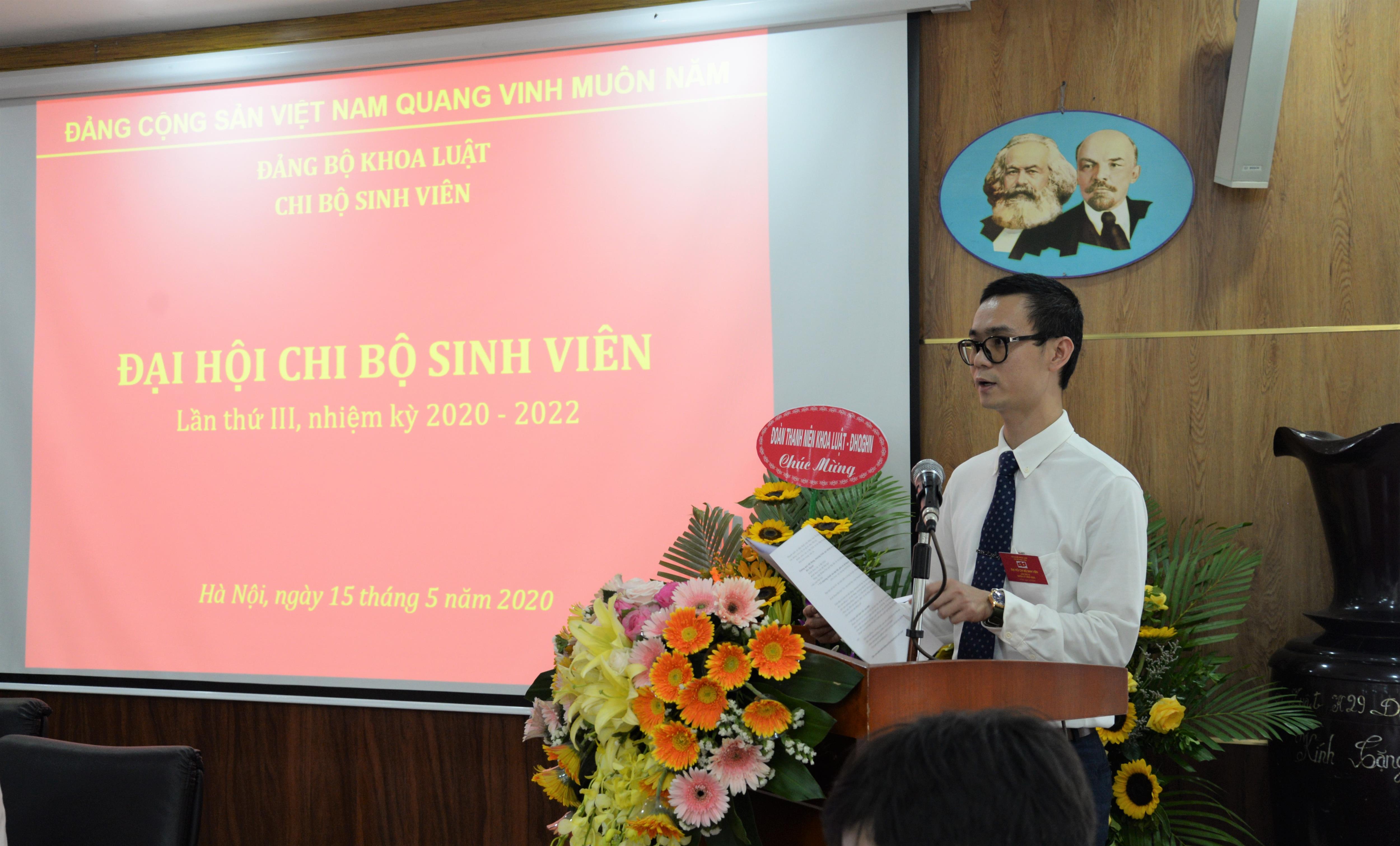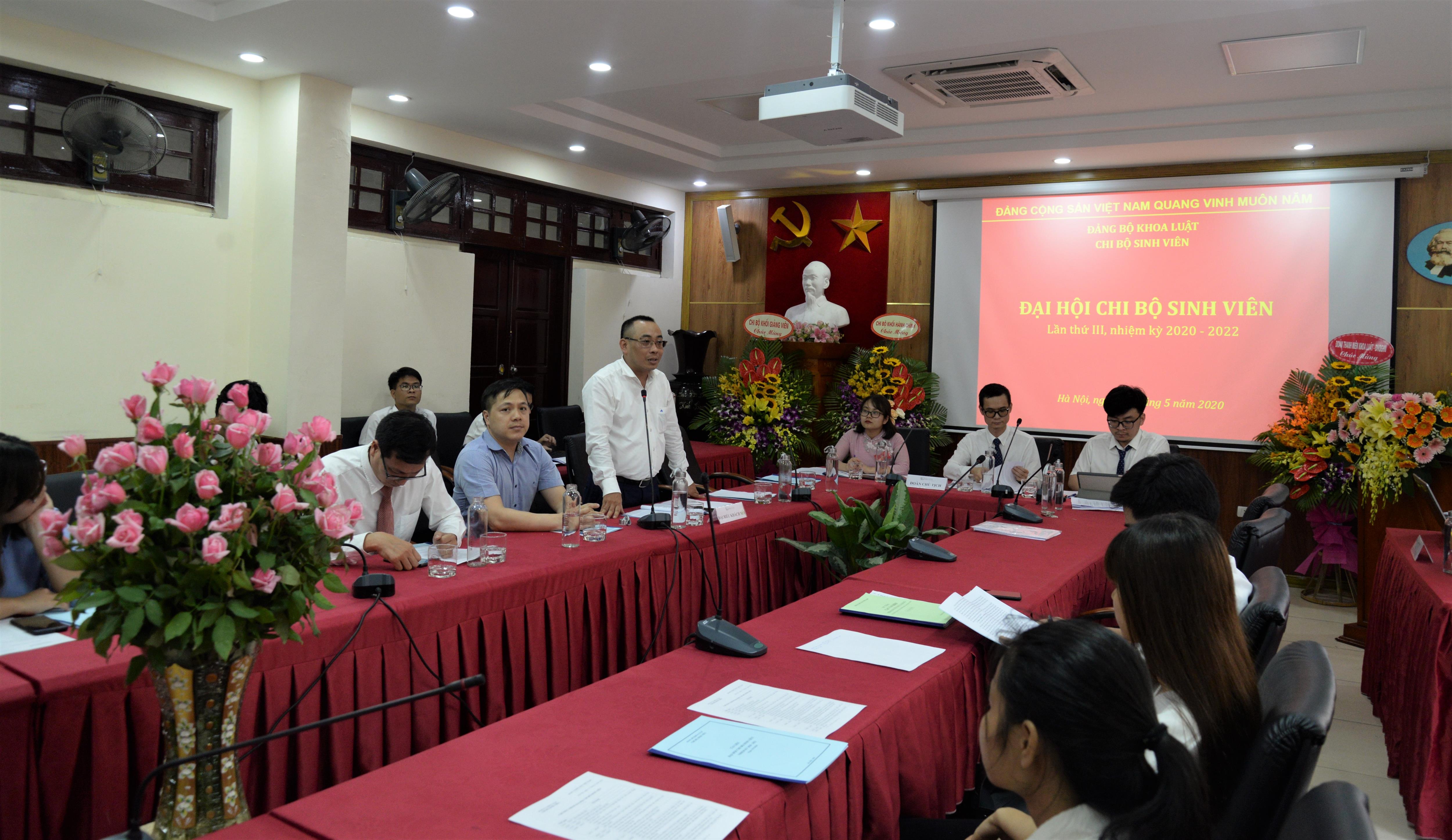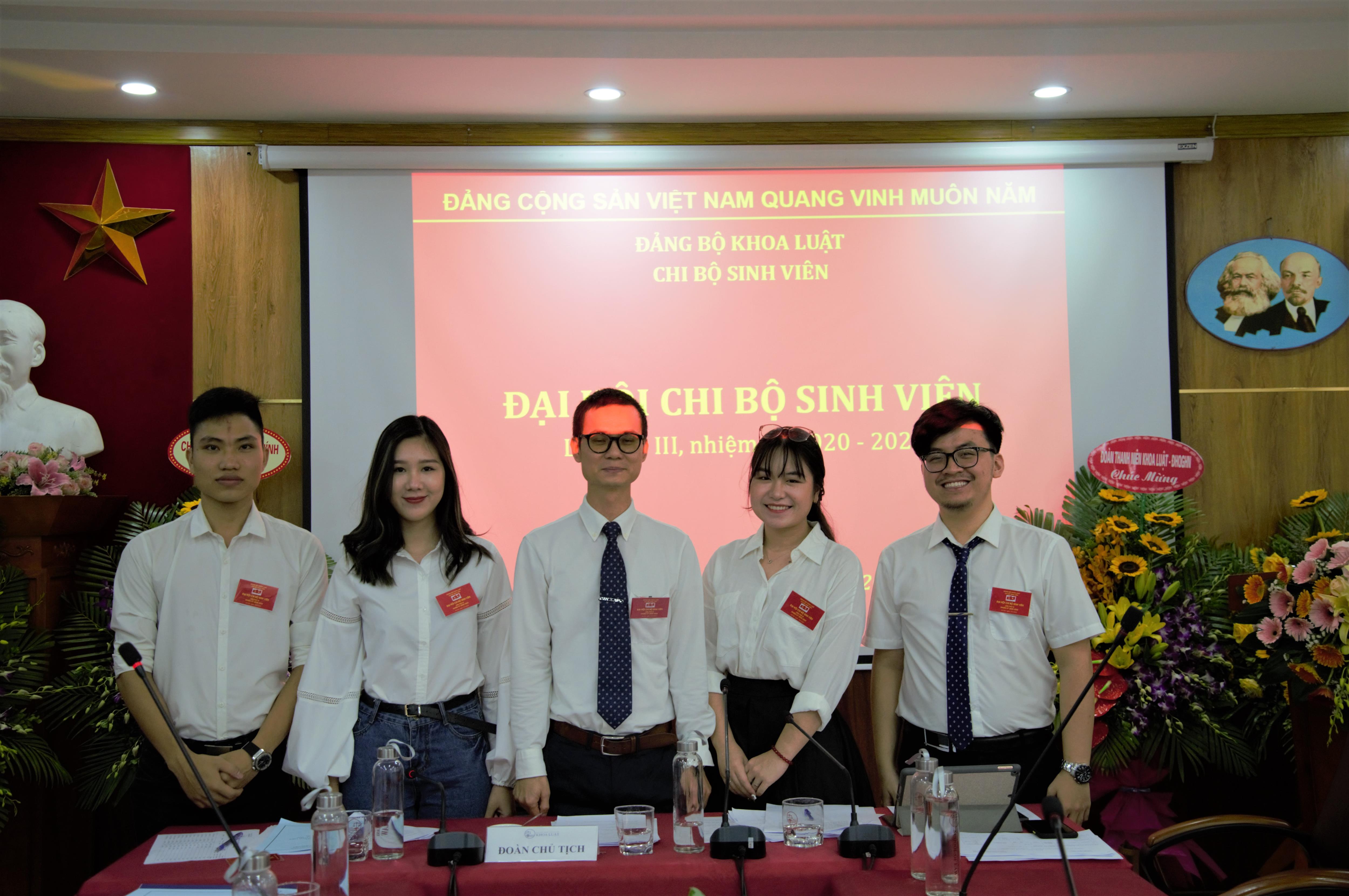 Chiều ngày 15/5/2020, tại Khoa Luật, Đại học Quốc gia Hà Nội (ĐHQGHN), Chi bộ Sinh viên đã long trọng tổ chức Đại hội Chi bộ nhiệm kỳ 2020 – 2022. Đến dự tại Đại hội có đồng chí Trịnh Tiến Việt – Phó Bí thư Đảng ủy, Chủ nhiệm Ủy ban Kiểm tra Đảng ủy Khoa, Phó Chủ nhiệm Khoa, đồng chí Nguyễn Trọng Điệp – Đảng ủy viên, Phó Chủ nhiệm Khoa, đồng chí Trần Anh Tú – Đảng ủy viên, Trưởng phòng Khảo thí và Đảm bảo chất lượng, đồng chí Bùi Đức Lợi – Bí thư Chi bộ Khối Hành chính , đồng chí Đặng Minh Tuấn – Phó Bí thư Chi bộ Khối Giảng viên, đồng chí Ngô Thanh Hương – Bí thư Đoàn Khoa, đồng chí Văn Thị Thao Giang – Phó Chủ tịch Hội sinh viên Khoa và các đảng viên trong Chi bộ. Điều hành tại Đại hội là Đoàn chủ tịch gồm 03 đồng chí: đồng chí Bùi Tiến Đạt, đồng chí Trần Đăng Ngọc Sơn và đồng chí Nguyễn Thị Hồng Hạnh.