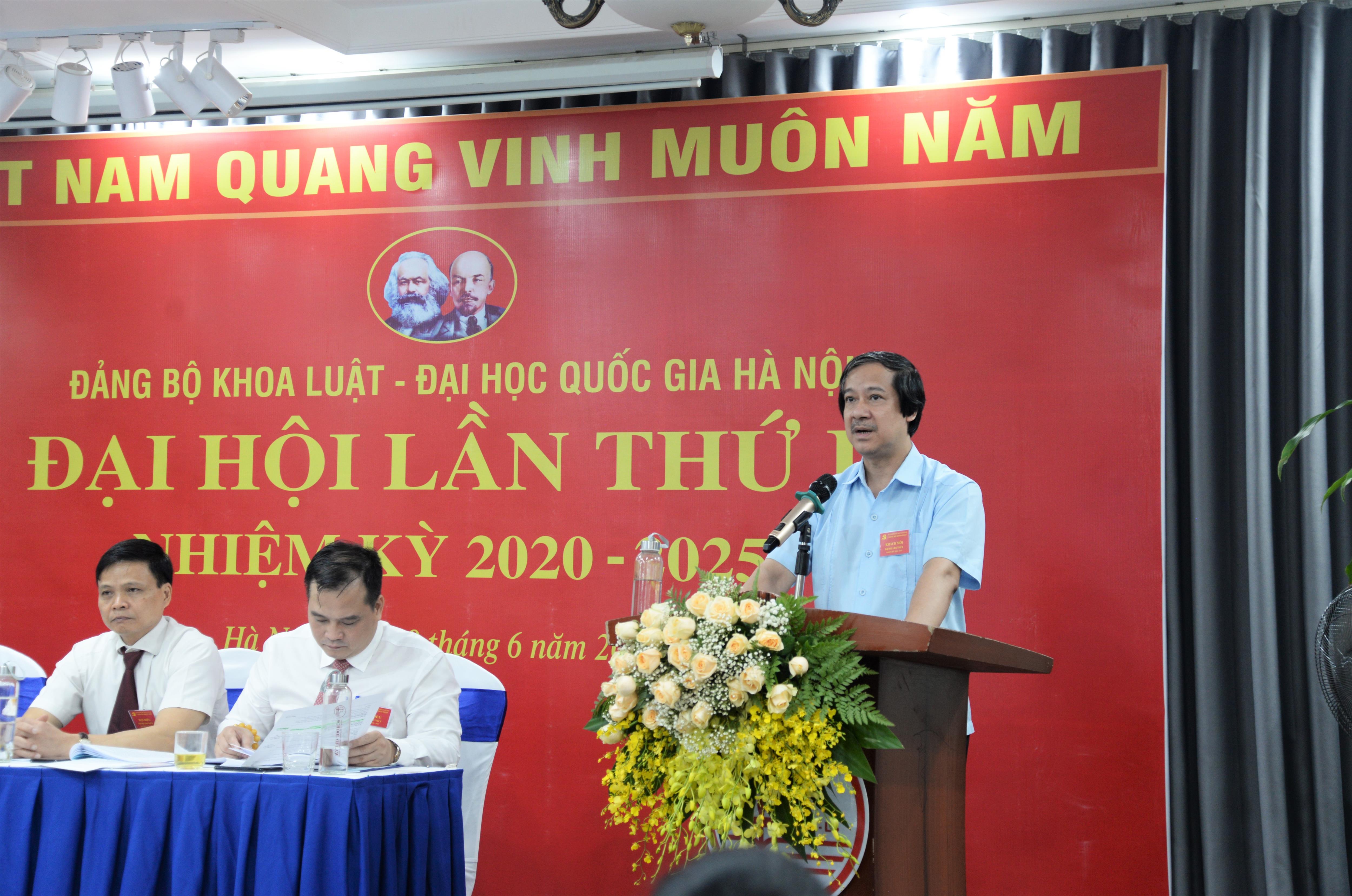 Phát biểu tại Đại hội, đồng chí Nguyễn Kim Sơn đánh giá cao tính chuyên nghiệp trong công tác lãnh đạo, chỉ đạo của Đảng bộ Khoa Luật, ĐHQGHN đối với mọi mặt hoạt động của Khoa. Đồng chí đồng thời ghi nhận và biểu dương những nỗ lực của đội ngũ cán bộ Khoa trong suốt thời gian qua, đặc biệt là sự nhiệt huyết, chủ động của Đảng ủy và Ban Chủ nhiệm Khoa. Khoa Luật là một đơn vị lớn với bề dày lịch sử, sức ảnh hưởng xã hội, vị thế xã hội trong suốt thời gian qua. Với nguồn nhân lực, đội ngũ khoa học chất lượng cao, quy mô đào tạo, số lượng cựu học viên lan tỏa mạnh mẽ trên cả nước, Đại học Quốc gia Hà Nội kỳ vọng Khoa Luật sẽ tiếp tục phát triển trở thành trường Đại học Luật thành viên ĐHQGHN. Đồng thời đồng chí Bí thư Đảng ủy ĐHQGHN giao nhiệm vụ có thể thực hiện trong nhiệm kỳ tới là: