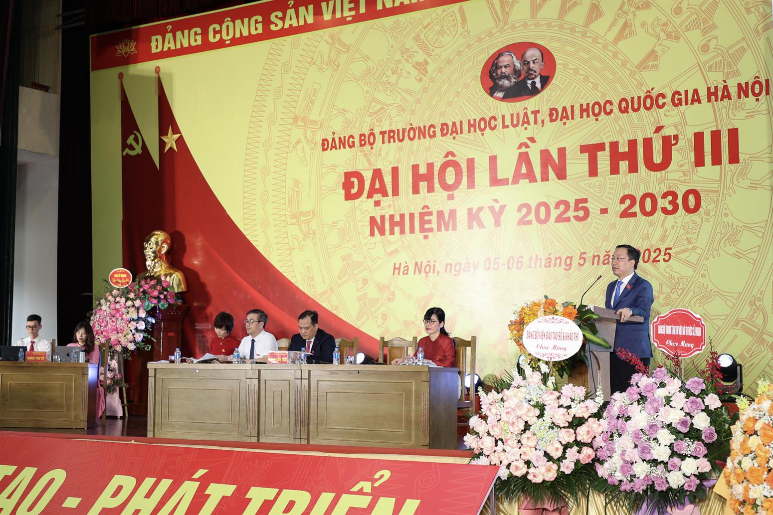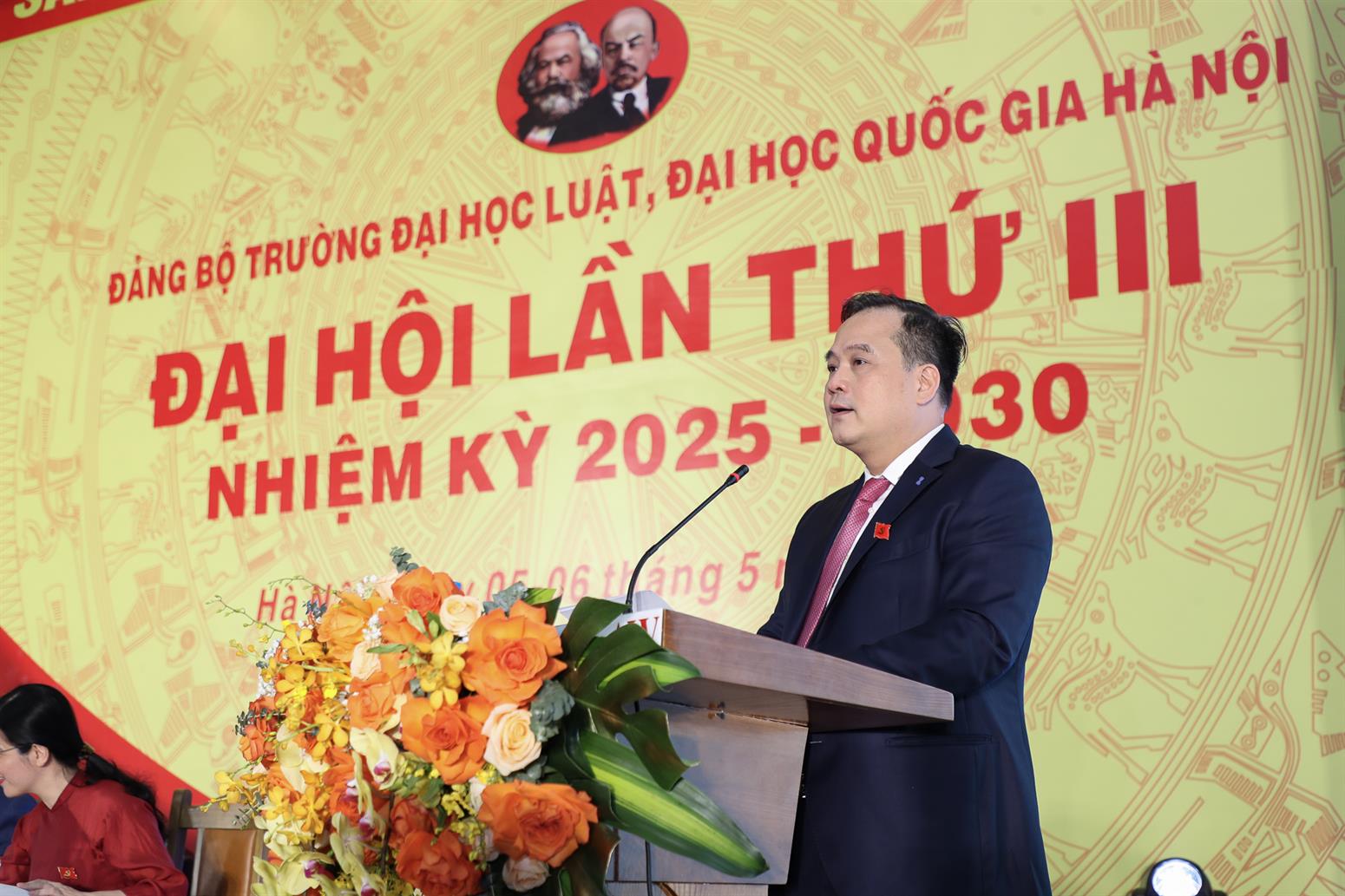 Phát biểu chỉ đạo tại Đại hội, Phó Bí thư Đảng ủy, Phó Giám đốc ĐHQGHN Nguyễn Hoàng Hải đánh giá cao những thành tựu toàn diện của Đảng bộ Trường Đại học Luật trong nhiệm kỳ 2020–2025, đặc biệt là dấu mốc chuyển đổi từ Khoa Luật trở thành Trường Đại học Luật thuộc ĐHQGHN theo Quyết định của Thủ tướng Chính phủ năm 2022. Đồng chí ghi nhận tinh thần đoàn kết, đổi mới, bản lĩnh trong tổ chức bộ máy, nâng cao chất lượng đào tạo, tăng cường tự chủ và phát huy hiệu quả nghiên cứu khoa học, với nhiều kết quả nổi bật: 100% chương trình đại học được kiểm định, trên 60% chương trình thạc sĩ hoàn thành kiểm định, số lượng công bố quốc tế tăng mạnh và tiên phong triển khai đào tạo học phần “Nhà nước và pháp luật đại cương” trực tuyến cho toàn ĐHQGHN. Phó Giám đốc ĐHQGHN nhấn mạnh yêu cầu đổi mới tư duy lãnh đạo, gắn kết công tác Đảng với nhiệm vụ chuyên môn, đồng thời định hướng ba nhóm nhiệm vụ trọng tâm cho nhiệm kỳ tới: Xây dựng Đảng bộ vững mạnh, hệ thống quản trị tinh gọn, phát huy đoàn kết nội bộ; Tham gia tích cực các chương trình chiến lược của ĐHQGHN, nhất là về khoa học công nghệ, đổi mới sáng tạo, tinh gọn tổ chức và tư vấn chính sách pháp lý; Đổi mới nội dung, phương pháp giảng dạy, gắn với thực tiễn và thích ứng với chuyển đổi số, hội nhập quốc tế.