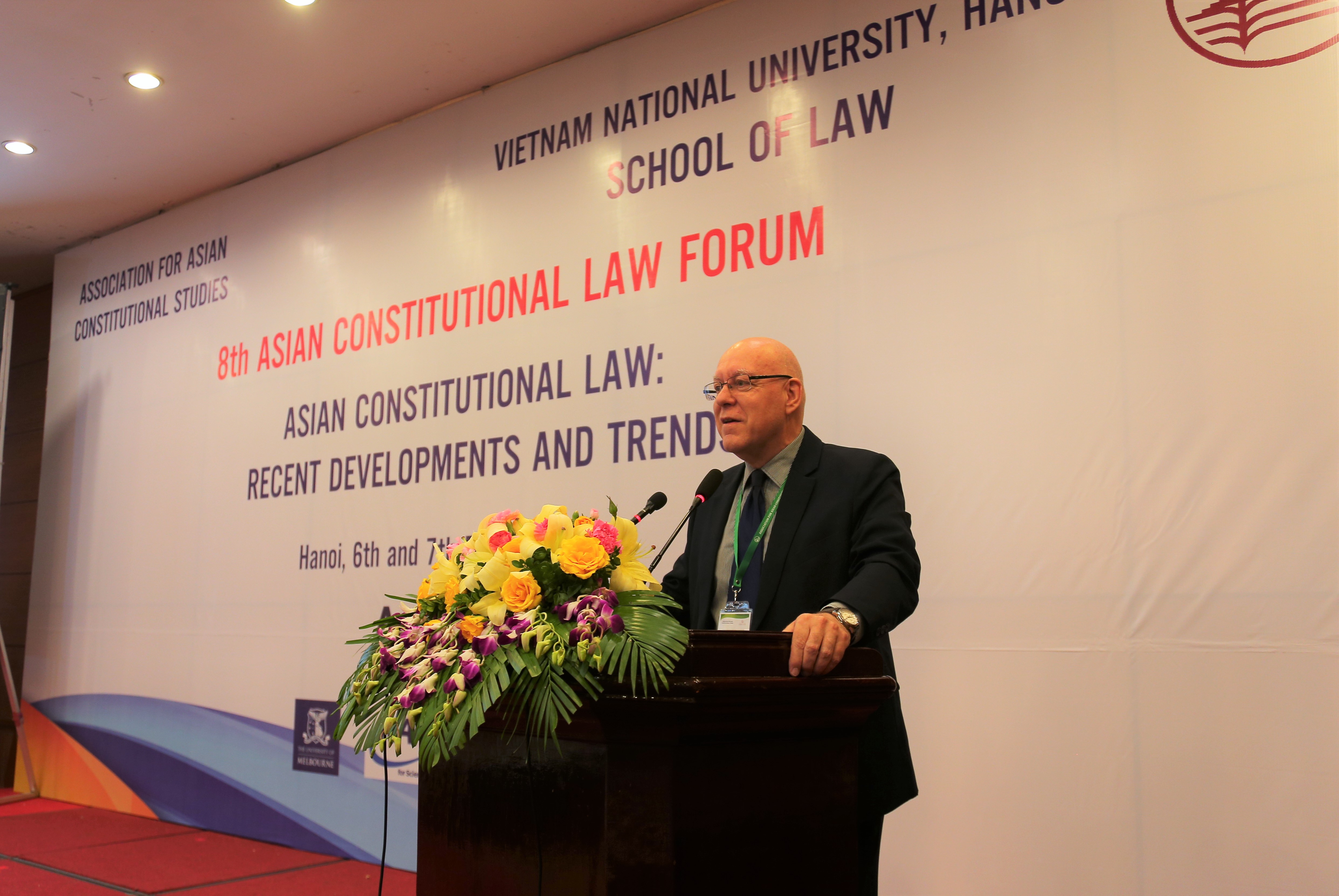 GS. Andrew Harding – người đã tạo cơ hội và sát cánh hỗ trợ Khoa Luật hơn một năm nay trong việc chuẩn bị cho Diễn đàn chia sẻ sự vui mừng và gửi lời chào mừng tới tất cả đại biểu đã tham gia Diễn đàn ngày hôm nay. GS cũng gửi lời cám ơn Khoa Luật, ĐHQGHN đã đồng hành cũng Hiệp hội để tổ chức thành công Diễn đàn lần thứ 8 này. Theo GS, Hội thảo này có sự tham gia của đông đảo các đại biểu của các trường Đại học và các đại biểu từ các đơn vị nghiên cứu độc lập trong đó cũng có hơn 50 đại biểu là thành viên của Hiệp hội Nghiên cứu Hiến pháp Châu Á tham gia. GS cũng nhấn mạnh Diễn đàn Hiến pháp Châu Á đã trải qua 14 năm với 8 Diễn đàn được tổ chức cho thấy sức hút của Hội thảo. GS hi vọng Diễn đàn này sẽ là nơi để các đại biểu có thể chia sẻ và kết nối với nhau.