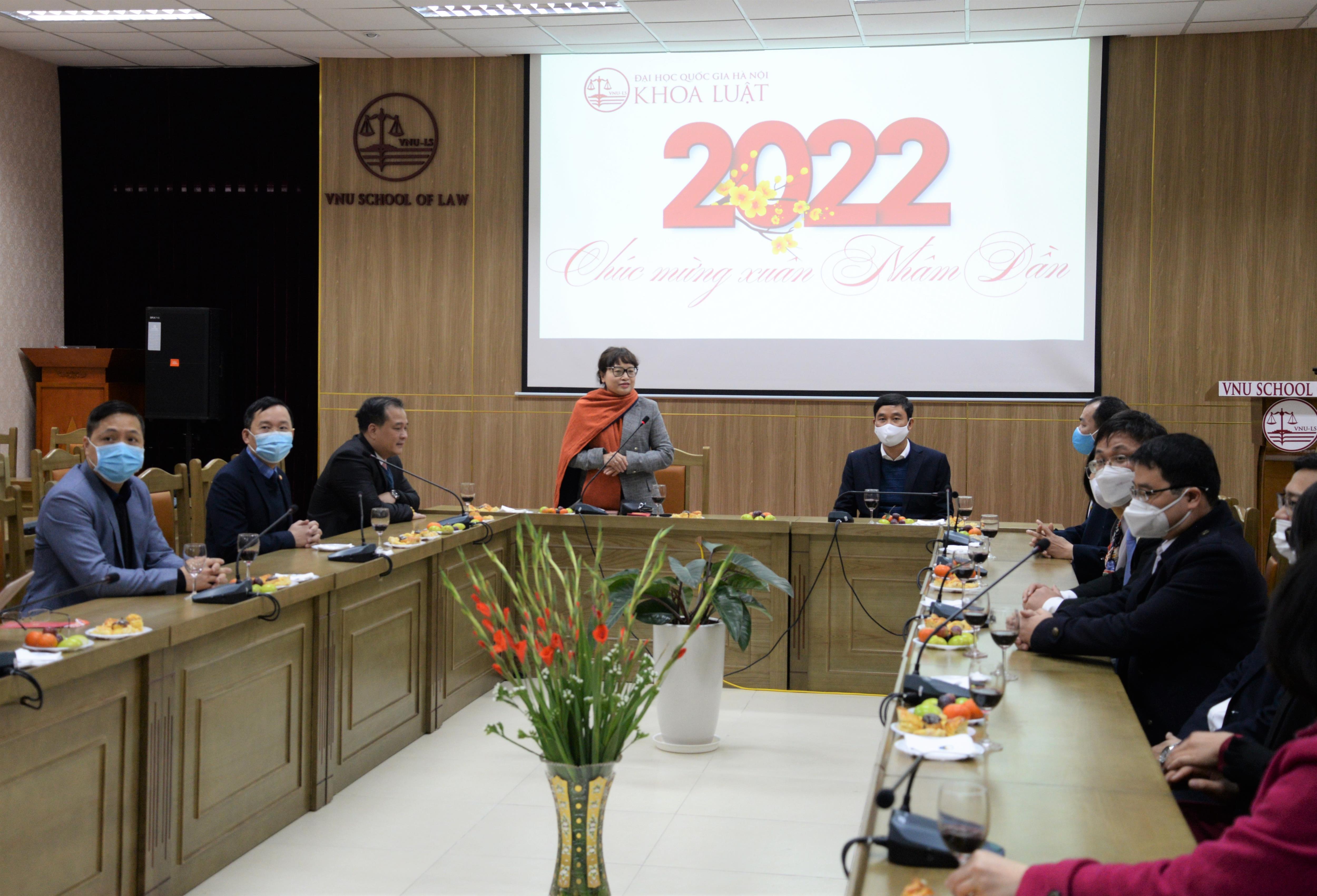 Thay mặt cho Đảng ủy, Ban Chủ nhiệm Khoa, PGS.TS Nguyễn Thị Quế Anh gửi lời chúc mừng năm mới tới Ban Giám đốc ĐHQGHN, các ban chức năng và toàn thể các cán bộ, viên chức, người lao động Khoa. PGS.TS. Nguyễn Thị Quế Anh ghi nhận những nỗ lực, tâm huyết, phấn đấu không ngừng của tập thể viên chức, người lao động, người học, các thầy, cô cộng tác viên, giảng viên kiêm nhiệm và các đơn vị đối tác của Khoa trong năm 2021. Bước sang năm 2022, tập thể các cán bộ, viên chức, người lao động của Khoa sẽ tiếp tục đoàn kết, quyết tâm hoàn thành tốt nhiệm vụ đã đề ra, tập trung ưu tiên mục tiêu xây dựng Khoa Luật trở thành trường đại học định hướng nghiên cứu về luật học hàng đầu ở Việt Nam, thúc đẩy tự chủ đại học, đổi mới hoạt động giảng dạy. PGS. TS. Nguyễn Thị Quế Anh chúc Khoa Luật, ĐHQGHN ngày càng phát triển vững mạnh, nắm chắc thời cơ, vận hội và gặt hái được nhiều thành công hơn nữa trong năm Nhâm Dần 2022.