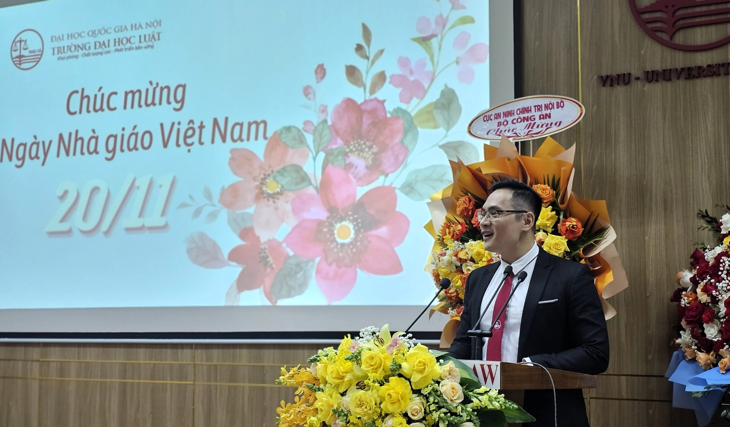 Đại diện giảng viên của Trường, PGS.TS. Nguyễn Minh Tuấn chia sẻ “Nghề giáo là nghề cao quý, một nghề hết sức vẻ vang, dẫu biết rằng vẫn còn nhiều khó khăn, thách thức đang đặt ra cho các thầy giáo, cô giáo như chúng ta; đặc biệt trước yêu cầu “Đổi mới căn bản toàn diện nền giáo dục, nâng cao chất lượng dạy học” hiện nay”. Thầy cũng cho biết, thầy đã hơn 20 năm công tác tại mái trường này và coi Trường Đại học Luật, ĐHQGHN nhưng tổ ấm gia đình thứ 2. Đối với thầy, thầy luônthấy ấm lòng hơn khi nhìn những ánh mắt biết nói của học trò, những nụ cười thân thương của các em. Chính các em sinh viên, các học viên, với tinh thần ham học, khát khao tri thức, đã thôi thúc những người thầy giáo, cô giáo tiếp tục phấn đấu, vượt mọi khó khăn hoàn thành tốt nhiệm vụ.