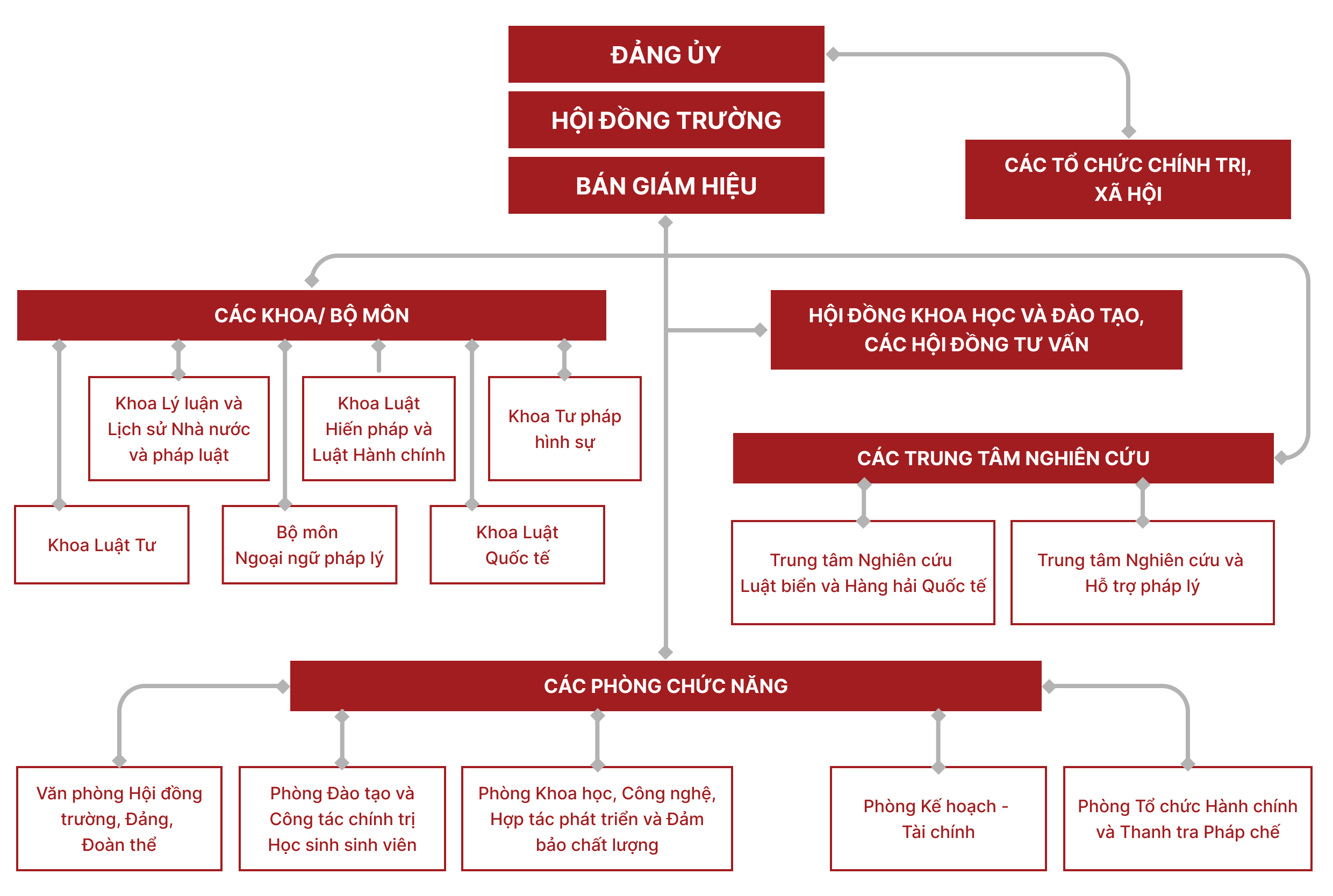 Trường Đại học Luật, ĐHQGHN có cơ cấu tổ chức chặt chẽ, gồm các đơn vị quản lý, đào tạo và nghiên cứu chuyên sâu. Hệ thống này đảm bảo sự vận hành hiệu quả, thúc đẩy chất lượng giảng dạy, nghiên cứu và phát triển trong lĩnh vực pháp luật.