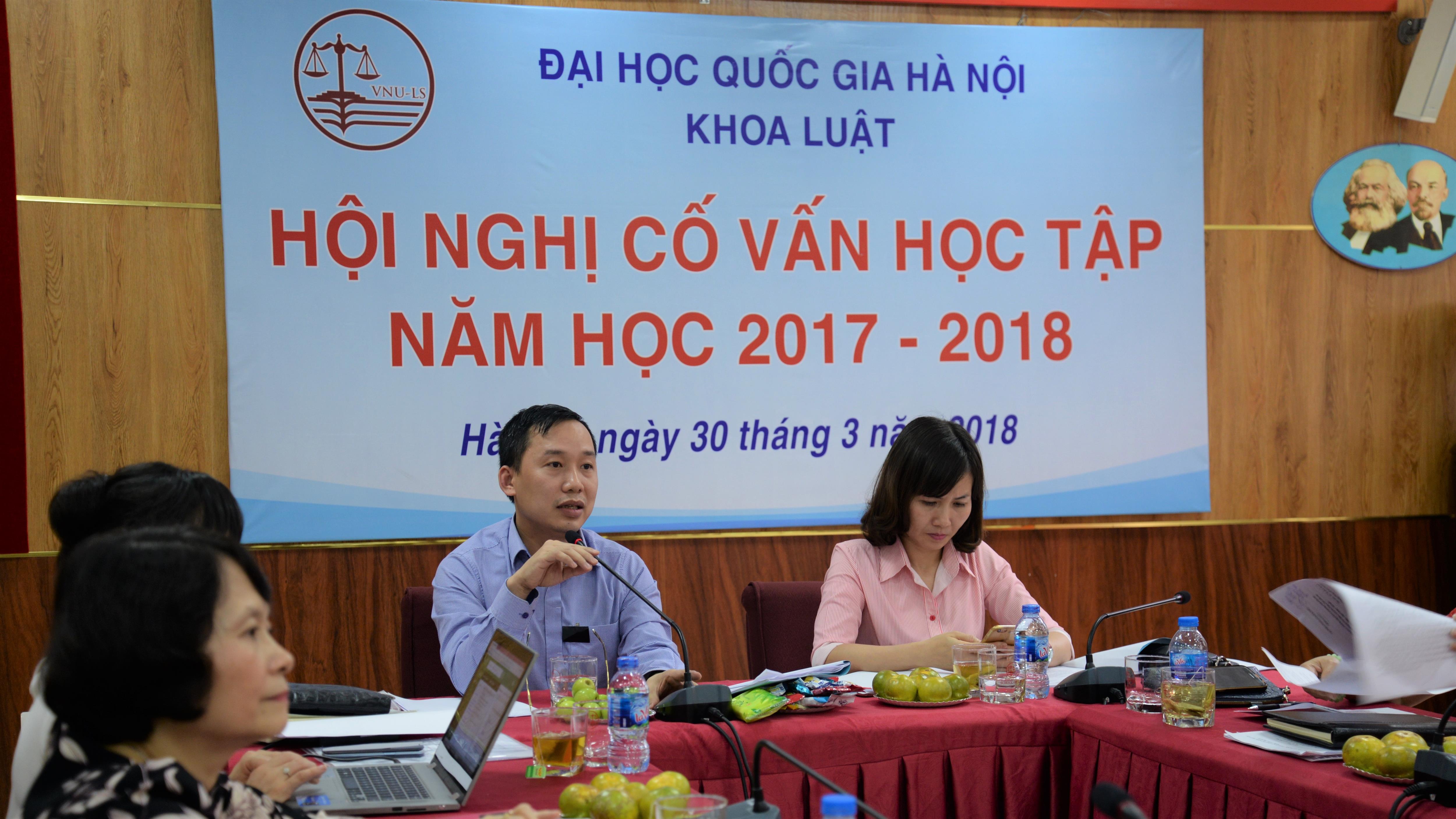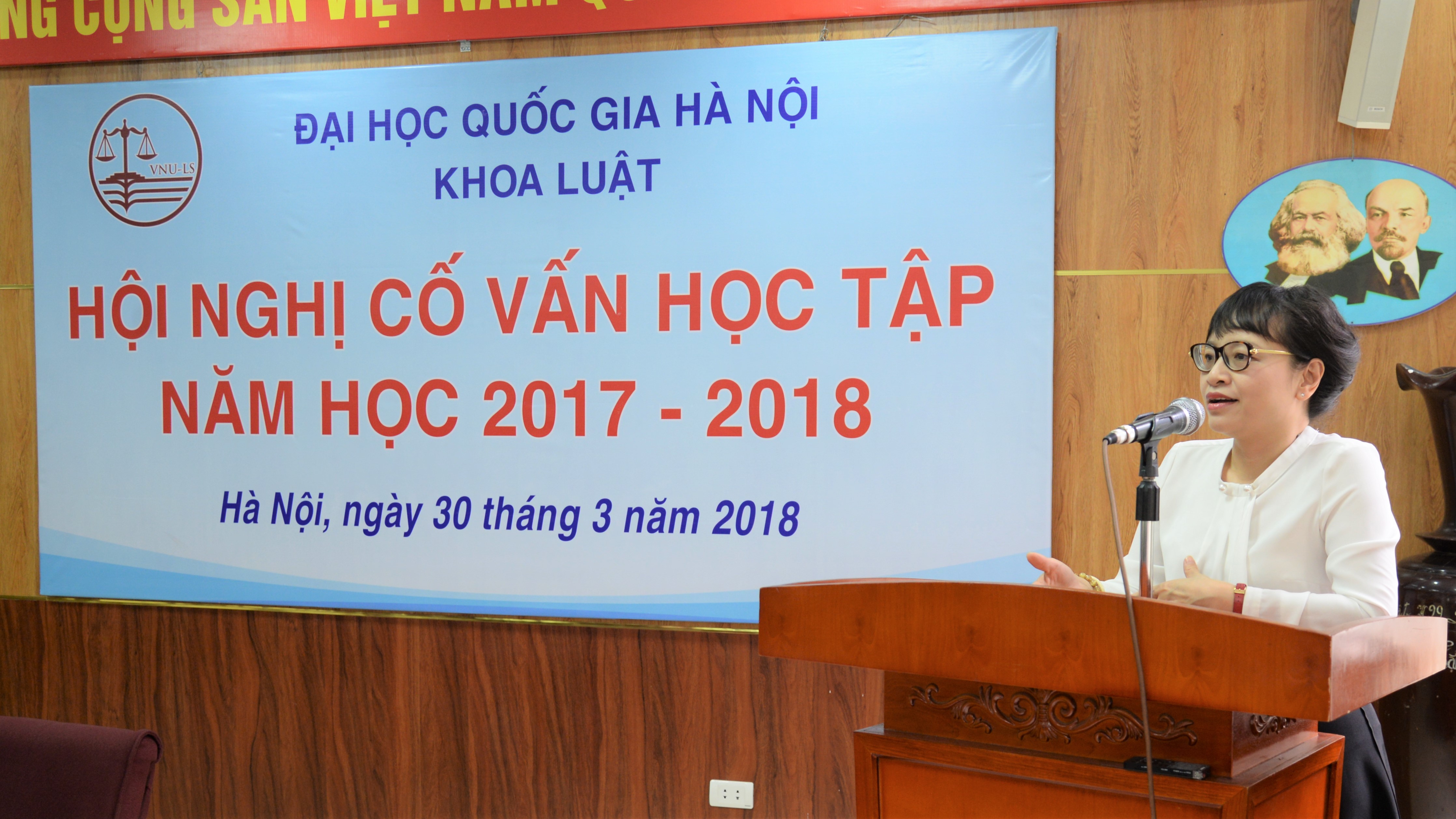 Ngày 30/3/2018, Khoa Luật, Đại học Quốc gia Hà Nội đã tổ chức Hội nghị cố vấn học tập năm học 2017 – 2018, tới dự Hội nghị có ThS. Nguyễn Thị Hồng Hạnh – Phó Trưởng Ban CTCTHSSV, Bà Lê Thị Phương Hoa – Phó Trưởng Phòng QLĐT, Đại học Công nghệ. Về phía Khoa Luật có PGS.TS. Nguyễn Thị Quế Anh – Phó Chủ nhiệm phụ trách Khoa Luật, PGS.TS. Trịnh Tiến Việt – Phó Chủ nhiệm Khoa, PGS.TS. Ngô Huy Cương – Chủ nhiệm Bộ môn Luật Dân sự, TS. Trần Thu Hạnh – Trưởng Phòng QLĐT, Đ/c Ngô Thanh Hương – Bí thư Đoàn Khoa cùng đại diện các đơn vị, các giảng viên và sinh viên của Khoa.