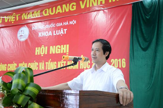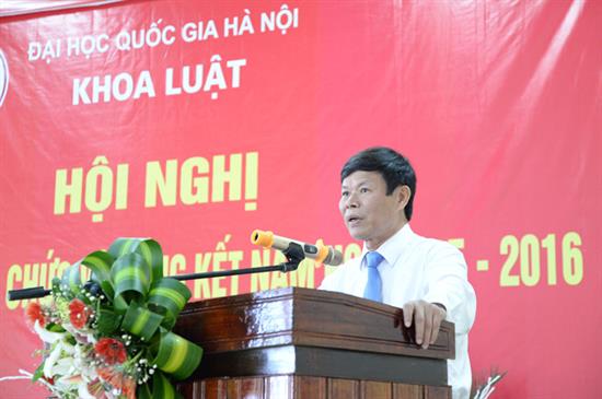 PGS.TS. Trịnh Quốc Toản, Quyền Chủ nhiệm Khoa đã thay mặt Ban Chủ nhiệm Khoa trình bày trước hội nghị báo cáo Tổng kết năm học 2015 – 2016 và kế hoạch nhiệm vụ năm học 2016 – 2017. Theo đó, trong năm học vừa qua, Khoa nhận được sự quan tâm, chỉ đạo sát sao của Đảng ủy và lãnh đạo ĐHQGHN trong mọi mặt hoạt động công tác, đặc biệt trong việc định hướng phát triển thành Trường ĐH Luật thành viên ĐHQGHN, tạo điều kiện cho việc phát triển Khoa cả về chiều rộng và chiều sâu.