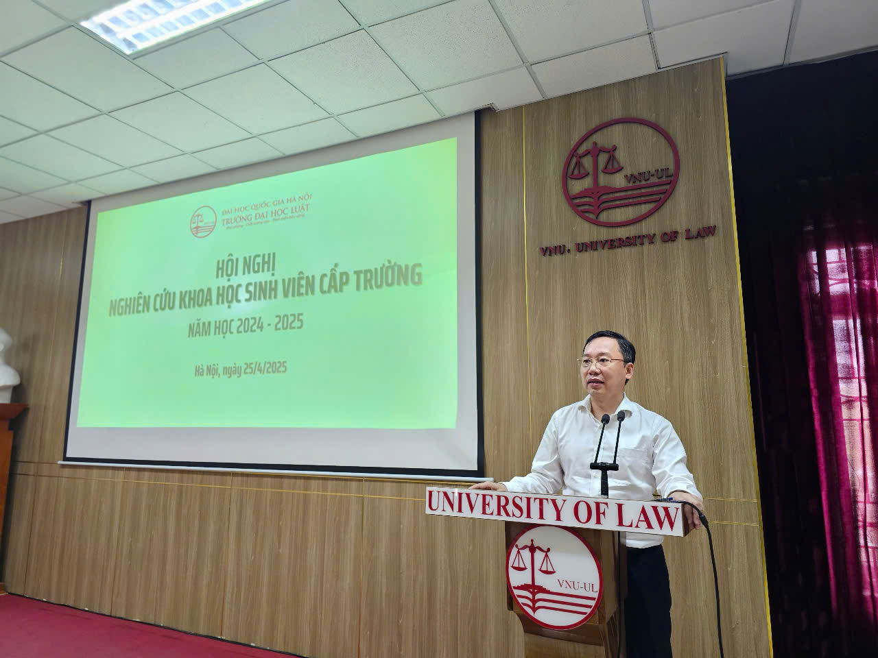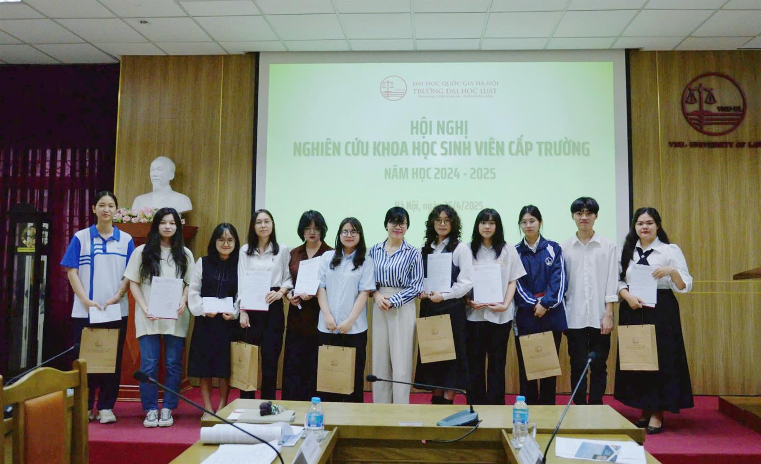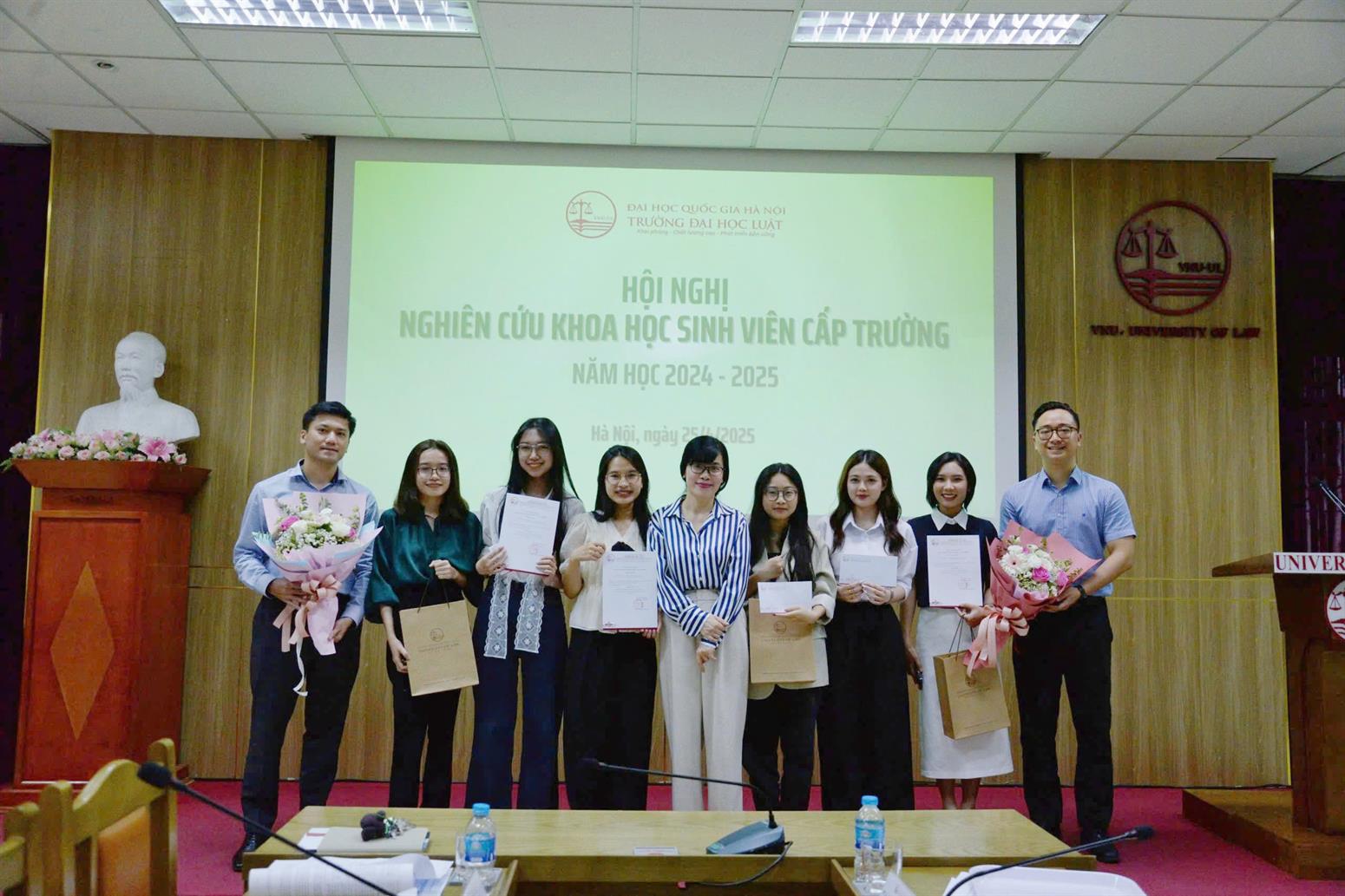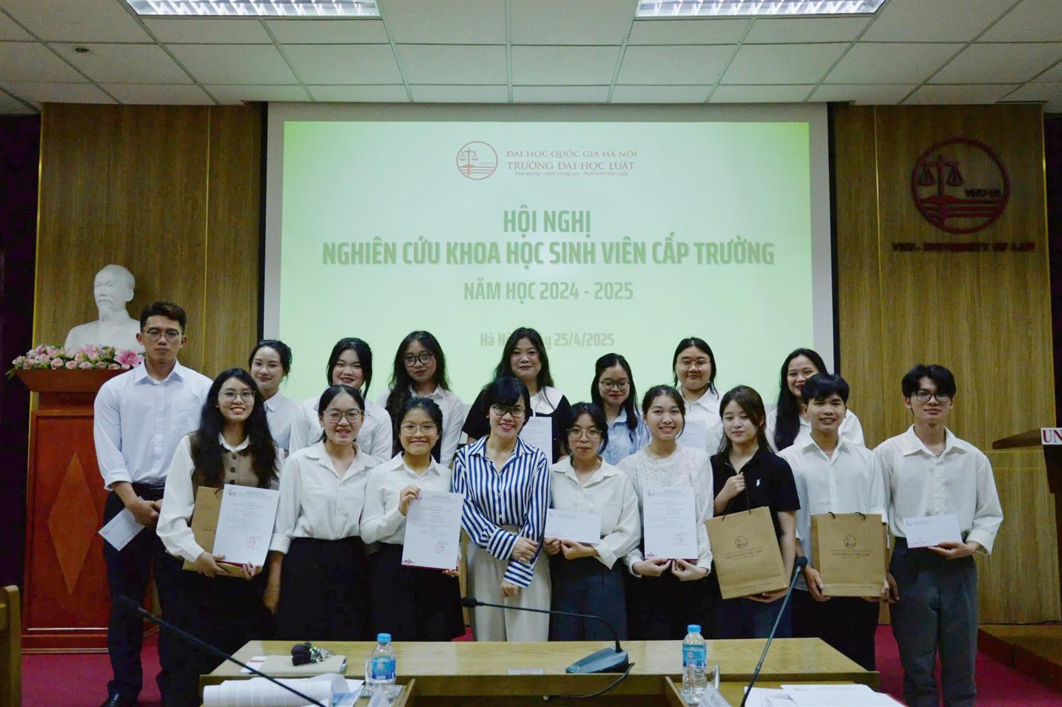 Ngày 25/4/2025, trong không khí học thuật sôi nổi, Trường Đại học Luật, Đại học Quốc gia Hà Nội (ĐHQGHN) long trọng tổ chức Hội nghị Nghiên cứu khoa học sinh viên (NCKHSV) cấp Trường năm học 2024-2025. Đây là hoạt động thường niên quan trọng, nhằm khuyến khích, thúc đẩy phong trào NCKH trong sinh viên, tạo diễn đàn để các em công bố kết quả nghiên cứu, trao đổi kiến thức và thể hiện niềm đam mê với khoa học pháp lý.