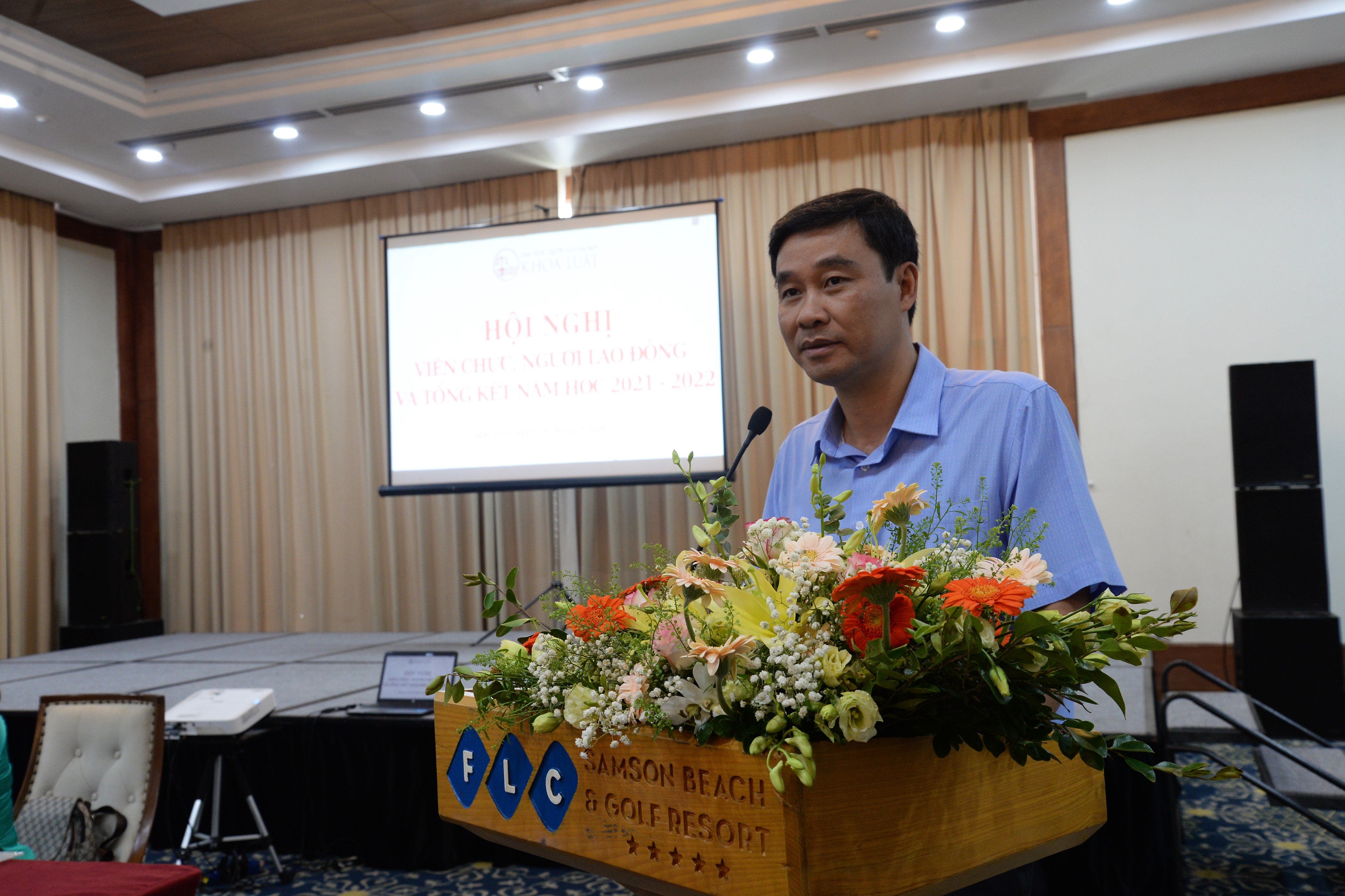 Trình bày Báo cáo tổng kết năm học 2021-2022 và kế hoạch nhiệm vụ năm học 2022 – 2023, đồng chí Trịnh Tiến Việt cho biết trong năm học vừa qua, Khoa Luật đã cụ thể hóa 4 nhóm nhiệm vụ trọng tâm bằng các chỉ đạo, hoạt động cụ thể ở 10 mảng công việc trong toàn Khoa. Cụ thể, đã hoàn thành kế hoạch tuyển sinh các hệ đào tạo năm 2021; Đẩy mạnh chuyển đổi số, hoàn thiện mô hình, phương thức đào tạo trực tuyến gắn với đảm bảo chất lượng; tăng cường kĩ năng xây dựng học liệu theo phương thức giảng dạy trực tuyến, giúp giảng viên chủ động hơn trong việc xây dựng, thiết kế bài giảng, nâng cao hiệu quả đào tạo; Đổi mới cấu trúc lại các chương trình đào tạo, gắn với kiểm định chất lượng và quản trị đại học, từ đó gia tăng khả năng thích ứng với các vấn đề thực tế của sinh viên, đồng thời giảm chi phí đào tạo của đơn vị; các đơn vị cần chú trọng và đẩy mạnh tiến độ kiểm định các chương trình đào tạo đại học và sau đại học. Ngoài ra, năm học qua Khoa đã cấp 79 suất học bổng loại A, 113 xuất học bổng lại B và 01 suất học bổng loại C (với chương trình đào tạo chuẩn); xét cấp11 suất học bổng loại A và 08 suất học bổng loại B (với CTĐT Chất lượng cao theo Thông tư 23) tổng số tiền đã cấp là 1.375.950.000 đồng; Xét miễn giảm học phí cho 125 lượt sinh viên; Cấp trợ cấp xã hội cho 30 lượt sinh viên hộ nghèo, sinh viên mồ côi cả cha lẫn mẹ, sinh viên dân tộc ít người ở vùng cao với tổng số tiền là 23.520.000 đồng; Cấp kinh phí hỗ trợ chi phí học tập cho 20 sinh viên diện dân tộc thiểu số thi đỗ đại học/dân tộc thiểu số rất ít người với tổng số tiền là 98.340.000 đồng. Khoa cũng trao các suất học bổng từ các đối tác của Khoa như: 05 suất học bổng cho sinh viên có thành tích học tập và rèn luyện xuất sắc, mỗi suất trị giá 10 triệu đồng (tổng số tiền 50 triệu đồng) từ Tổng Công ty Đầu tư và Kinh doanh vốn nhà nước (SCIC); 06 suất học bổng, tổng trị giá 30 triệu đồng từ Ngân hàng BIDV; tài trợ 01 suất cho 01 sinh viên K65 hệ CLC-23, trị giá 35 triệu đồng của Công ty Jardine Cycle & Carriage; 02 suất với tổng trị giá hơn 24 triệu đồng của Công ty Luật Taeil, Hàn Quốc; 02 suất học bổng tham gia Sáng kiến Hỗ trợ sinh viên (DynaGen Initiative) của Quỹ Vì Tầm Vóc Việt. Ngoài ra, Khoa có 02 sinh viên được xét chọn đi trao đổi tại Thụy Sĩ. Đặc biệt, trong năm học 2021 – 2022 với sự ảnh hưởng nặng nề của dịch bệnh Covid-19 năm thứ 2, Khoa Luật đã thực hiện xã hội hóa các nguồn tài trợ, nguồn kinh phí của đơn vị để hỗ trợ cho 72 sinh viên tại hai khu KTX Mỹ Đình và KTX Ngoại Ngữ ở lại Hà Nội, tổng số tiền hỗ trợ là 36.000.000 triệu đồng.