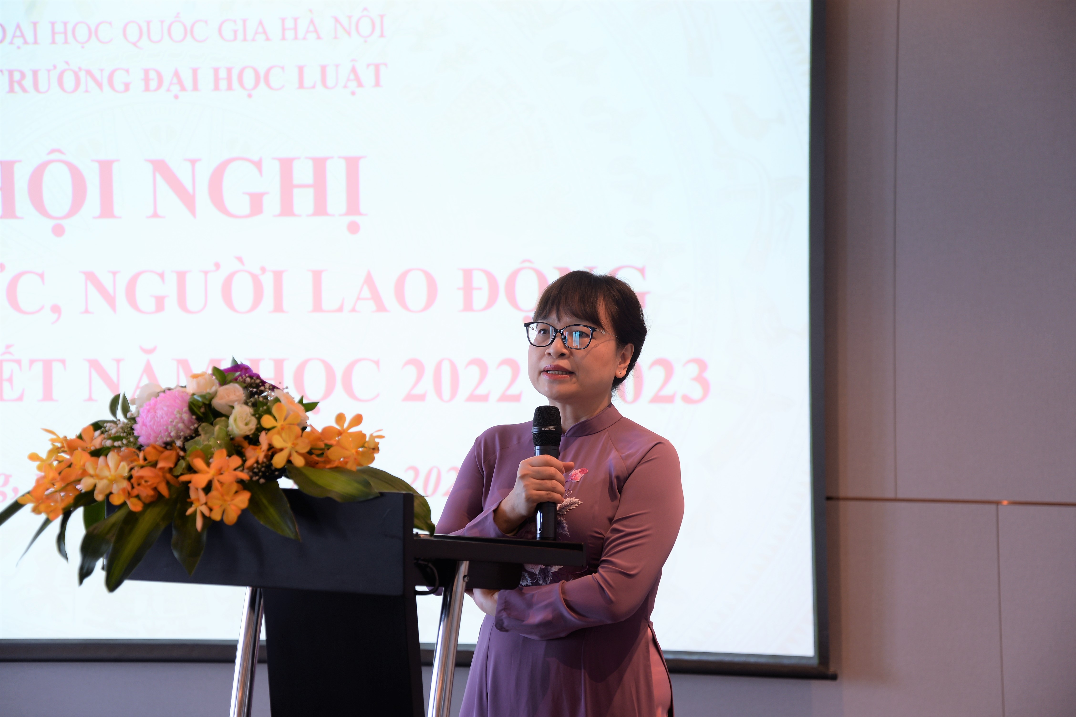 Phát biểu khai mạc, đồng chí Nguyễn Thị Quế Anh cho biết, năm học 2022 – 2023 là một năm học đáng nhớ đối với tập thể viên chức, người lao động và người học của Trường Đại học Luật, ĐHQGHN. Trong năm học này, Thủ tướng Chính phủ đã ký ban hành Quyết định số 1124/QĐ-TTg về việc thành lập Trường Đại học Luật là trường thành viên của ĐHQGHN trên cơ sở Khoa Luật trực thuộc ĐHQGHN. Đây là bước ngoặt lớn, đánh dấu mốc lịch sử trong quá trình xây dựng và phát triển của Trường Đại học Luật, làm cơ sở cho việc thực hiện thành công mục tiêu trở thành cơ sở đào tạo và nghiên cứu luật học hàng đầu Việt Nam. Để có được sự thành công đó, đồng chí nhấn mạnh sự hỗ trợ, tạo điều kiện của Lãnh đạo ĐHQGHN và các Ban của ĐHQGHN cùng với đó là sự nỗ lực của tất cả viên chức, người lao động trong toàn Trường. Đồng chí Nguyễn Thị Quế Anh cũng nhấn mạnh, với tư cách mới, chúng ta sẽ có nhiều thay đổi trong hoạt động, tổ chức để từng bước phát triển thành trường tự chủ tài chính. Chính vì vậy đồng chí hi vọng, Hội nghị này sẽ là diễn đàn để các đại biểu đóng góp ý kiến về hiệu quả hoạt động trong năm học vừa qua và cùng gợp ý về hướng phát triển trong thời gian tới.
