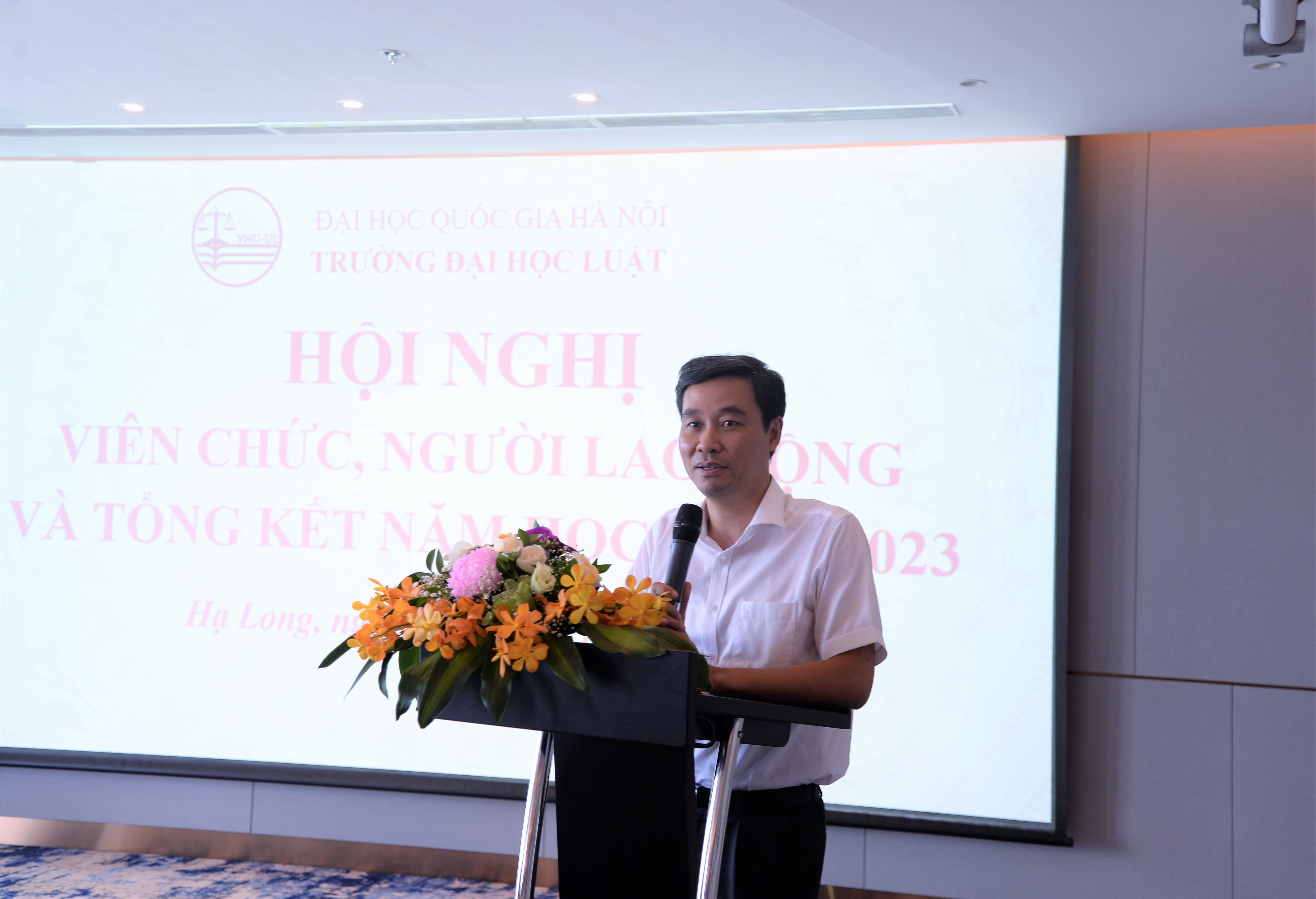 Trình bày Báo cáo tổng kết năm học 2022 – 2023 và kế hoạch nhiệm vụ năm học 2023 – 2024, đồng chí Trịnh Tiến Việt cho biết trong năm học vừa qua, Khoa Luật (nay là Trường Đại học Luật) đã cụ thể hóa 5 nhóm nhiệm vụ trọng tâm bằng các chỉ đạo, hoạt động cụ thể ở 10 mảng công việc trong toàn Trường. Cụ thể, Trường đã triển khai rà soát, chỉnh sửa và ban hành các văn bản, quy định theo các nhiệm vụ, công việc phù hợp với bối cảnh mới của Trường; Đã hoàn thành kế hoạch tuyển sinh các hệ đào tạo năm 2022; Tổ chức thành công đánh giá chất lượng CTĐT Thạc sĩ Luật Hình sự và Tố tụng Hình sự theo Bộ tiêu chuẩn kiểm định chất lượng của AUN-QA vào tháng 3/2023 đạt 4,3 điểm, và tháng 8/2023 Trường tiếp tục triển khai, chuẩn bị các điều kiện có liên quan để tổ chức đánh giá ngoài CTĐT Thạc sĩ Luật Kinh tế theo Bộ tiêu chuẩn này; Tổ chức thành công Diễn đàn Luật học Mùa thu (VNU-UL Autumn Law Forum-VALF) lần thứ hai với chủ đề “Pháp luật Việt Nam – Hội nhập và phát triển”, Hội nghị thường niên của Hiệp hội Pháp luật xã hội và Châu Á năm 2022 với chủ đề “Pháp luật và Xã hội Châu Á: Toàn cầu hóa, Công nghệ và Sự bất định”; Công bố 31 bài trong các tạp chí quốc tế uy tín thuộc danh mục ISI/Scopus; Đẩy mạnh chuyển đổi số, hoàn thiện phần mềm “Cổng thông tin khoa học và hệ thống cổng thông tin điện tử hỗ trợ thủ tục hành chính trực tuyến một cửa cho sinh viên; Đã và đang đảm nhận biên soạn 17 giáo trình/sách chuyên khảo và đã xuất bản được 03 giáo trình và 14 sách chuyên khảo, xuất bản được 01 sách chuyên khảo tại nhà xuất bản quốc tế uy tín (Nhà xuất bản Palgrave Macmillan (Springer, Singapore) với 02 tác giả của Trường tham gia, trong đó 01 là đồng chủ biên.
