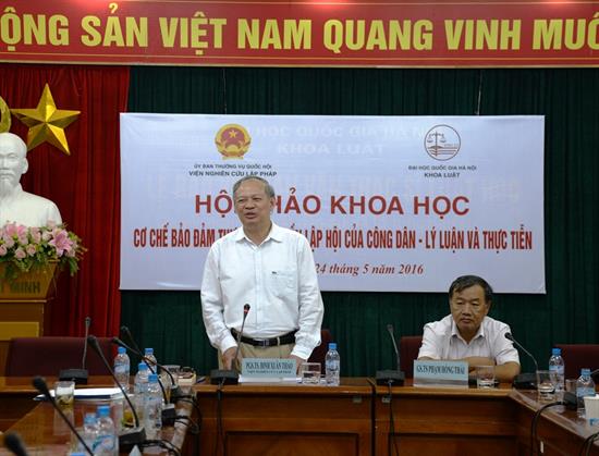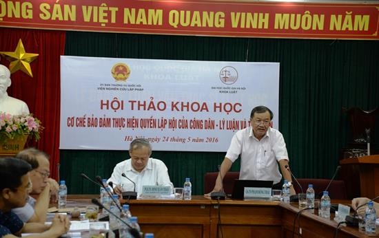 Nhằm triển khai Thỏa thuận hợp tác đã ký kết giữa Viện Nghiên cứu Lập pháp thuộc Ủy ban Thường vụ Quốc hội và Khoa Luật, Đại học Quốc gia Hà Nội. Với mong muốn tiếp thu được nhiều những ý kiến, đóng góp quý báu của các nhà khoa học góp phần hoàn thiện Dự thảo Luật về Hội đang được Quốc hội đưa ra lấy ý kiến. Ngày 24/5/2016, Khoa Luật, ĐHQGHN phối hợp với Viện Nghiên cứu Lập pháp tổ chức Hội thảo “Cơ chế đảm bảo thực hiện quyền lập hội của công dân – Lý luận và thực tiễn”.