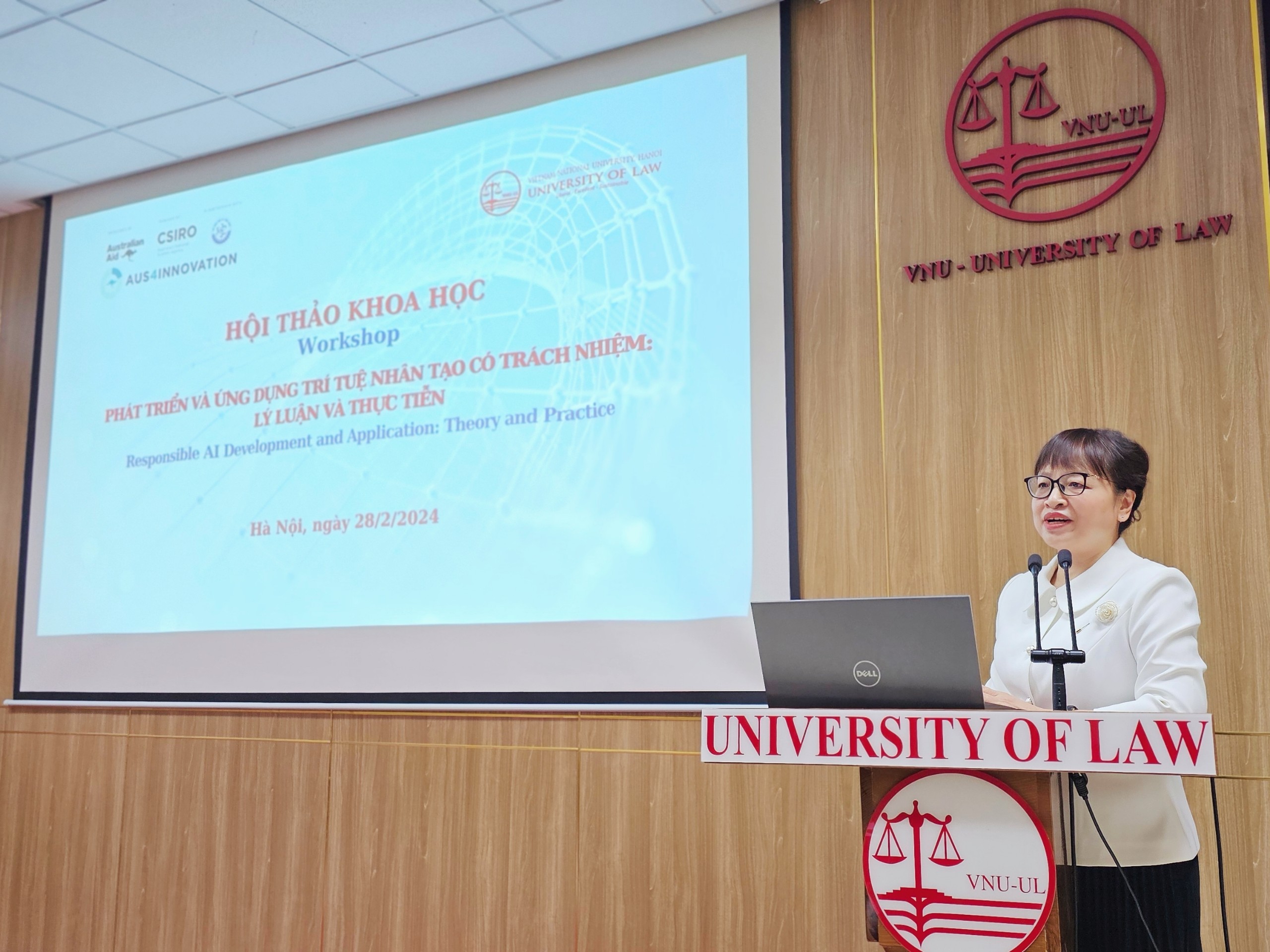 Sáng ngày 28/02/2024, Trường Đại học Luật, ĐHQGHN tổ chức Hội thảo khoa học “Phát triển và ứng dụng trí tuệ nhân tạo có trách nhiệm: lý luận và thực tiễn”. Hội thảo nằm trong khuôn khổ Dự án nghiên cứu xây dựng Bộ nguyên tắc và một số hướng dẫn cho phát triển Trí tuệ nhân tạo (TTNT) có trách nhiệm ở Việt Nam trên cơ sở hỗ trợ của Chương trình Aus4Innovation – chương trình hỗ trợ phát triển của Chính phủ Úc nhằm thúc đẩy hệ sinh thái đổi mới sáng tạo tại Việt Nam. Hội thảo do PGS. TS. Bùi Thế Duy, Thứ trưởng Bộ Khoa học và Công nghệ và PGS. TS. Nguyễn Thị Quế Anh, Hiệu trưởng Trường Đại học Luật ĐHQGHN đồng chủ trì. Tham dự Hội thảo có PGS. TS. Phạm Bảo Sơn, Phó Giám đốc ĐHQGHN và đại diện lãnh đạo các ban và các đơn vị trong ĐHQGHN; TS. Kim Wimbush, Tham tán Cơ quan nghiên cứu khoa học và công nghệ của Australia CSIRO, Giám đốc Chương trình Aus4Innovation. Hội thảo còn có sự tham gia đông đảo của đại diện các cơ quan quản lý nhà nước như Bộ Khoa học và Công nghệ (Vụ Công nghệ cao, Vụ Pháp chế), Bộ Tư pháp (Vụ Pháp luật dân sự – kinh tế, Viện Chiến lược và Khoa học pháp lý), Bộ Thông tin và Truyền thông (Cục Công nghiệp công nghệ thông tin và truyền thông), Bộ Y tế (Vụ Pháp chế), các cơ sở đào tạo, nghiên cứu trong lĩnh vực chính sách, pháp luật và công nghệ thông tin, truyền thông (Trường Đại học Luật ĐHQGHN, Trường Đại học Công nghệ ĐHQGHN, Trường Đại học Kinh tế ĐHQGHN, Viện Công nghệ thông tin ĐHQGHN, Học viện Kỹ thuật mật mã, Trường Đại học Luật Hà Nội, Viện Nhà nước và Pháp luật – Viện Hàn lâm Khoa học xã hội Việt Nam, Viện Nghiên cứu chính sách và phát triển truyền thông thuộc Hội truyền thông số Việt Nam, Trường Đại học Anh quốc – Việt Nam, Trường Đại học Đại Nam…), đại diện UNESCO tại Việt Nam.