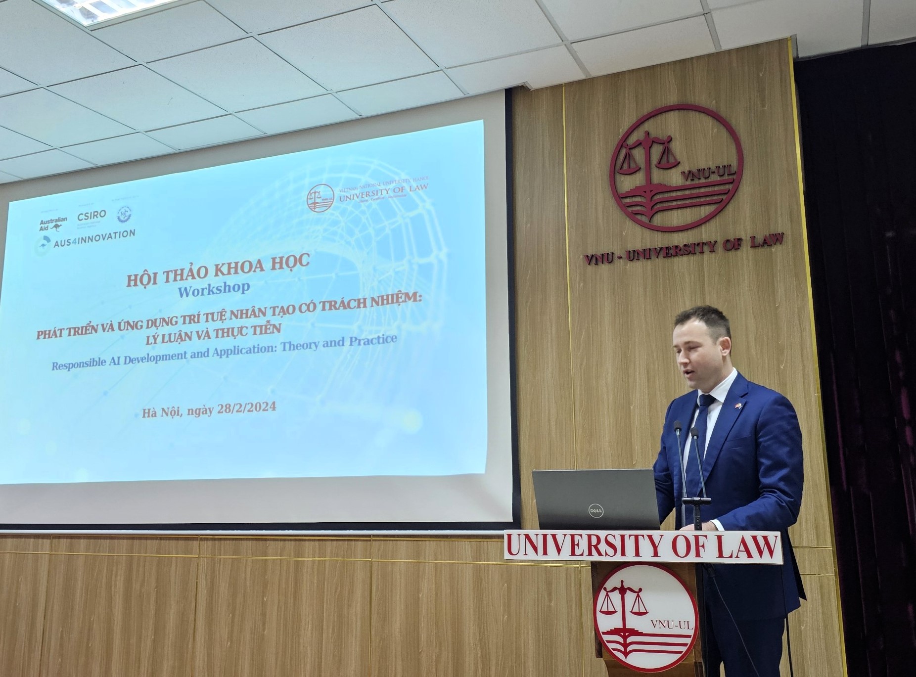 Phát biểu khai mạc hội thảo, Thứ trưởng Bùi Thế Duy và TS. Kim Wimbush (Tham tán CSIRO, Giám đốc Chương trình Aus4Innovation) đều nhấn mạnh TTNT có trách nhiệm đang là vấn đề nghị sự toàn cầu, thu hút sự quan tâm của các quốc gia trên thế giới trong bối cảnh TTNT đang phát triển với tốc độ nhanh chóng và đặt ra nhiều thách thức, rủi ro về đạo đức, xã hội, pháp lý. TTNT có trách nhiệm là vấn đề mang tính liên ngành, giao thoa giữa ba lĩnh vực: công nghệ, luật, và quản lý, đòi hỏi sự chung tay, vào cuộc của tất cả các bên liên quan. Trên thế giới, trong vài năm trở lại đây, đã có nhiều nỗ lực nhằm phát triển khung pháp lý và đạo đức để quản lý, kiểm soát TTNT và thúc đẩy TTNT có trách nhiệm như UNESCO đã ban hành Khuyến nghị về các nguyên tắc đạo đức của TTNT (2021), Khung đánh giá độ sẵn sàng của các quốc gia trong việc thực thi Khuyến nghị của UNESCO (2022), Liên minh châu Âu ban hành Đạo luật về TTNT (2023), các nước ASEAN mới đây ban hành khuôn khổ chung về quản trị TTNT (2023), Australia công bố Khung nguyên tắc về TTNT có trách nhiệm (2019), và Trung Quốc trong năm 2023 cũng đã có bước phát triển nhanh chóng với Hướng dẫn về tiêu chuẩn quản trị TTNT có đạo đức. TTNT có trách nhiệm phải được xem xét toàn diện trong toàn bộ vòng đời, quy trình phát triển của nó ở tất cả các khâu, từ khâu xác định bài toán, thu thập dữ liệu, đến công cụ huấn luyện, và ứng dụng TTNT. Thế giới hiện nay đang tương đối thống nhất về các nguyên tắc cơ bản của TTNT có trách nhiệm, đó là: (1) TTNT phải vì con người, không gây hại cho con người, (2) TTNT phải đảm bảo thực hiện đúng như mục tiêu thiết kế đề ra, (3) An toàn và bảo mật, (4) Bình đẳng, công bằng, (5) Bảo vệ dữ liệu cá nhân và bảo hộ quyền tác giả, (6) Minh bạch và giải thích được.