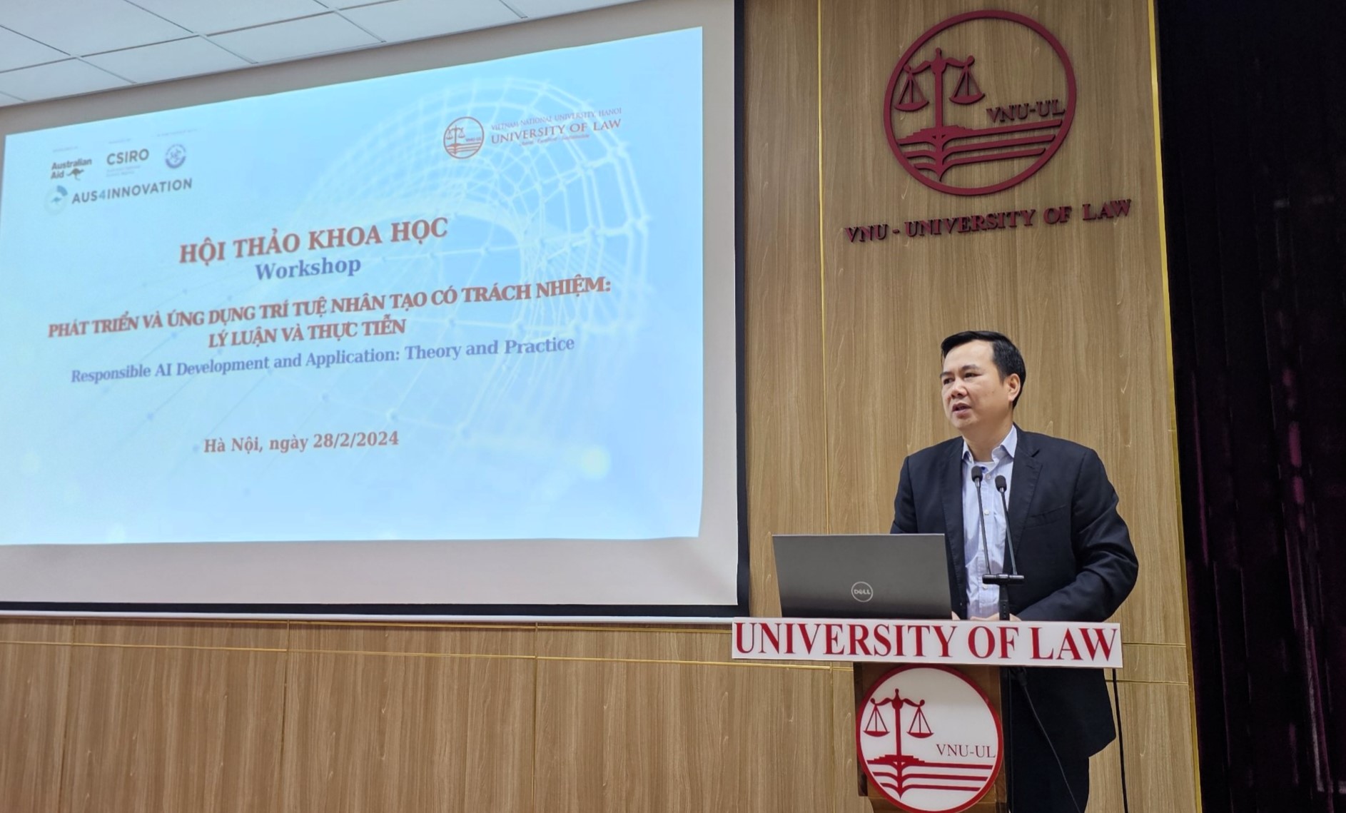Sáng ngày 28/02/2024, Trường Đại học Luật, ĐHQGHN tổ chức Hội thảo khoa học “Phát triển và ứng dụng trí tuệ nhân tạo có trách nhiệm: lý luận và thực tiễn”. Hội thảo nằm trong khuôn khổ Dự án nghiên cứu xây dựng Bộ nguyên tắc và một số hướng dẫn cho phát triển Trí tuệ nhân tạo (TTNT) có trách nhiệm ở Việt Nam trên cơ sở hỗ trợ của Chương trình Aus4Innovation – chương trình hỗ trợ phát triển của Chính phủ Úc nhằm thúc đẩy hệ sinh thái đổi mới sáng tạo tại Việt Nam. Hội thảo do PGS. TS. Bùi Thế Duy, Thứ trưởng Bộ Khoa học và Công nghệ và PGS. TS. Nguyễn Thị Quế Anh, Hiệu trưởng Trường Đại học Luật ĐHQGHN đồng chủ trì. Tham dự Hội thảo có PGS. TS. Phạm Bảo Sơn, Phó Giám đốc ĐHQGHN và đại diện lãnh đạo các ban và các đơn vị trong ĐHQGHN; TS. Kim Wimbush, Tham tán Cơ quan nghiên cứu khoa học và công nghệ của Australia CSIRO, Giám đốc Chương trình Aus4Innovation. Hội thảo còn có sự tham gia đông đảo của đại diện các cơ quan quản lý nhà nước như Bộ Khoa học và Công nghệ (Vụ Công nghệ cao, Vụ Pháp chế), Bộ Tư pháp (Vụ Pháp luật dân sự – kinh tế, Viện Chiến lược và Khoa học pháp lý), Bộ Thông tin và Truyền thông (Cục Công nghiệp công nghệ thông tin và truyền thông), Bộ Y tế (Vụ Pháp chế), các cơ sở đào tạo, nghiên cứu trong lĩnh vực chính sách, pháp luật và công nghệ thông tin, truyền thông (Trường Đại học Luật ĐHQGHN, Trường Đại học Công nghệ ĐHQGHN, Trường Đại học Kinh tế ĐHQGHN, Viện Công nghệ thông tin ĐHQGHN, Học viện Kỹ thuật mật mã, Trường Đại học Luật Hà Nội, Viện Nhà nước và Pháp luật – Viện Hàn lâm Khoa học xã hội Việt Nam, Viện Nghiên cứu chính sách và phát triển truyền thông thuộc Hội truyền thông số Việt Nam, Trường Đại học Anh quốc – Việt Nam, Trường Đại học Đại Nam…), đại diện UNESCO tại Việt Nam.