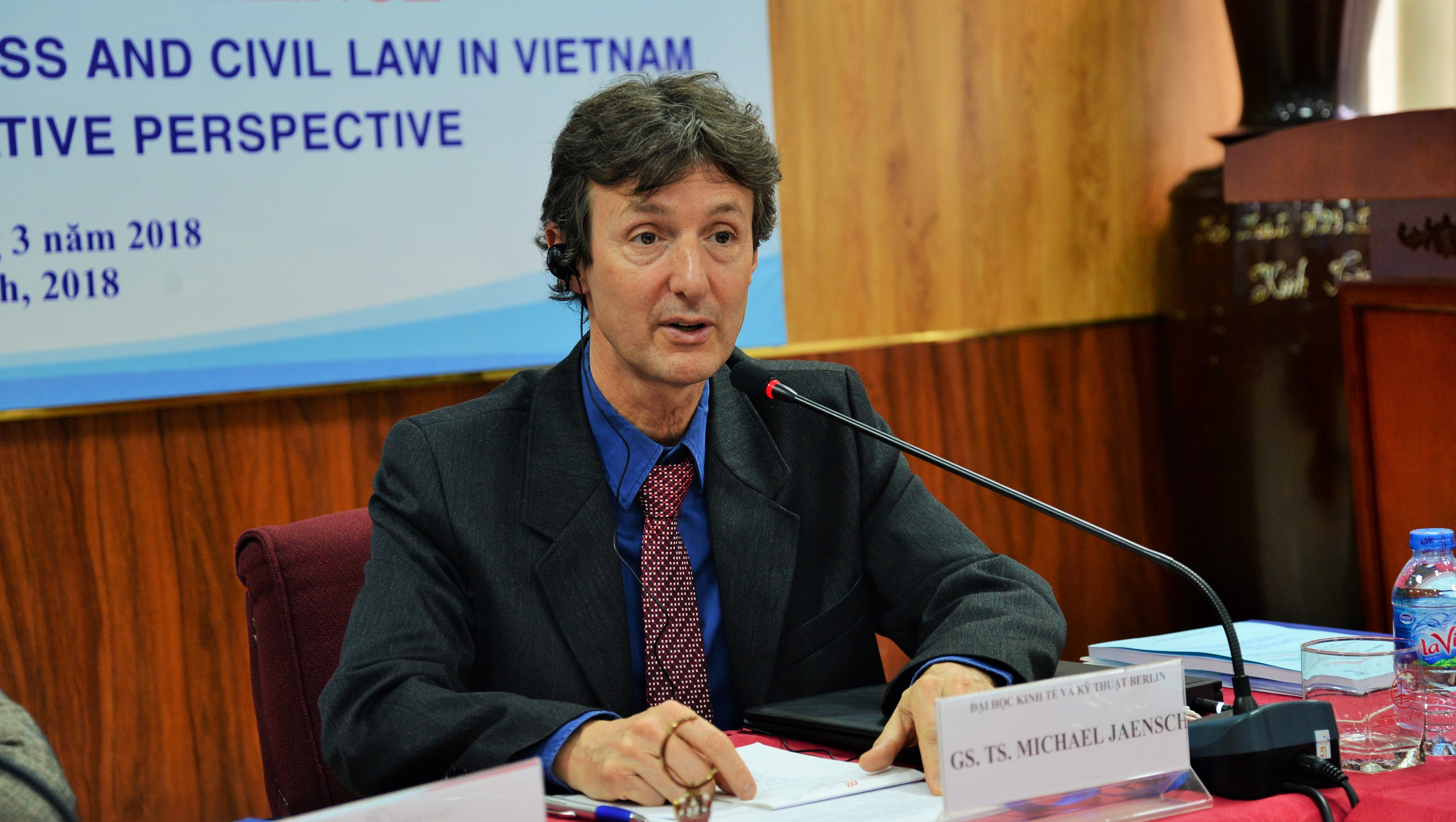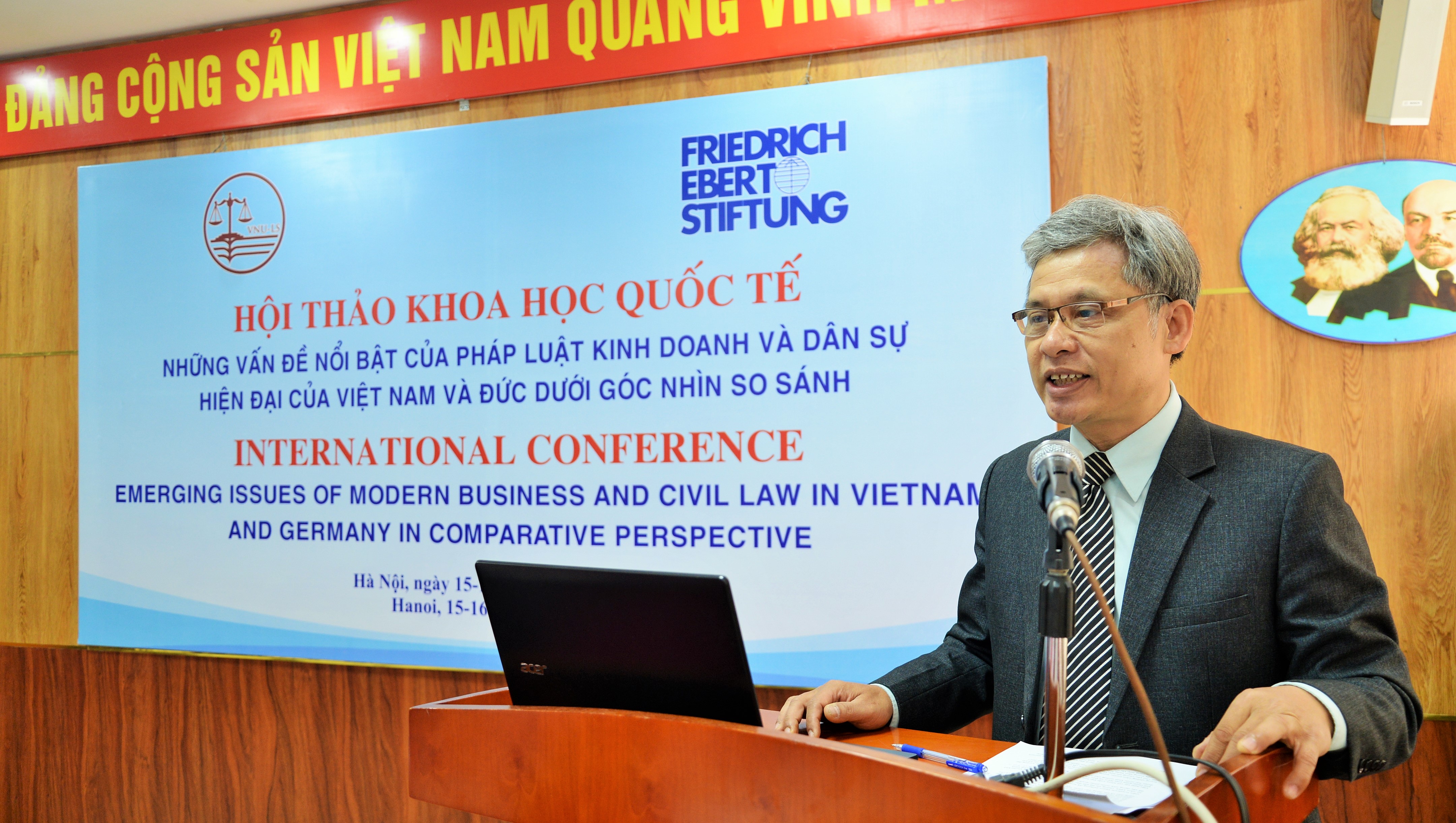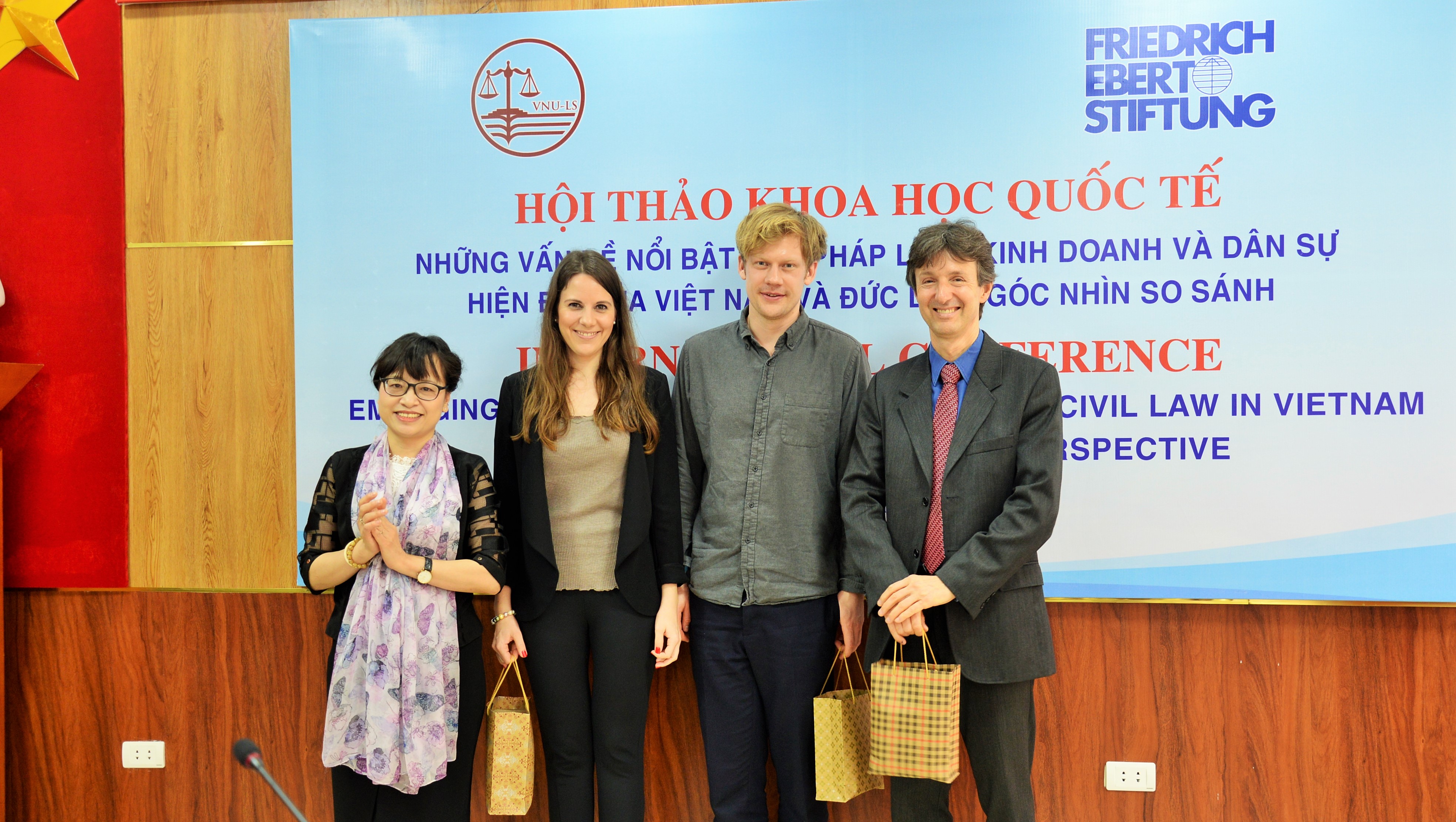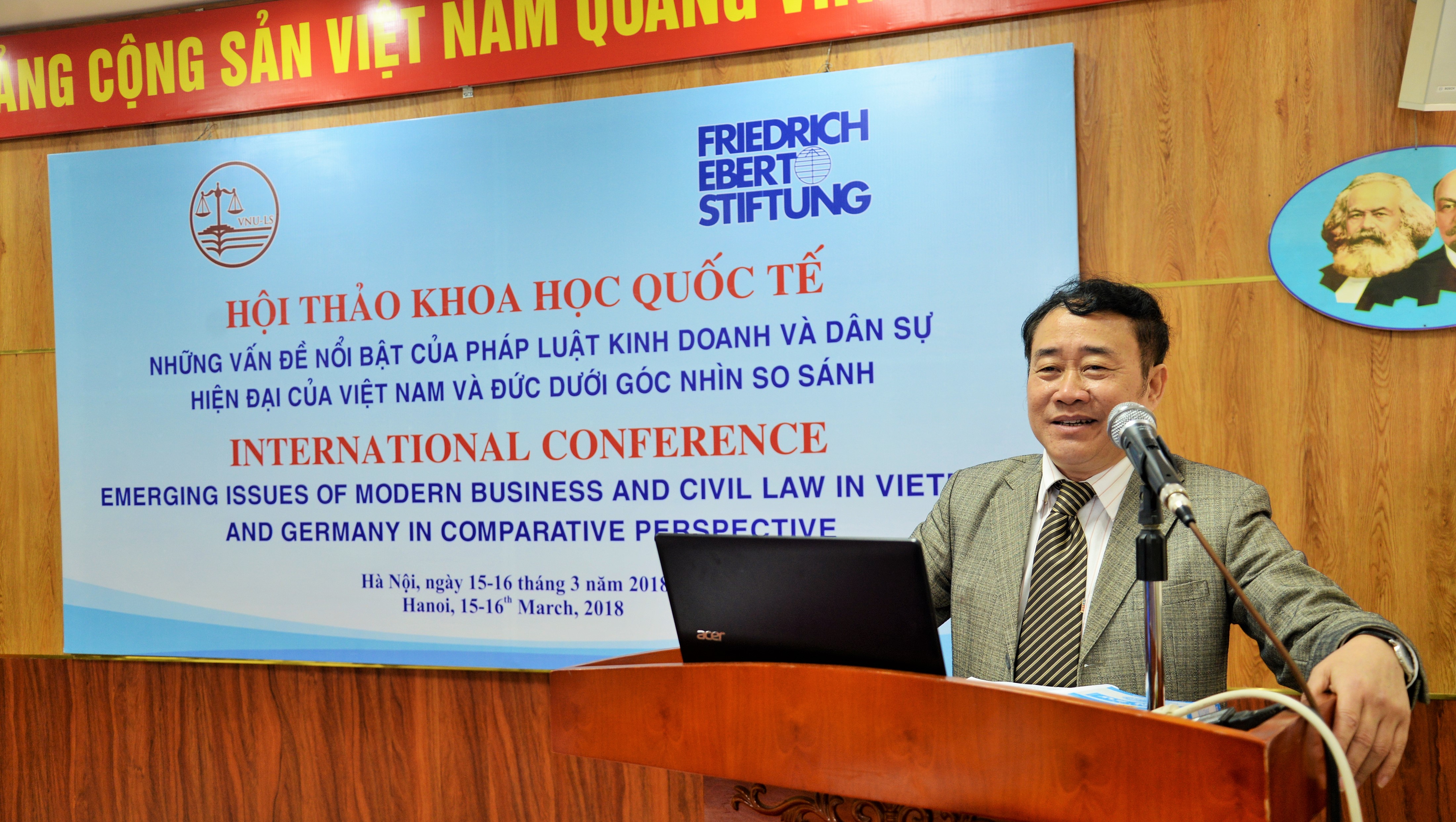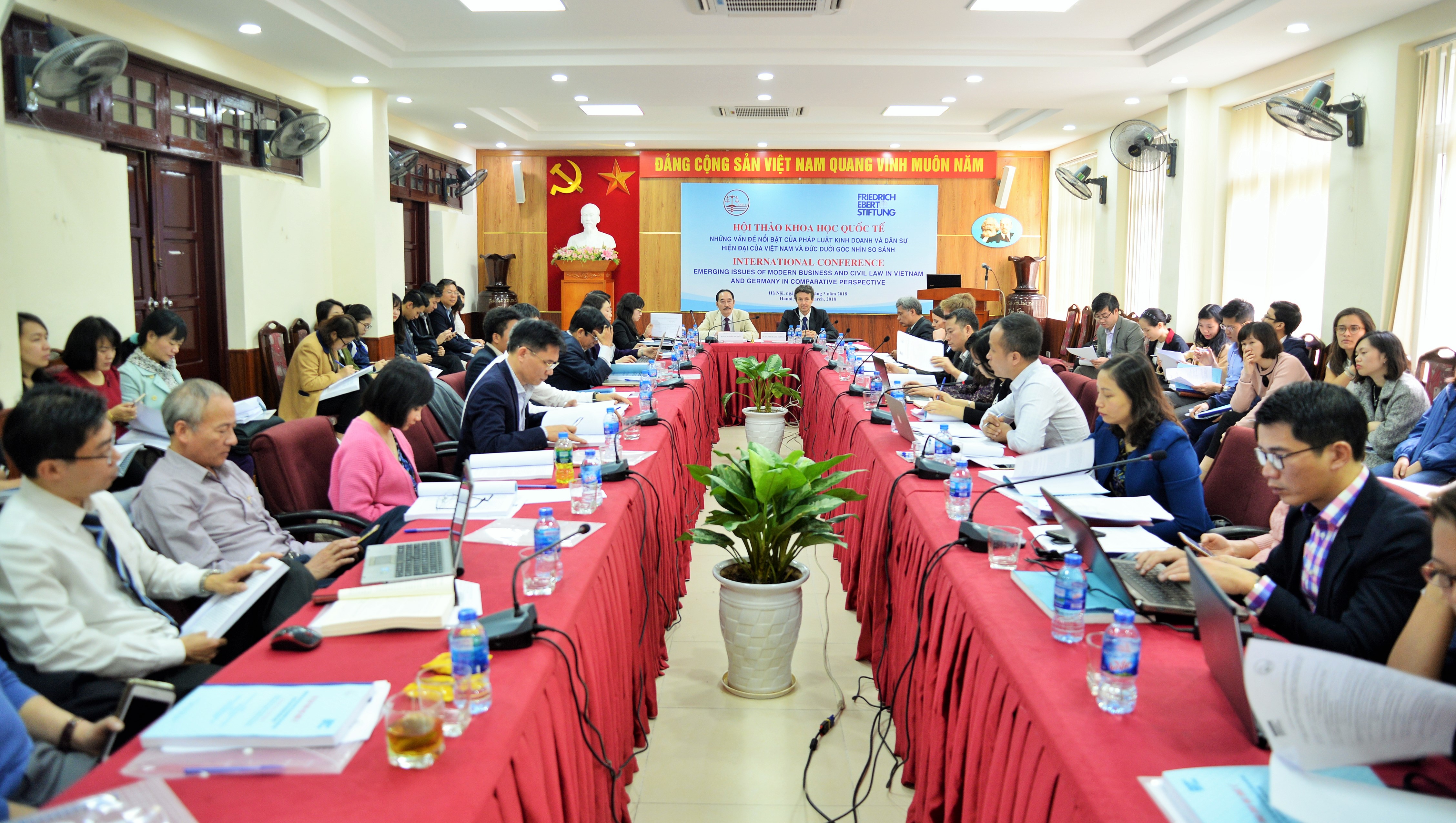 Tham dự Hội thảo có Ông Tiêu Dũng Tiến – Phó Trưởng đại diện FES tại Việt Nam, GS.TS. Michael Jaesch – Đại học Kinh tế và Kỹ thuật Berlin, TS. Sina Fontana – Đại học Goetingen, Ông Louis Rolfes – Đại học Tổng hợp Humboldt Berlin, PGS.TS. Nguyễn Như Phát – Viện Nhà nước và Pháp luật (NN&PL), PGS.TS. Bùi Nguyên Khánh – Phó Giám đốc Học viện Khoa học Xã hội, GS.TS. Lê Hồng Hạnh – Viện trưởng Viện nghiên cứu ASEAN, PGS.TS. Nguyễn Đức Minh – Viện trưởng Viện NN&PL, Ông Phan Đức Hiếu, Phó Viện trưởng Viện nghiên cứu và quản lý kinh tế Trung Ương, TS. Đặng Vũ Huân – Tổng Biên tập Tạp chí NN&PL. Về phía Khoa Luật có PGS.TS. Nguyễn Thị Quế Anh – Phó Chủ nhiệm phụ trách Khoa, PGS.TS. Ngô Huy Cương – Chủ nhiệm Bộ môn Luật Dân sự, PGS.TS. Lê Thị Hoài Thu – Quyền Chủ nhiệm Bộ môn Luật Kinh doanh, TS. Phan Thị Thanh Thủy – Phụ trách Phòng NCKH&HTPT cùng các học giả đến từ trong và ngoài Khoa Luật và các nghiên cứu sinh, học viên và sinh viên của Khoa.