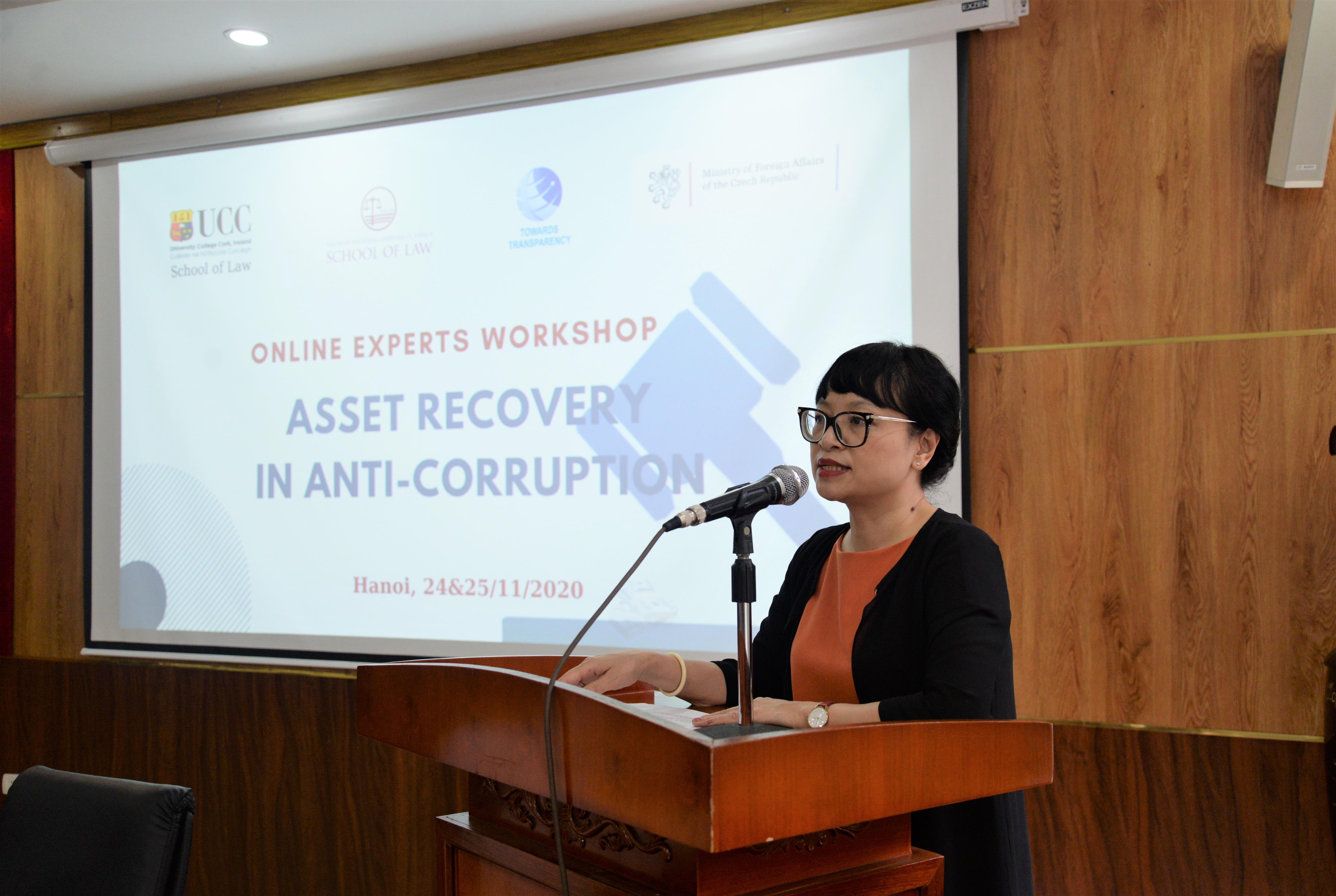 Phát biểu khai mạc tại Hội thảo, PGS.TS. Nguyễn Thị Quế Anh nhấn mạnh Hội thảo là cơ hội cho các chuyên gia và các nhà quản lý chia sẻ tri thức, thông tin và thảo luận các vẫn đề xoay quanh việc thu hồi tài sản tham nhũng. Đây là một yêu cầu và biện pháp đặc biệt quan trọng trong phòng, chống tham nhũng, bởi nó tác động trực tiếp, làm triệt tiêu động lực của kẻ tham nhũng là thu lợi riêng từ việc lạm dụng quyền lực được giao. PGS cho biết cho đến nay thu hồi tài sản tham nhũng là việc rất phức tạp, khó khăn, khi mà những kẻ tham nhũng lớn thường đồng thời có chức vụ, quyền hạn lớn, có rất nhiều thủ đoạn, mánh khoé, và có rất nhiều cách thức che giấu, tẩu tán tài sản trong bối cảnh toàn cầu hoá. PGS hi vọng với chủ đề mang tính thời sự, hấp dẫn, có ý nghĩa sâu sắc cả về lý luận và thực tiễn, hội thảo này và với sự tham gia nhiệt tình của các đại biểu tham gia thì Hội thảo sẽ thành công tốt đẹp. PGS cũng gửi lời cám ơn sự hỗ trợ, ủng hộ từ nhiều tổ chức quốc tế như UNDP, WB, Tổ chức Minh bạch Quốc tế, Mạng lưới Đối tác Chính phủ mở và nhiều quốc gia như Ailen, Canada, Pháp, CH Séc, Trung Quốc, Indonesia, Việt Nam đã nhiệt tình tham dự và dành thời gian viết bài tham luận để chia sẻ với các đại biểu tham gia hội thảo này những kiến thức và kinh nghiệm quý báu về thu hồi tài sản tham nhũng.