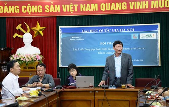 Khai mạc Hội thảo, PGS. TS. Ngô Huy Cương – Trưởng Bộ môn Luật Dân sự đã khẳng định: Trong những năm gần đây, số lượng học viên cao học, nghiên cứu sinh mong muốn nghiên cứu chuyên sâu về Luật dân sự – Tố tụng dân sự ngày càng tăng. Trong số đó, không chỉ có các giảng viên, nghiên cứu viên, cán bộ công tác tại những cơ quan như Văn phòng Quốc hội, Văn phòng Chủ tịch nước, Văn phòng Chính phủ, Văn phòng Trung ương Đảng, các cơ quan ở Trung ương, Hội đồng nhân dân và Ủy ban nhân dân các cấp mà còn bao gồm các luật gia, luật sư đang làm việc tại các công ty, văn phòng luật, các doanh nghiệp nhà nước và tư nhân. Điều đó cho thấy xã hội đang có nhu cầu thực sự và ngày càng lớn về những chuyên gia có chuyên môn sâu trong lĩnh vực Luật dân sự – Tố tụng dân sự. Chương trình tiến sĩ Luật dân sự – Tố tụng dân sự của Khoa Luật, ĐHQGHN sẽ góp phần đáp ứng nhu cầu nhân lực đó.