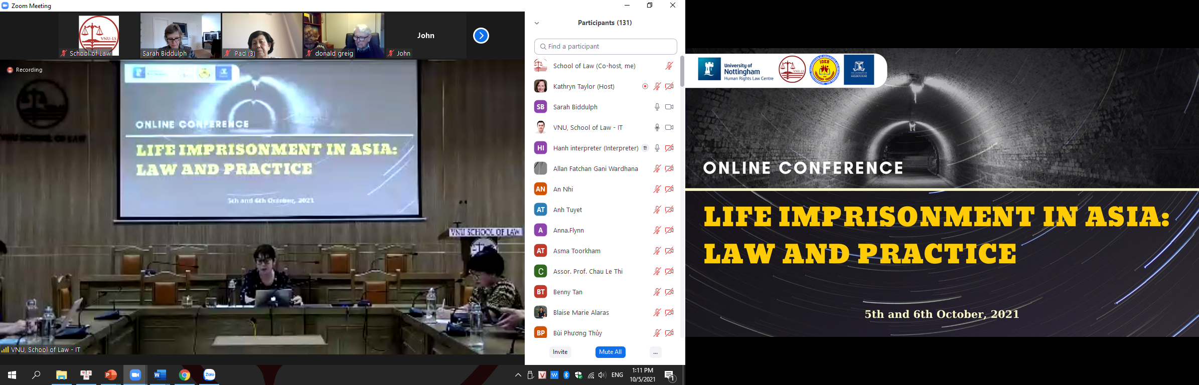 Ngày 05/10/2021, Khoa Luật, Đại học Quốc gia Hà Nội (ĐHQGHN) phối hợp cùng với Trung tâm Luật châu Á, Trường Luật ĐH Melbourne, Trường Luật, Đại học Nottingham, Vương quốc Anh, và Tổ chức quốc tế các nhà nghiên cứu và giáo dục (IOER) tổ chức Hội thảo quốc tế “Hình phạt tù chung thân tại Châu Á: Pháp luật và thực tiễn”. Hội thảo được tổ chức dưới hình thức trực tiếp và trực tuyến.