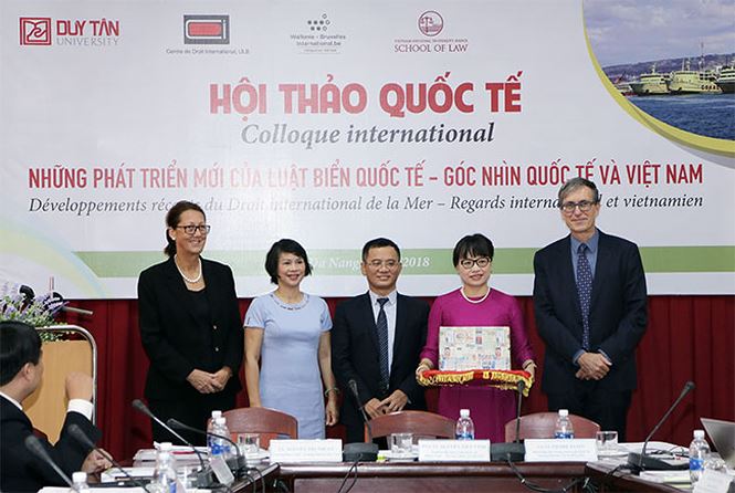 Chủ trì Hội thảo có GS.TS. Pierre Klein – Phó Giám đốc Trung tâm Luật Quốc tế, Đại học Tự do Vương Quốc Bỉ, PGS.TS. Nguyễn Tiến Vinh – Quyền Chủ nhiệm Bộ môn Luật Quốc tế Khoa Luật, ĐHQGHN và TS. Nguyễn Thị Thuận – Trưởng Khoa Luật, Trường Đại học Duy Tân.