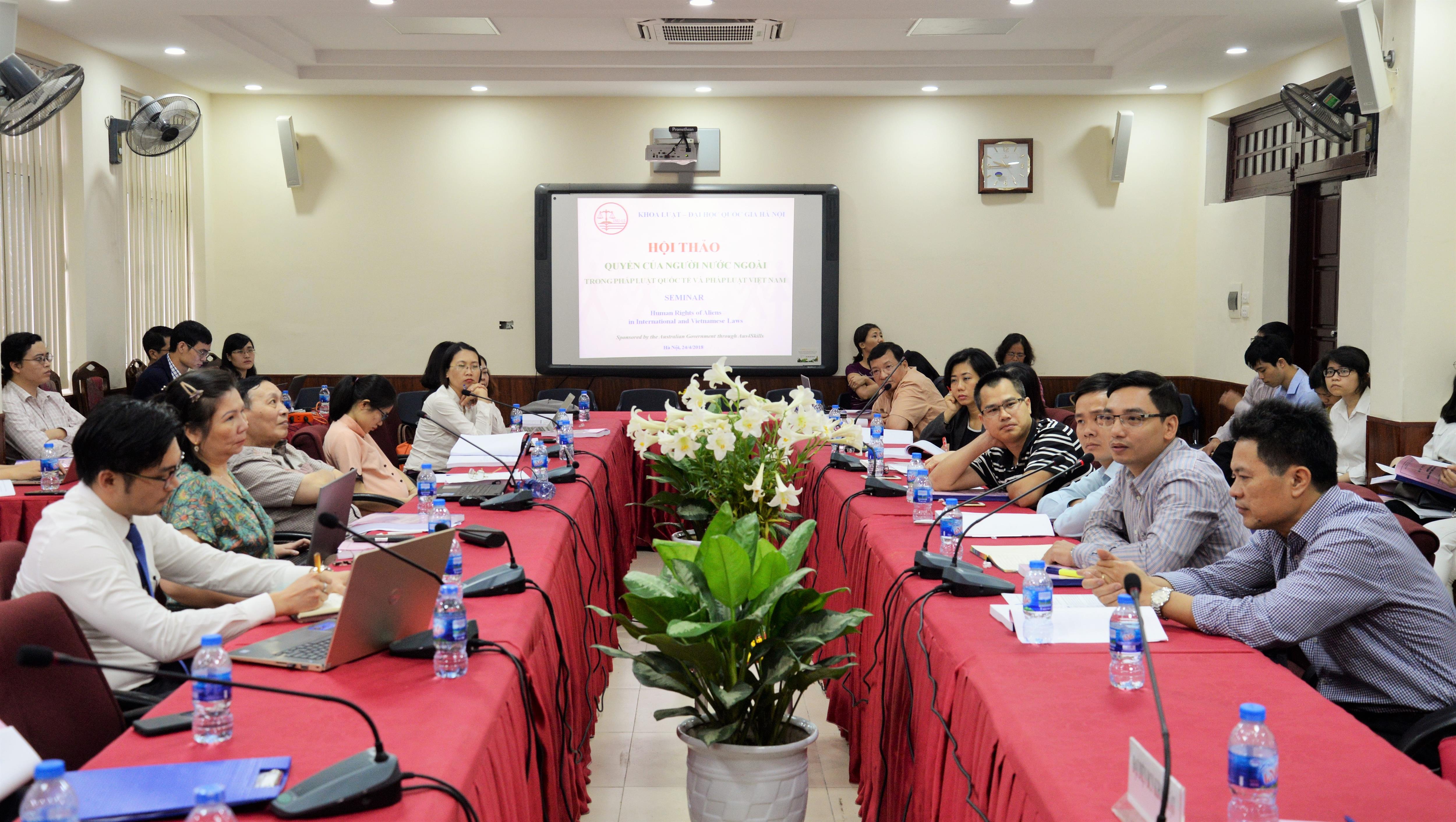 Ngày 24/4/2018, Khoa Luật, Đại học Quốc gia Hà Nội (ĐHQGHN) tổ chức Hội thảo “Quyền của người nước ngoài trong pháp luật quốc tế và pháp luật Việt Nam”. Tham dự Hội thảo có Bà Đàm Thị Phương Thảo – Phó Giám đốc Chương trình Aus4skills; Về phía Khoa Luật có PGS.TS. Trịnh Tiến Việt – Phó Chủ nhiệm Khoa, GS.TS. Phạm Hồng Thái – Nguyên Chủ nhiệm Khoa, GS.TS. Nguyễn Đăng Dung – Nguyên Phó Chủ nhiệm Khoa, GS.TS. Hoàng Thị Kim Quế – Nguyên Phó Chủ nhiệm Khoa, PGS.TS. Vũ Công Giao – Chủ nhiệm Bộ môn Luật Hiến pháp – Hành chính cùng các chuyên gia, các nhà khoa học đến từ trong và ngoài Khoa, các học viên, nghiên cứu sinh và sinh viên của Khoa. Hội thảo được Chủ trì bởi GS.TS. Nguyễn Đăng Dung và GS.TS. Phạm Hồng Thái.
