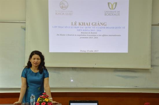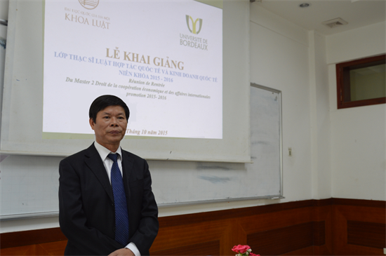 Phát biểu khai mạc buổi lễ, PGS.TS. Trịnh Quốc Toản đã nhấn mạnh, Khoa Luật là đơn vị đào tạo luật hàng đầu và là đơn vị duy nhất đào tạo chương trình “Luật hợp tác kinh tế và kinh doanh quốc tế”. Từ năm 2001, theo gợi ý từ Bộ Giáo dục và Đào tạo hai nước (Việt Nam và Pháp), chương trình đào tạo liên kết thạc sĩ “Luật hợp tác kinh tế và kinh doanh quốc tế” đã được triển khai và có những thành công nhất định tại Việt nam. Có được những thành công đó, là do các yếu tố: thứ nhất, Khoa nhận được sự quan tâm và tạo điều kiện từ phía Đại học Quốc gia Hà Nội; thứ hai, Các đơn vị từ Tổ chức Đại học Pháp ngữ (AUF) và ba trường Đại học của Cộng hòa Pháp: Toulouse 1 Capitole, Jean Moulin Lyon 3, và Bordeaux đã hỗ trợ Khoa trong các công tác tổ chức và đào tạo; thứ ba, Khoa có đội ngũ cán bộ, giảng viên tâm huyết tham gia vào công tác tổ chức và giảng dạy của chương trình.