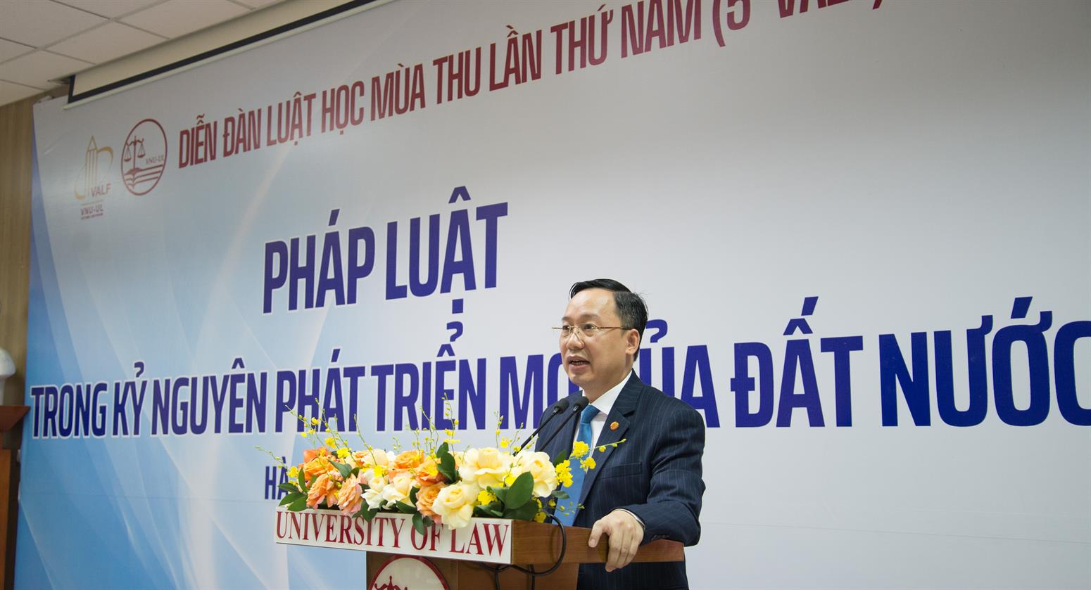 Trong diễn văn khai mạc, PGS.TS. Trịnh Tiến Việt gửi lời cảm ơn tới các đại biểu, khách mời và chuyên gia trong nước, quốc tế đã đồng hành cùng Nhà trường và Diễn đàn Luật học Mùa Thu. Ông nhấn mạnh ý nghĩa đặc biệt của sự kiện khi diễn ra vào Tháng Tám lịch sử, đúng dịp kỷ niệm 80 năm Cách mạng Tháng Tám và Quốc khánh 2/9. Năm nay, Diễn đàn với chủ đề bao trùm “Pháp luật trong bối cảnh phát triển mới của đất nước” gồm 3 hội thảo chuyên sâu, trong đó có 2 hội thảo quốc tế, nhằm thảo luận các vấn đề thời sự và gợi mở giải pháp hoàn thiện thể chế, pháp luật. Phó giáo sư khẳng định Diễn đàn đã trở thành địa chỉ học thuật uy tín của giới luật học trong nước và hướng tới tầm quốc tế, thể hiện vai trò, trách nhiệm của giới luật học đối với sự phát triển đất nước. Quyền Hiệu trưởng Nhà trường kỳ vọng các phiên thảo luận sẽ diễn ra sôi nổi, chất lượng, đóng góp thiết thực cho cải cách pháp luật và đổi mới đào tạo luật tại Việt Nam.