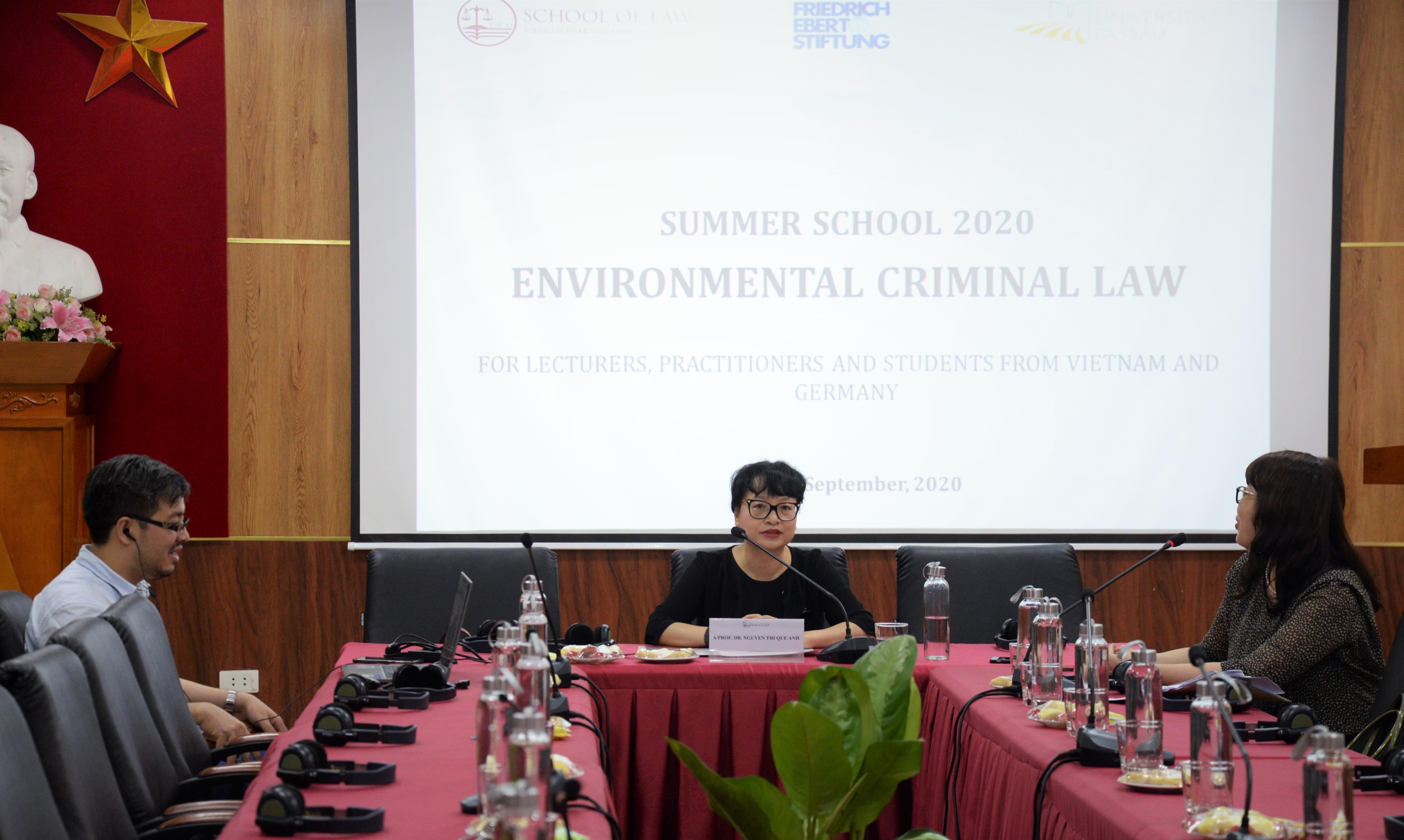 Trong khuôn khổ hợp tác giữa Khoa Luật, Đại học Quốc gia Hà Nội (ĐHQGHN) và Viện Friedrich Ebert Stiftung (FES) tại Hà Nội, ngày 21/9/2020, tại Khoa Luật đã diễn ra Lễ khai mạc Khóa học mùa hè (Summer School) bằng hình thức kết hợp trực tiếp và trực tuyến do Khoa Luật, ĐHQGHN và Đại học Passau (CHLB Đức) phối hợp tổ chức. Khóa học diễn ra với chủ đề “Pháp luật hình sự về môi trường ở Đức và Việt Nam” trong 03 từ 21 đến 23 tháng 9 năm 2020.