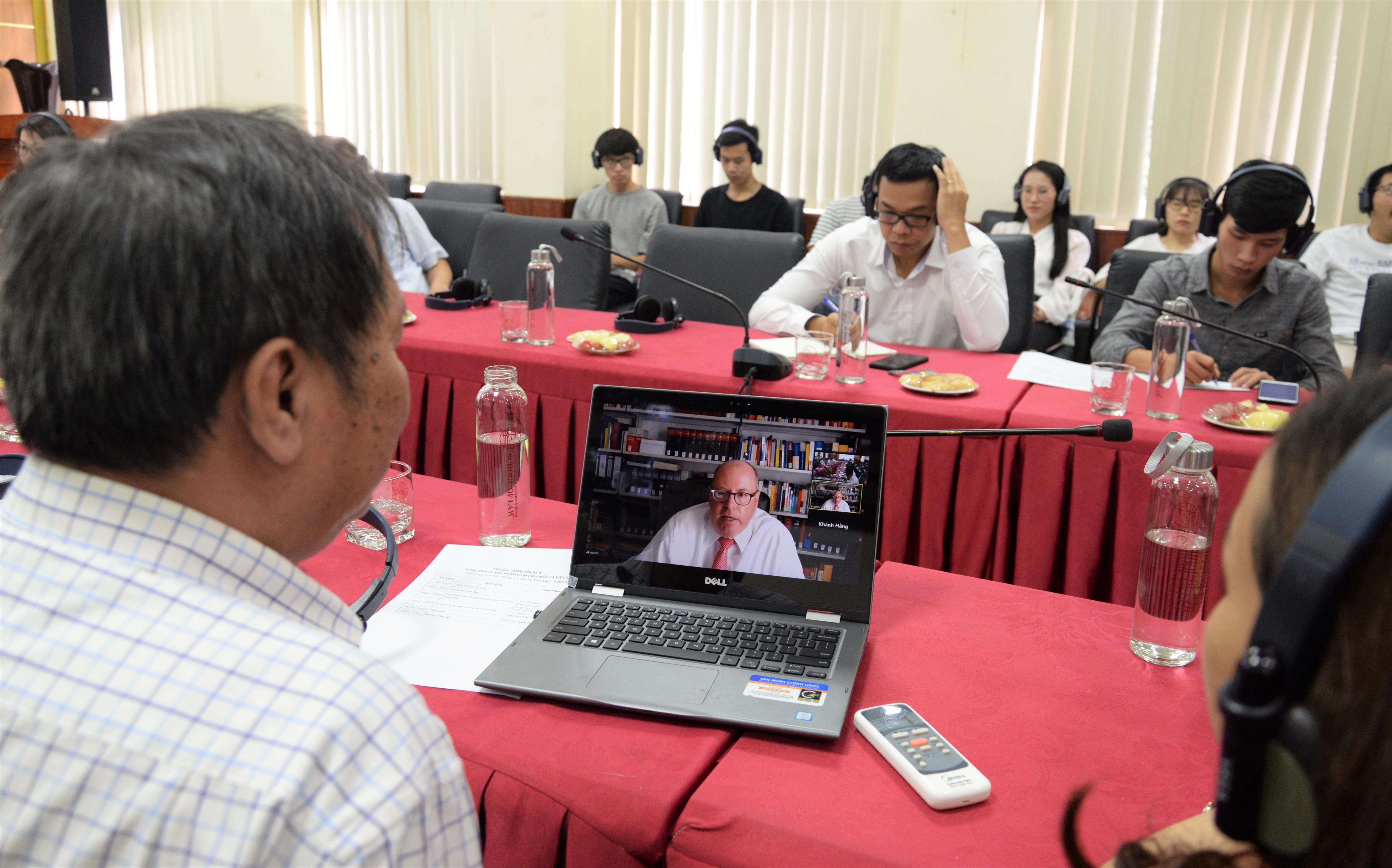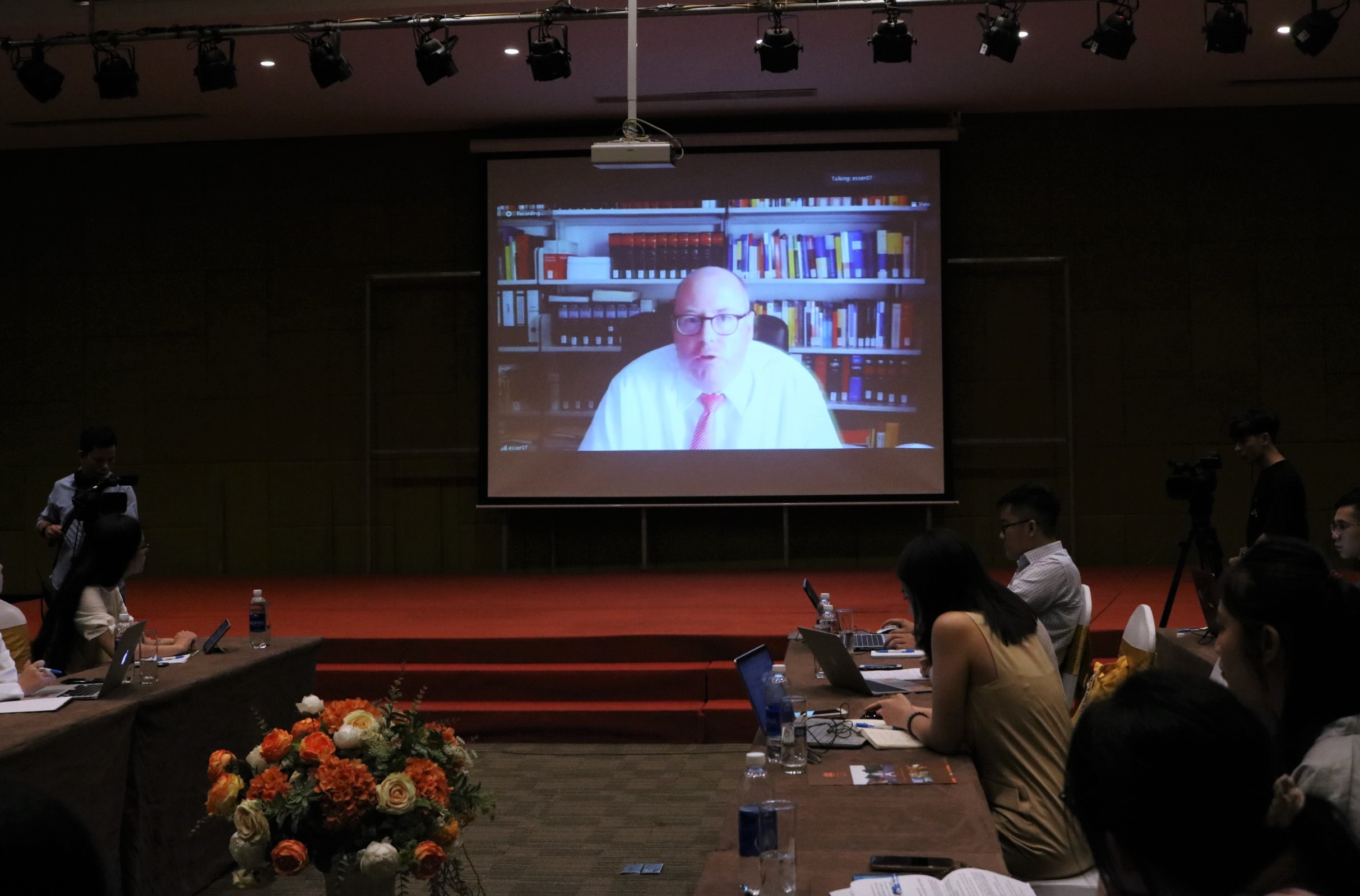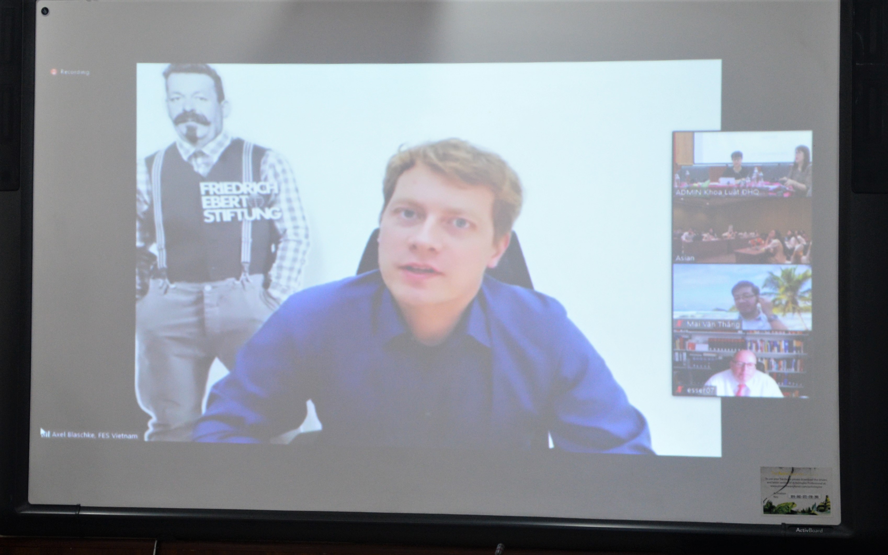 Trưởng đại diện Viện FES tại Hà Nội, Ông Axel Blaschke nhấn mạnh Viện FES đã có gần 30 năm hoạt động hiệu quả tại Việt Nam, mong muốn đóng góp cho sự phát triển chung của nền luật học tại Việt Nam. Trong đó, việc triển khai hợp tác với Khoa Luật, ĐHQGHN là lời khẳng định của Văn phòng trong việc hỗ trợ sinh viên Việt Nam và sinh viên Đức có cơ hội trao đổi, phát triển, kinh nghiệm học thuật giữa hai nước. Ông hi vọng thông qua các khóa học này, các bạn sinh viên sẽ có tạo ra những kết nối, trao đổi phục vụ cho hoạt động nghề nghiệp tương lai của các bạn. Ông cũng gửi lời cám ơn tới Khoa Luật, ĐHQGHN đã tạo mọi điều kiện tốt nhất để khóa học được diễn ra thuận lợi và hi vọng trong tương lai sẽ còn nhiều khóa học được tổ chức.