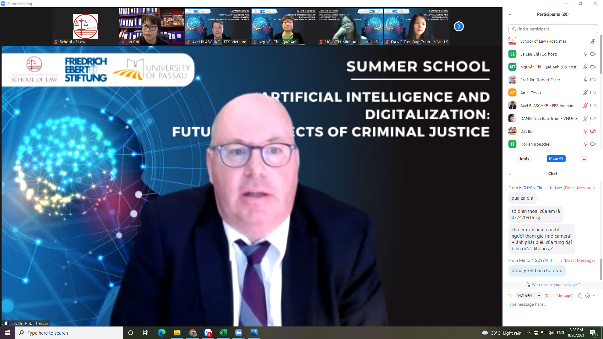 Ngày 20 và 21/9/2021, Khóa học mùa hè (Summer School) do Khoa Luật, ĐHQGHN, Viện Friedrich-Ebert-Stiftung (FES) Việt Nam và Đại học Passau (CHLB Đức) phối hợp tổ chức đã diễn ra với chủ đề rất hấp dẫn “Trí tuệ nhân tạo và số hóa: Triển vọng tương lai của tư pháp hình sự”. Khóa học được diễn ra bằng hình thức trực tuyến trên nền tảng Zoom.