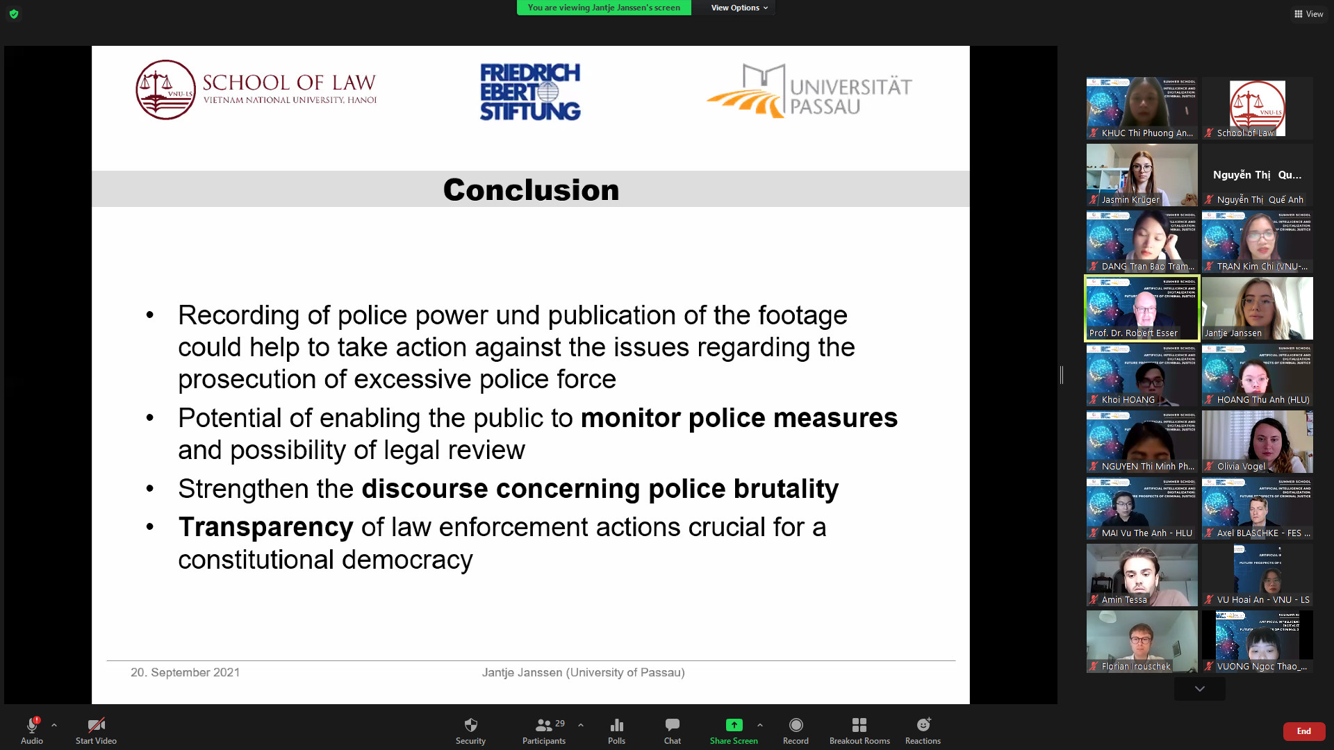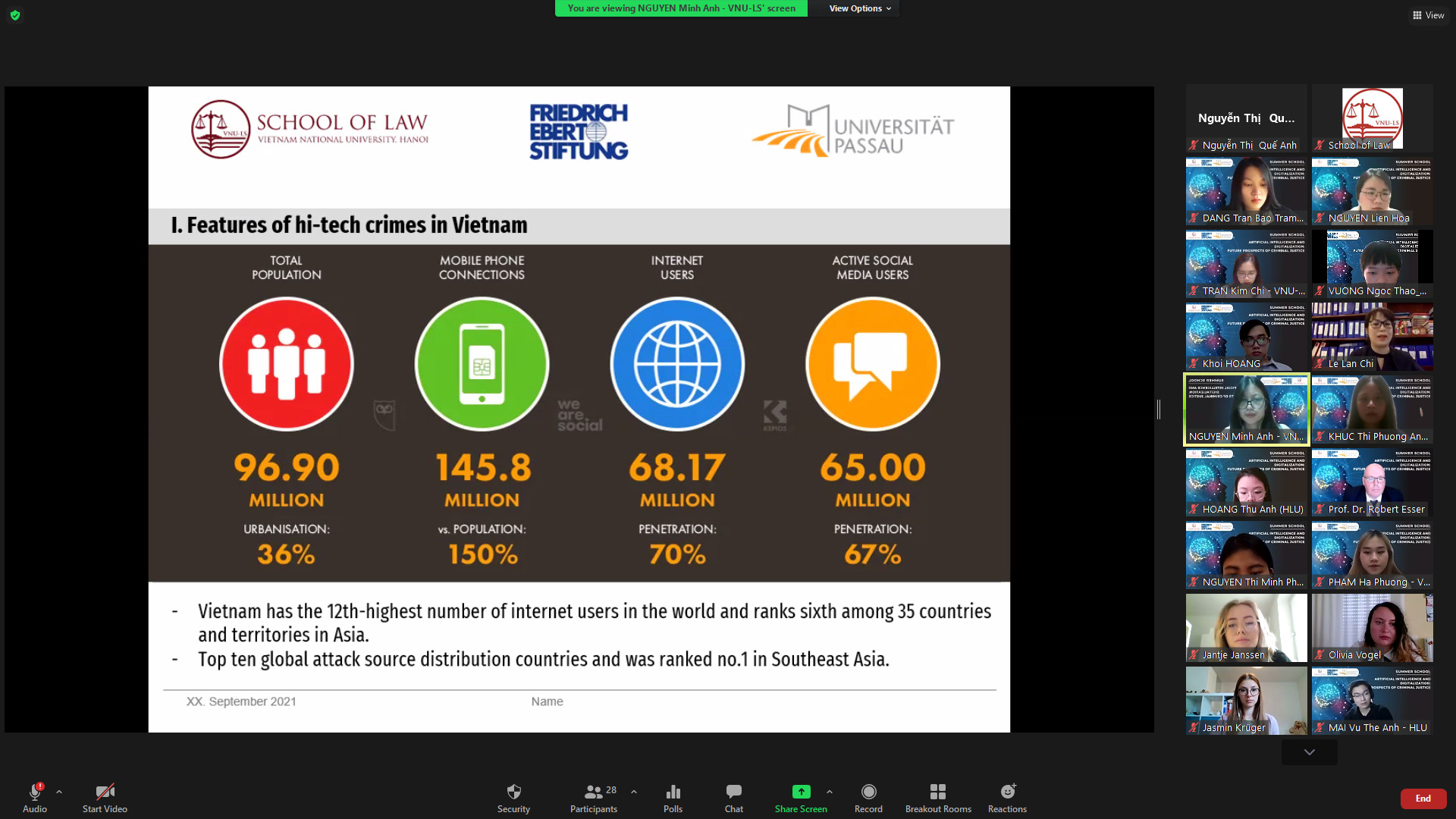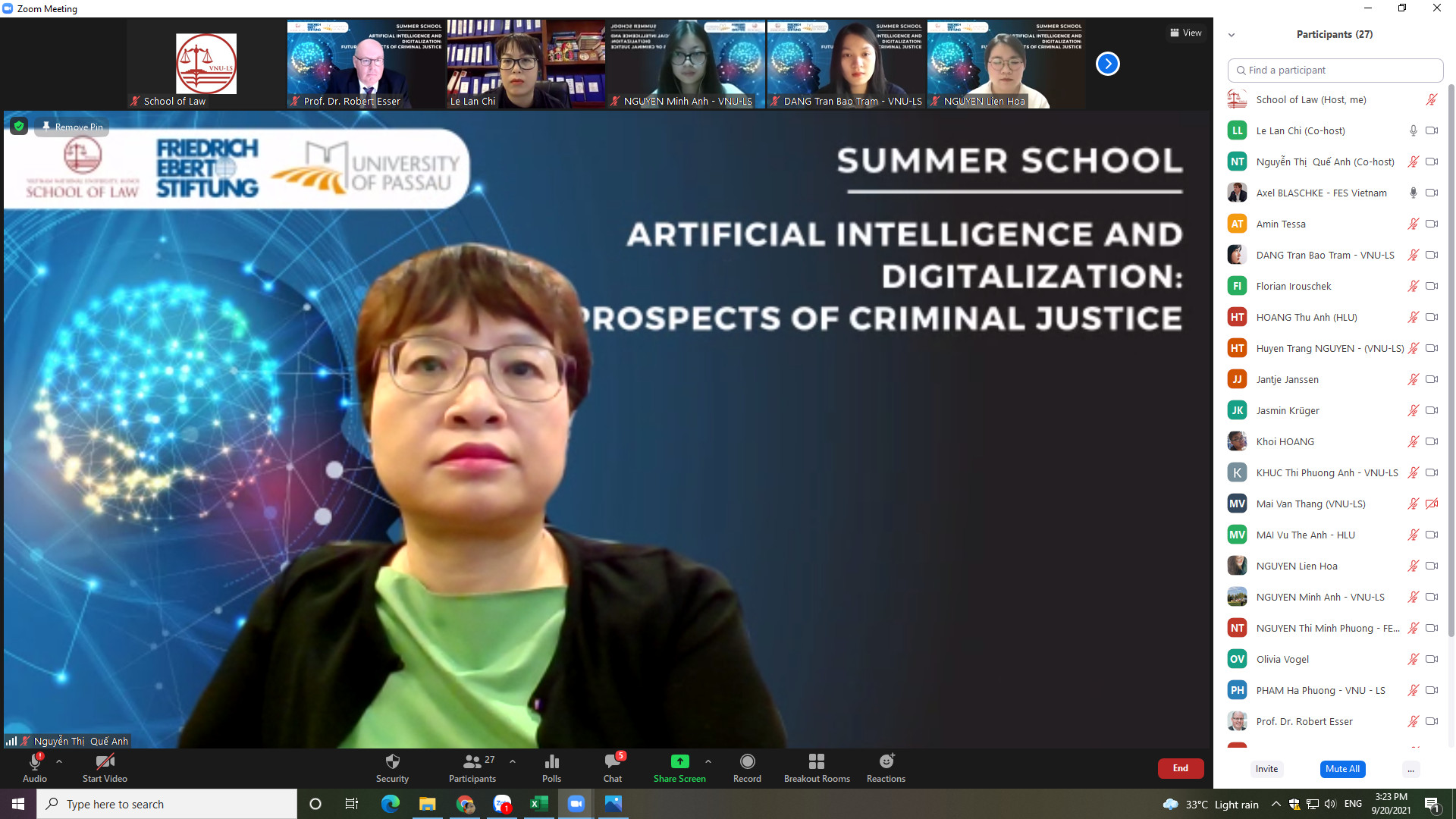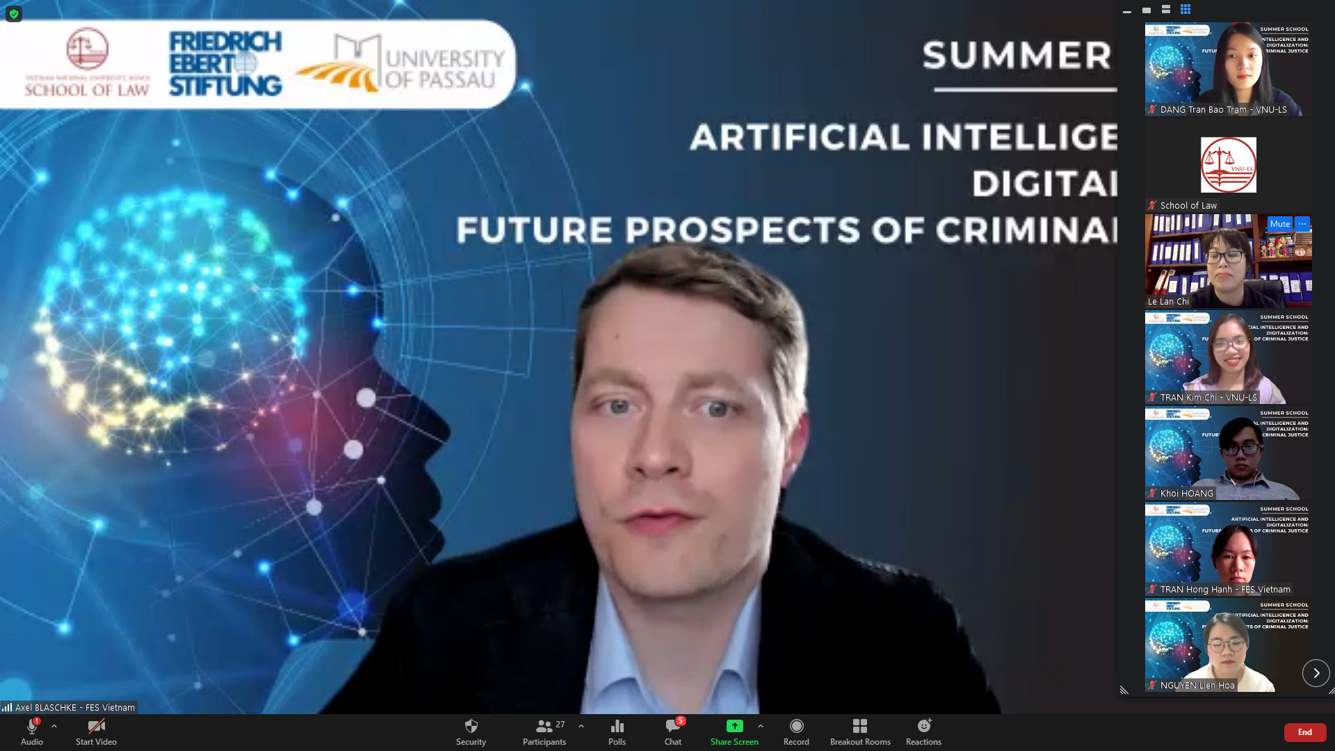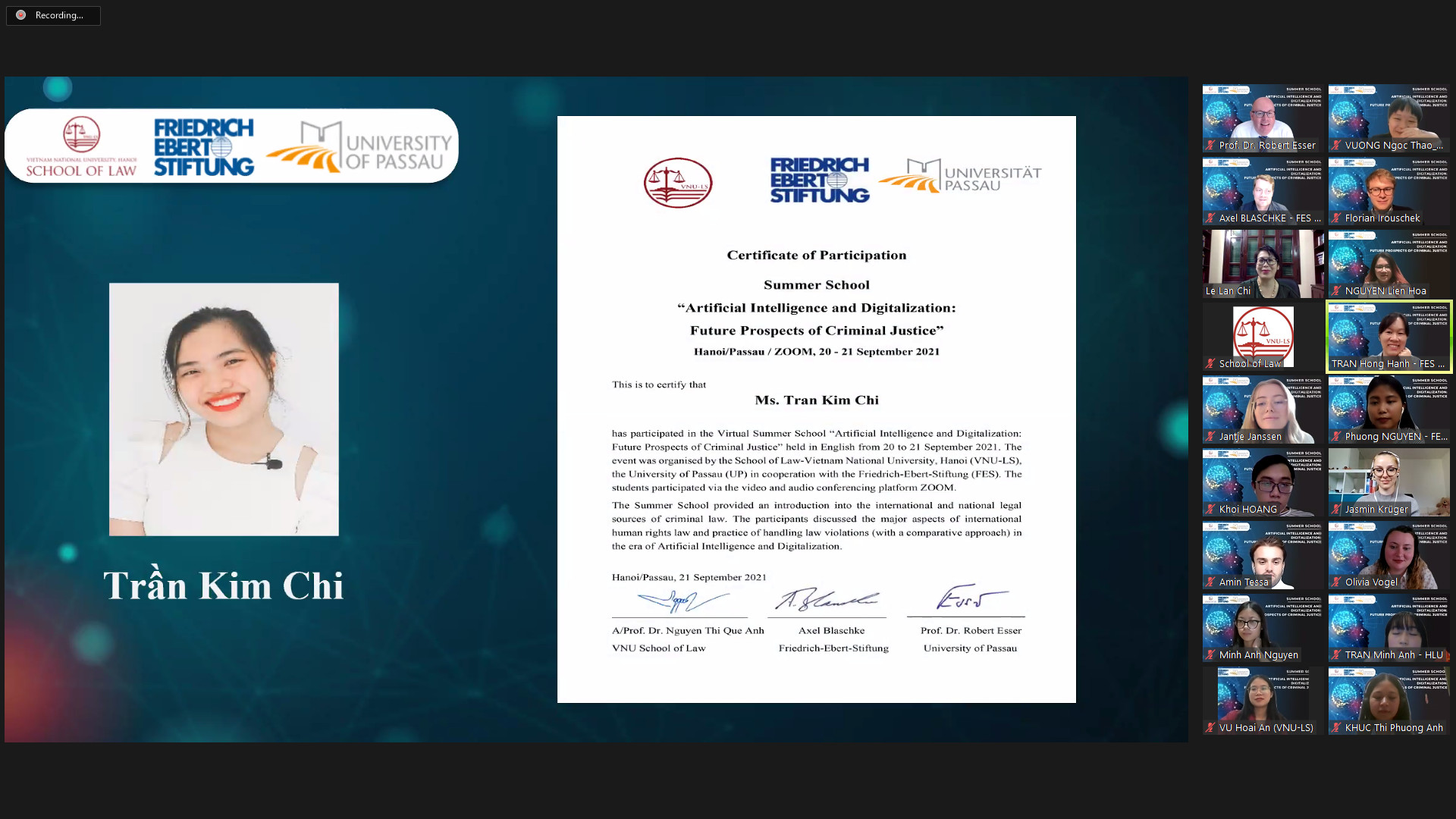 Ngày 20 và 21/9/2021, Khóa học mùa hè (Summer School) do Khoa Luật, ĐHQGHN, Viện Friedrich-Ebert-Stiftung (FES) Việt Nam và Đại học Passau (CHLB Đức) phối hợp tổ chức đã diễn ra với chủ đề rất hấp dẫn “Trí tuệ nhân tạo và số hóa: Triển vọng tương lai của tư pháp hình sự”. Khóa học được diễn ra bằng hình thức trực tuyến trên nền tảng Zoom.