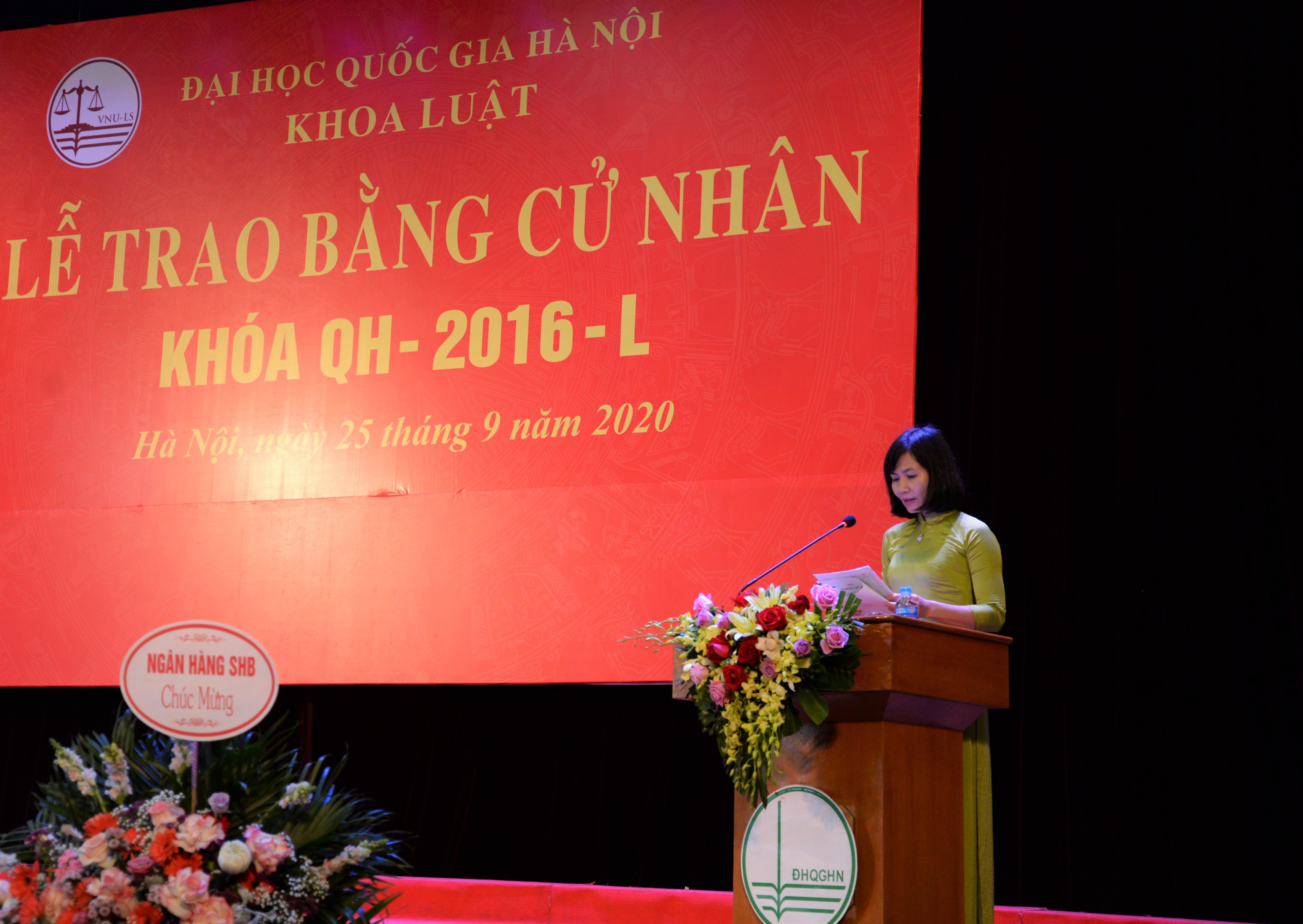 Sau phần nghi lễ chào cờ, khai mạc, thay mặt lãnh đạo Khoa, PGS.TS. Nguyễn Thị Quế Anh đọc diễn văn bế giảng năm học. Bài diễn văn như một bức tranh mô tả toàn cảnh quá trình học tập, rèn luyện, phấn đấu, nêu bật những thành tích và kết quả đã đạt được của tất cả thầy và trò trong năm học 2019 – 2020. Năm học này, Khoa đã phải đối mặt với không ít khó khăn, thách thức; trong hoàn cảnh cả thế giới phải đương đầu với đại dịch Covid – 19, Việt Nam cũng phải gồng mình chống dịch, thời gian học tập tập trung trên giảng đường có những giai đoạn phải gián đoạn, thầy trò dạy và học trực tuyến, khát vọng được tới trường, được học tập bình yên và được tốt nghiệp đúng kế hoạch phần nào bị chậm trễ. Tuy nhiên, bằng sự chung sức, chung lòng và bằng sự nỗ lực của tập thể giảng viên, cán bộ viên chức, sinh viên mọi nhiệm vụ đã được hoàn thành tốt đẹp. Hôm nay là ngày Khoa Luật chính thức nói lời tạm biệt các bạn sinh viên Khóa QH – 2016, nhưng Khoa Luật vẫn sẽ luôn rộng mở đón các bạn trở về để tiếp tục học ở những cấp đào tạo trình độ cao hơn, đó là đào tạo Thạc sĩ và Tiến sĩ.
