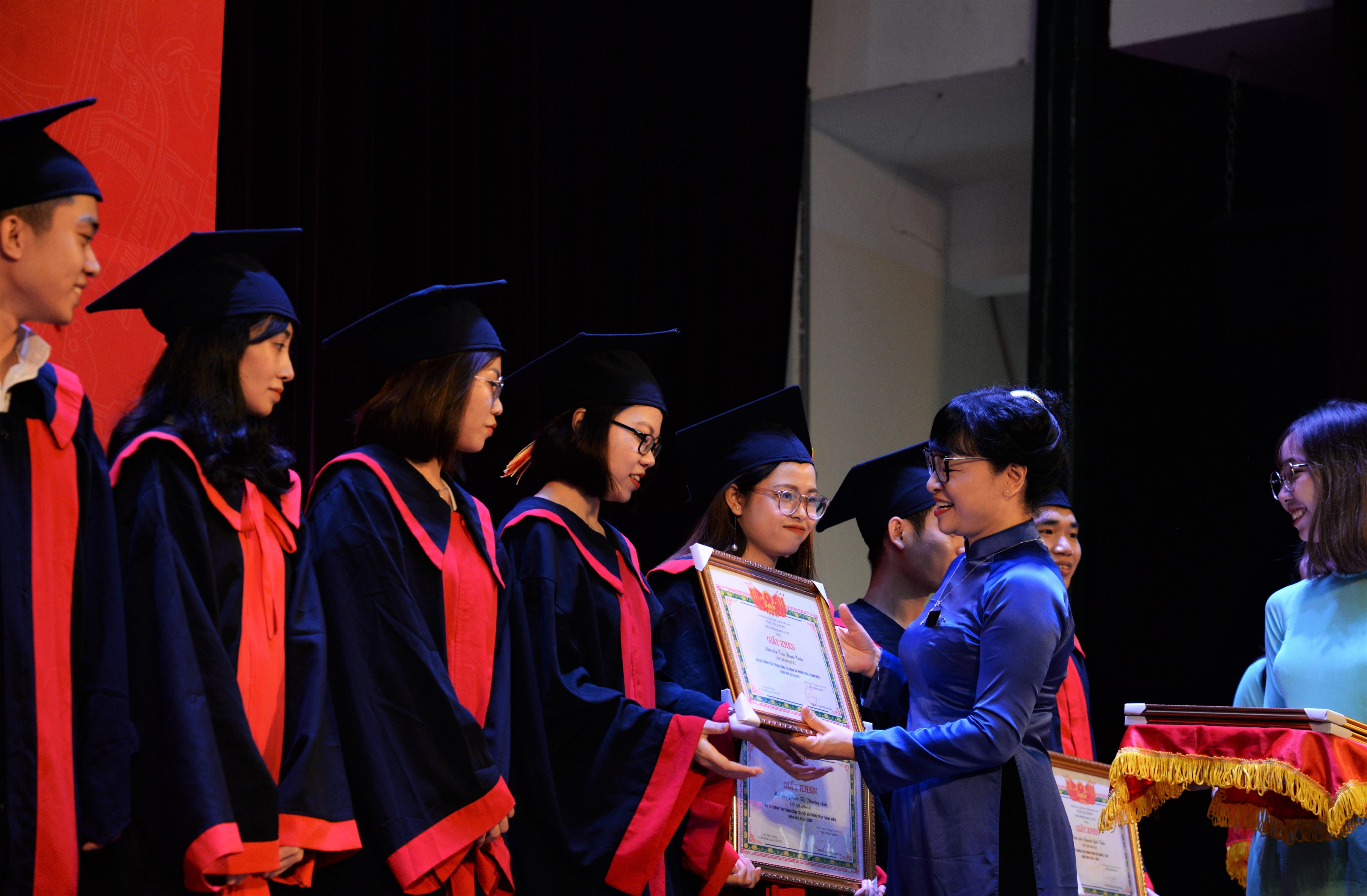 Nội dung chính của buổi lễ Bế giảng là phần trao bằng tốt nghiệp. Trước tiên là các sinh viên tốt nghiệp Xuất sắc vinh dự được nhận Bằng tốt nghiệp và hoa chúc mừng trực tiếp từ tay PGS.TS. Nguyễn Thị Quế Anh.