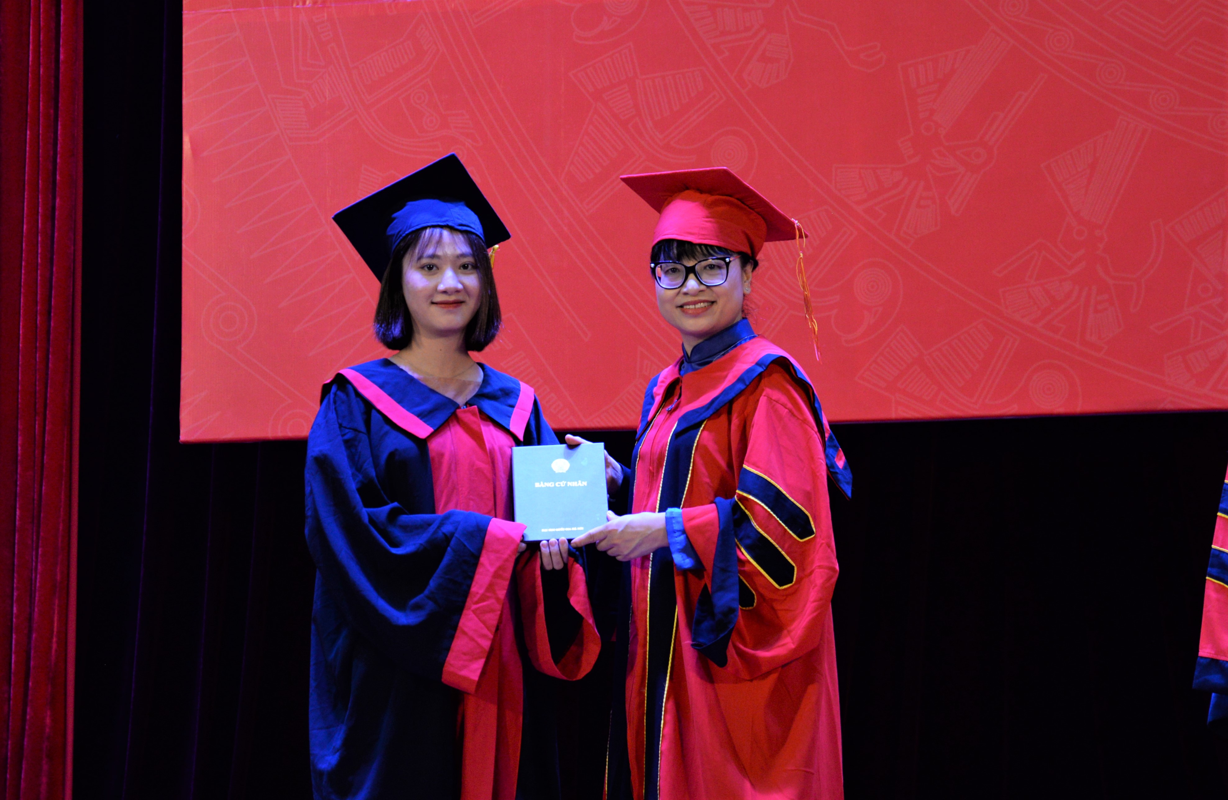 Tiếp theo Đoàn nghi Lễ gồm PGS.TS. Nguyễn Thị Quế Anh, PGS.TS. Trịnh Tiến Việt, PGS.TS. Vũ Công Giao, TS. Lê Lan Chi, TS. Nguyễn Thị Bích Thảo trao Bằng và chúc mừng cho các tân cử nhân Khóa QH – 2016. Đối với mỗi sinh viên, đây chính là một trong những giây phút quan trọng, quý giá nhất của cuộc đời; là thời khắc được đón nhận thành quả mà mình đạt được trong suốt 04 năm không ngừng phấn đấu, học tập và rèn luyện. Điều này thể hiện qua những nụ cười tươi trên những khuôn mặt rạng rỡ, ánh lên niềm vui khôn tả của tất cả các sinh viên tham dự buổi lễ và nhất là trong giây phút được nhận tấm bằng Cử nhân từ tay các Thầy, Cô.