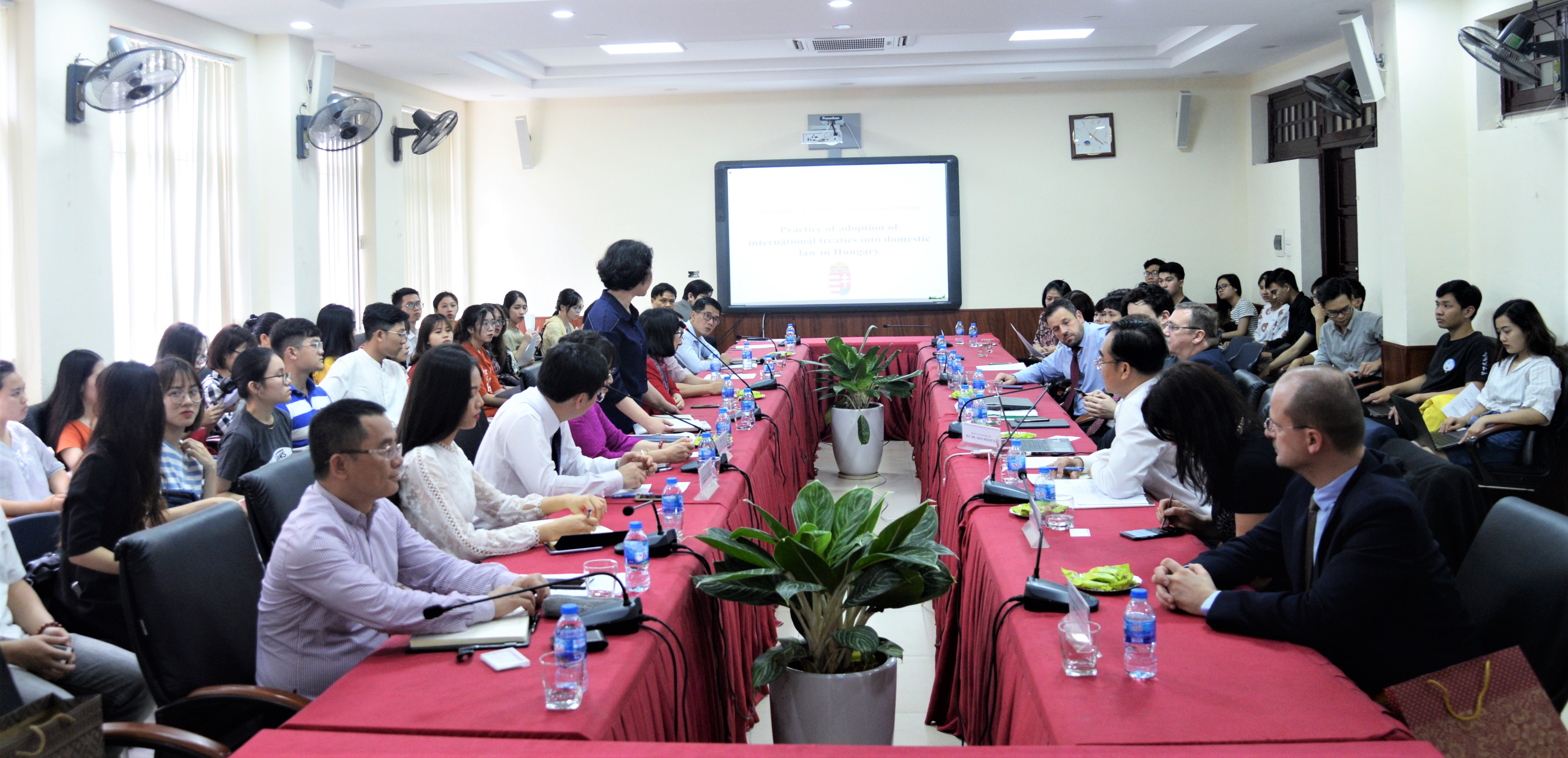 Tiếp đó, ngài Akos Berzetei đã có phần trình bày với sinh viên của Khoa về “Thực tiễn áp dụng các điều ước quốc tế vào luật quốc gia tại Hungary”. Việc áp dụng pháp luật quốc tế vào luật quốc gia của Hungary bắt đầu bằng việc ghi nhận điều này trong Hiến pháp Hungary từ năm 1989, trong đó xác nhận các quy định pháp lý của Hungary chấp nhận các quy định được công nhận chung của pháp luật quốc tế, đồng thời đảm bảo sự hài hòa giữa nghĩa vụ pháp lý quốc tế và pháp luật quốc gia. Hungary hiện nay áp dụng nguyên tắc nhị nguyên khẳng định khi luật pháp quốc gia mâu thuẫn với điều ước quốc tế được ký kết, thì các quy định của luật quốc gia phải sửa đổi hoặc hủy bỏ để phù hợp với luật pháp quốc tế. Các nguyên tắc và chuẩn mực được công nhận chung của luật quốc tế và các quy tắc của luật tục trở thành một phần của luật quốc gia thông qua phương thức chuyển đổi chung, trong trường hợp điều ước đòi hỏi phương thức chuyển đổi đặc biệt thì cần có đạo luật xây dựng luật quốc gia đặc biệt để chuyển đổi điều ước quốc tế đó thành chuẩn mực quốc gia.