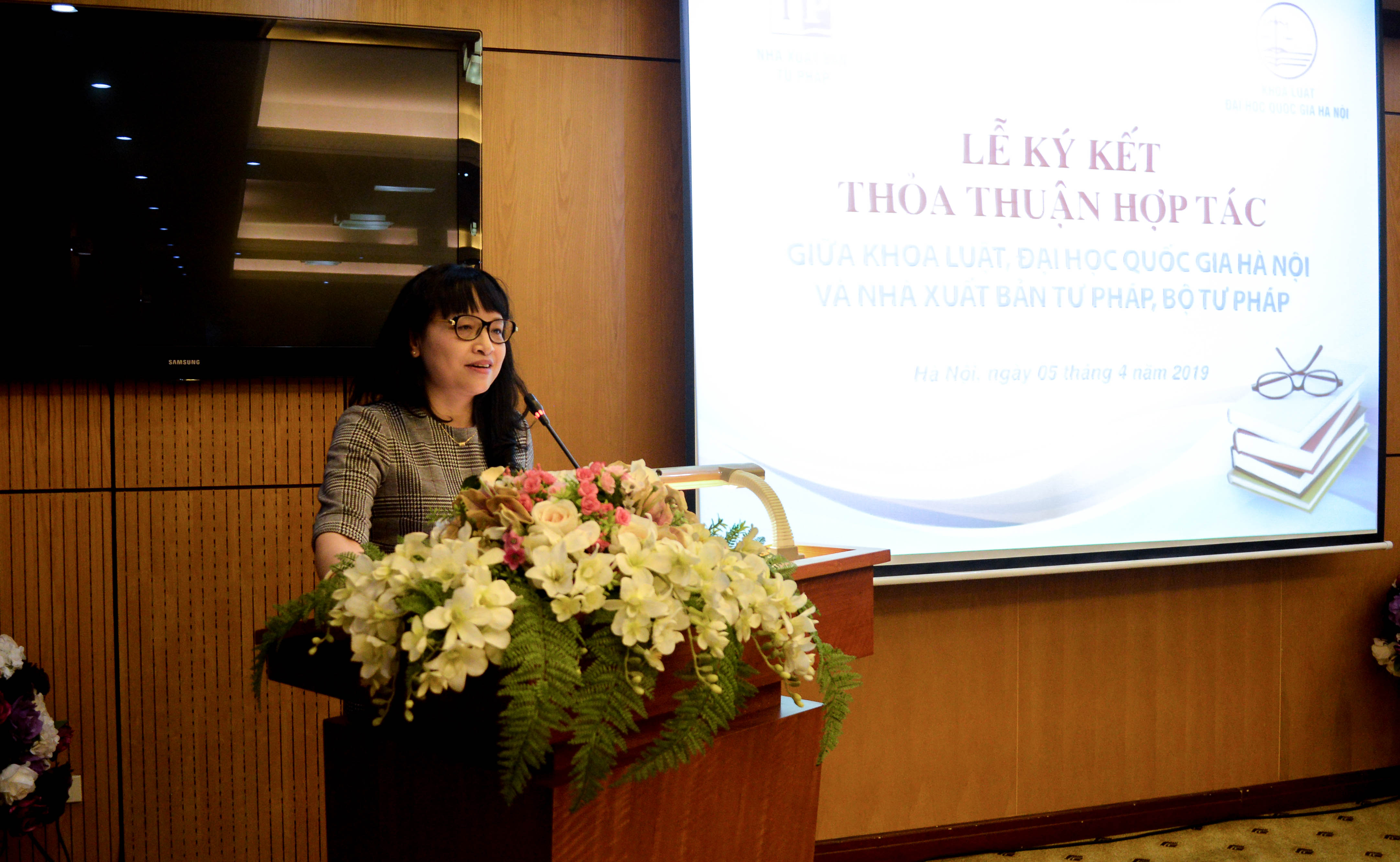 Tại buổi Lễ, PGS.TS. Nguyễn Thị Quế Anh khẳng định, trước bối cảnh cần phải có những cơ chế hợp tác chặt chẽ để vừa bảo đảm những yêu cầu cao về chất lượng của các xuất bản phẩm, công trình khoa học, vừa thúc đẩy tiến độ hoạt động xuất bản, đồng thời góp phần phát huy hơn nữa thế mạnh, uy tín của một cơ sở đào tạo, nghiên cứu luật bề dày truyền thống, tiên phong trong học thuật, và giải quyết tốt hơn nữa những nhu cầu cấp bách trong bối cảnh, đổi mới, hội nhập và tự chủ đại học ngày càng mạnh mẽ, Khoa Luật và NXB Tư pháp sẽ là đối tác đáp ứng được các nhu cầu đó, bởi NXB Tư pháp là NXB có chuyên môn sâu về chuyên ngành luật và tư pháp, là bộ phận cấu thành quan trọng của Bộ Tư pháp, có truyền thống, uy tín trong ngành xuất bản và đặc biệt đang thể hiện sự năng động mạnh mẽ trong bối cảnh mới hiện nay. PGS.TS. Nguyễn Thị Quế Anh bày tỏ hy vọng, sau khi bản thỏa thuận hợp tác được ký kết, các bên sẽ sớm xúc tiến, triển khai các hoạt động hợp tác cụ thể.