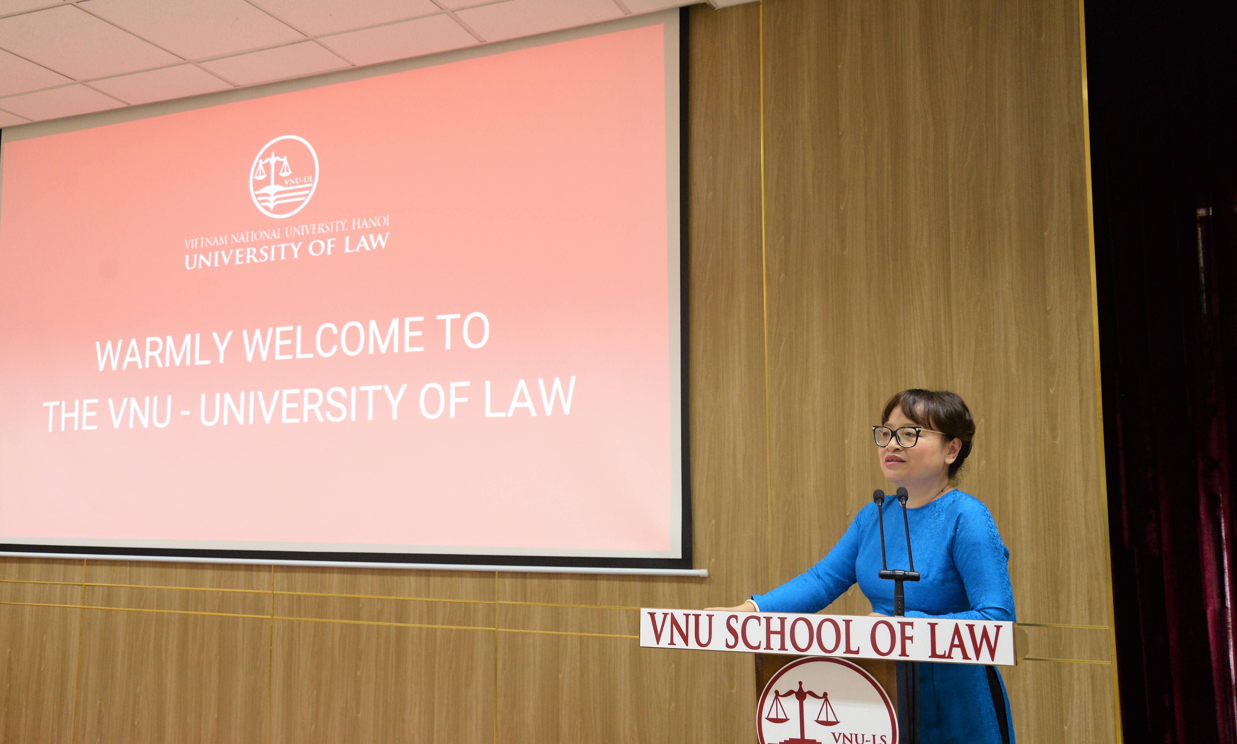 Phát biểu chào mừng, PGS.TS. Nguyễn Thị Quế Anh bày tỏ niềm vui mừng khi đón tiếp nhiều vị khách quý từ Đại sứ quán các nước ở Hà Nội. Đặc biệt sự kiện này diễn ra trong bối cảnh Khoa Luật vừa được Chính phủ nâng cấp thành một trong 9 trường đại học thành viên của ĐHQGHN. PGS cũng trao đổi thêm về 02 Chương trình đào tạo (CTĐT) là CTĐT Thạc sĩ Quyền con người và quyền công dân và CTĐT Thạc sĩ Quản trị nhà nước và Phòng chống tham nhũng.