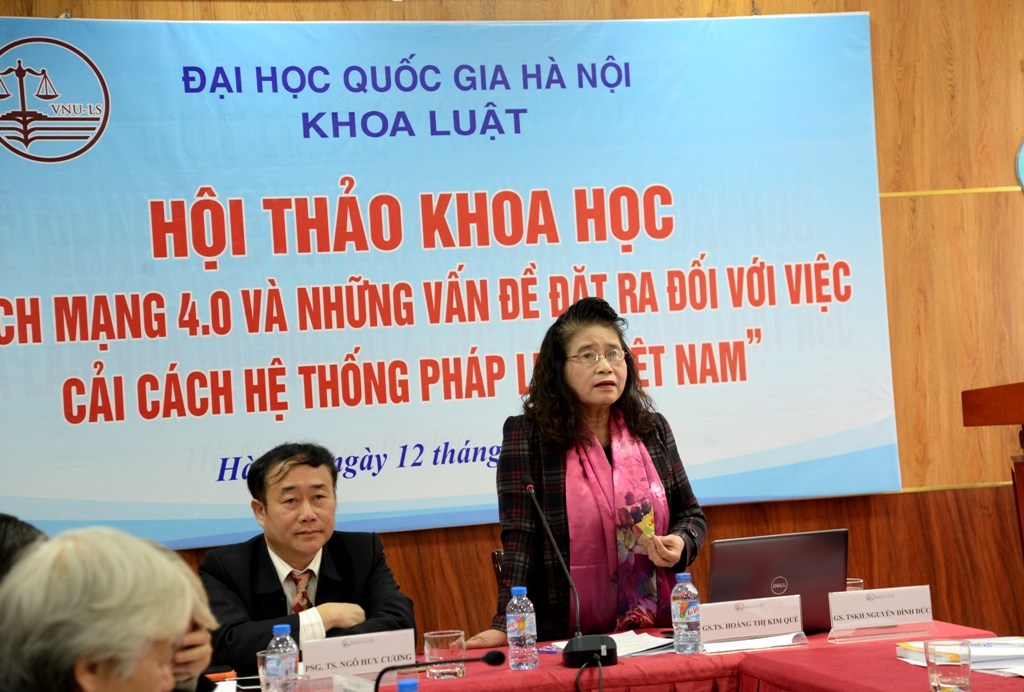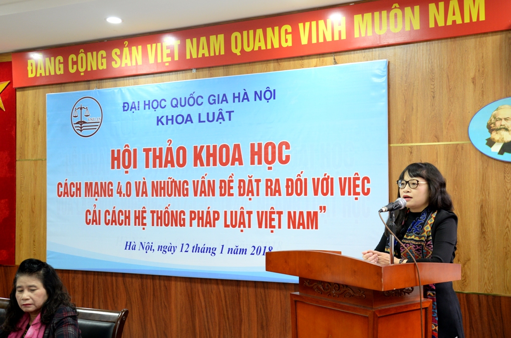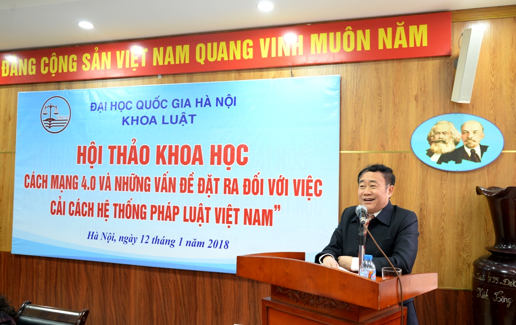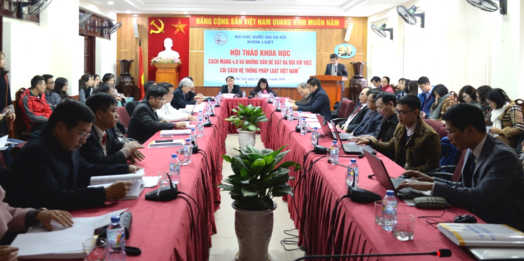 Ngày 12/01/2018, Khoa Luật, Đại học Quốc gia Hà Nội (ĐHQGHN) đã tổ chức Hội thảo khoa học “Cách mạng 4.0 và những vấn đề đặt ra đối với việc cải cách hệ thống pháp luật Việt Nam”. Tham dự Hội thảo có GS. TSKH. Nguyễn Đình Đức – Trưởng Ban Đào tạo, ĐHQGHN, TS. Đỗ Xuân Lân – Vụ Trưởng Vụ Phổ biến và Giáo dục Pháp luật, Bộ Tư pháp, TS. Nguyễn Văn Cương -Viện Trưởng Viện Khoa học Pháp lý, Bộ Tư pháp, TS. Lương Minh Tuân – Phó Tổng Biên tập Tạp chí Nghiên cứu Lập pháp – Ủy Ban Thường vụ Quốc hội. Về phía Khoa Luật có PGS.TS. Nguyễn Thị Quế Anh – Phó Chủ nhiệm phụ trách Khoa, TS. Trịnh Tiến Việt Phó Chủ nhiệm Khoa, TS. Nguyễn Trọng Điệp – Phó Chủ nhiệm Khoa và các nhà khoa học đến từ các đơn vị nghiên cứu, cơ quan quản lý và Khoa Luật.