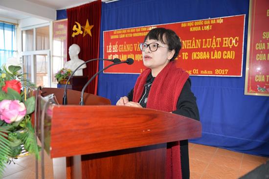 Trong Lễ Bế giảng, thay mặt cho lãnh đạo Khoa Luật, ĐHQGHN, PGS.TS. Nguyễn Thị Quế Anh – Bí thư Đảng uỷ, Phó Chủ nhiệm Khoa đã chúc mừng các tân cử nhân đã nỗ lực học tập, vượt qua nhiều khó khăn để hoàn thành xuất sắc khóa học. PGS.TS. Nguyễn Thị Quế Anh cũng gửi lời cảm ơn đến Ban Giám đốc Trung tâm HNDN-GDTX tỉnh Lào Caicùng toàn thể các cán bộ, giảng viên của hai đơn vị về sự phối hợp có hiệu quả để tổ chức tốt khoá học này. Nhân dịp chuẩn bị bước sang năm mới, PGS.TS. Nguyễn Thị Quế Anh gửi những lời chúc sức khỏe, hạnh phúc đến toàn thể lãnh đạo, cán bộ, giảng viên của Trung tâm và các tân cử nhân lớp K38A4.