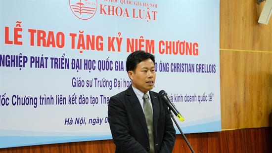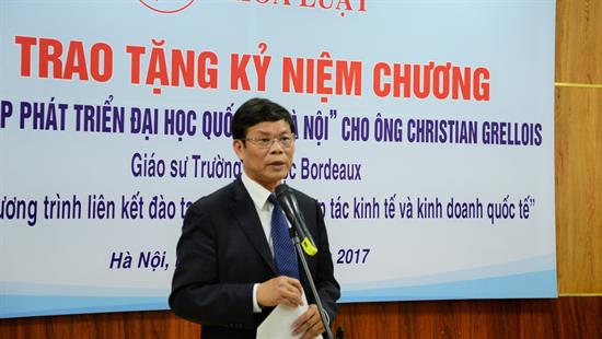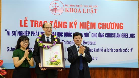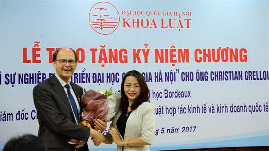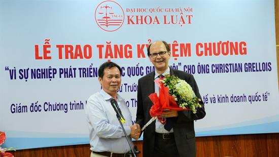 Ngày 03/5/2017, Khoa Luật tổ chức trao tặng Kỷ niệm chương “Vì sự nghiệp phát triển Đại học Quốc gia Hà Nội” của Giám đốc Đại học Quốc gia Hà Nội (ĐHQGHN) cho GS. Christian GRELLOIS – Giám đốc Chương trình thạc sỹ “Luật hợp tác kinh tế và kinh doanh quốc tế”.