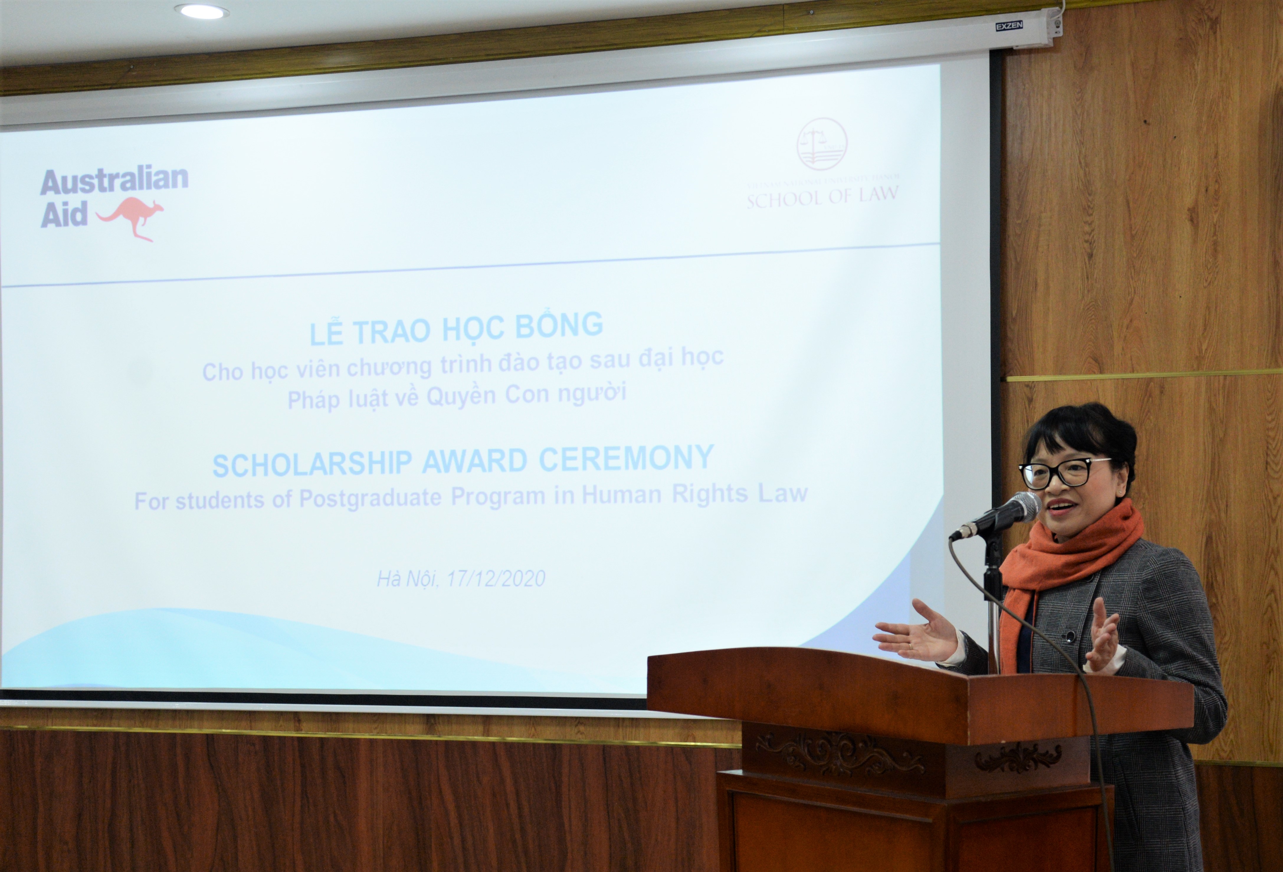 Tham dự và trao học bổng cho các học viên có Bà Robyn Mudie – Đại sứ Australia tại Việt Nam, PGS.TS. Nguyễn Thị Quế Anh – Chủ nhiệm Khoa Luật, PGS.TS. Vũ Công Giao – Chủ nhiệm Bộ môn Luật Hiến pháp – Luật Hành chính, PGS.TS. Đặng Minh Tuấn – Phó Chủ nhiệm Bộ môn Luật Hiến pháp – Luật Hành chính và các học viên, nghiên cứu sinh của chương trình đào tạo Luật nhân quyền.