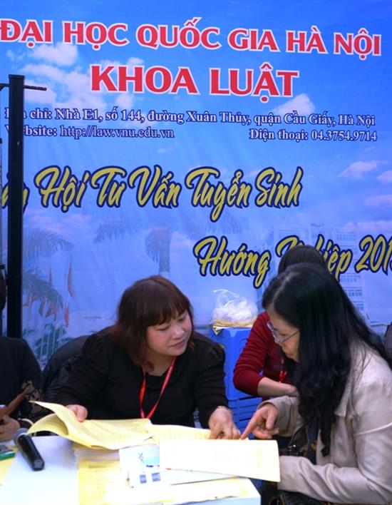 Ngày 15/3/2015, các cán bộ Khoa Luật, ĐHQGHN đã tư vấn, giải đáp các thắc mắc của thí sinh và phụ huynh về các vấn đề tuyển sinh của Khoa. Các thông tin về chương trình đào tạo đại học chính quy, chỉ tiêu tuyển sinh các ngành đào tạo, đặc biệt là chương trình đào tạo ngành kép được thí sinh và phụ huynh quan tâm.