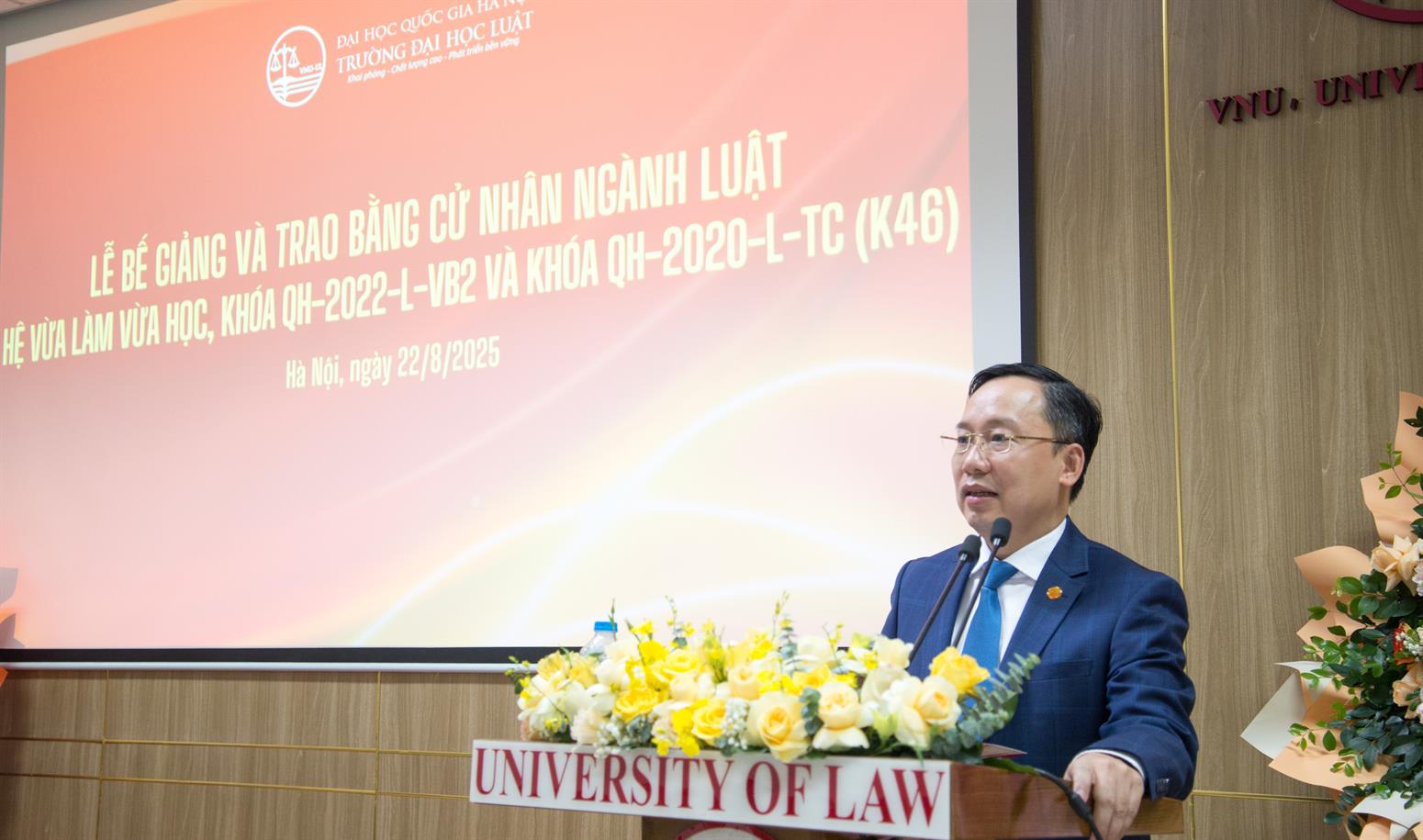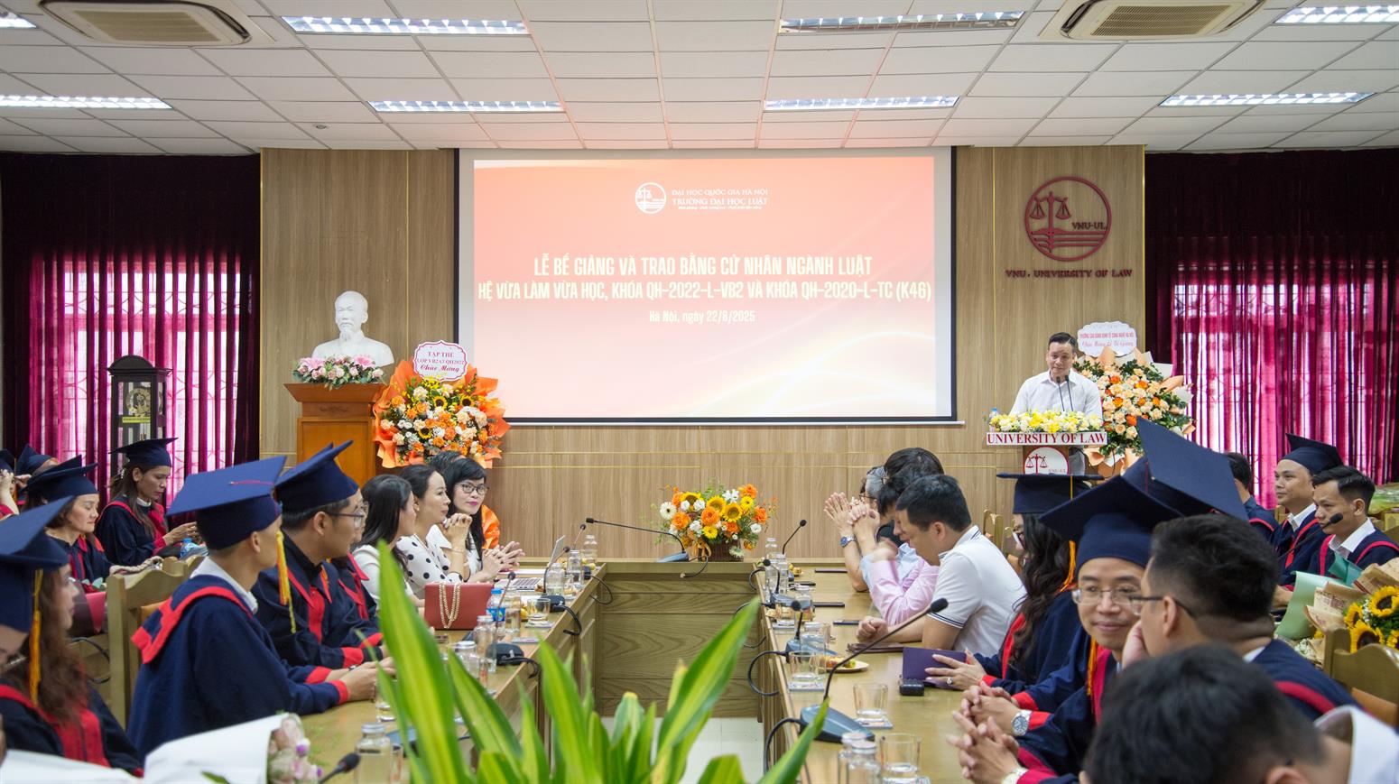 Trong bầu không khí hân hoan, xúc động khi cả nước đang kỷ niệm 80 năm Cách mạng Tháng Tám thành công và Quốc khánh 2/9, Trường Đại học Luật, Đại học Quốc gia Hà Nội đã long trọng tổ chức Lễ bế giảng và trao bằng cử nhân Luật hệ Vừa làm vừa học cho 126 học viên của hai khóa QH-2022-L-VB2 và QH-2020-L-TC.