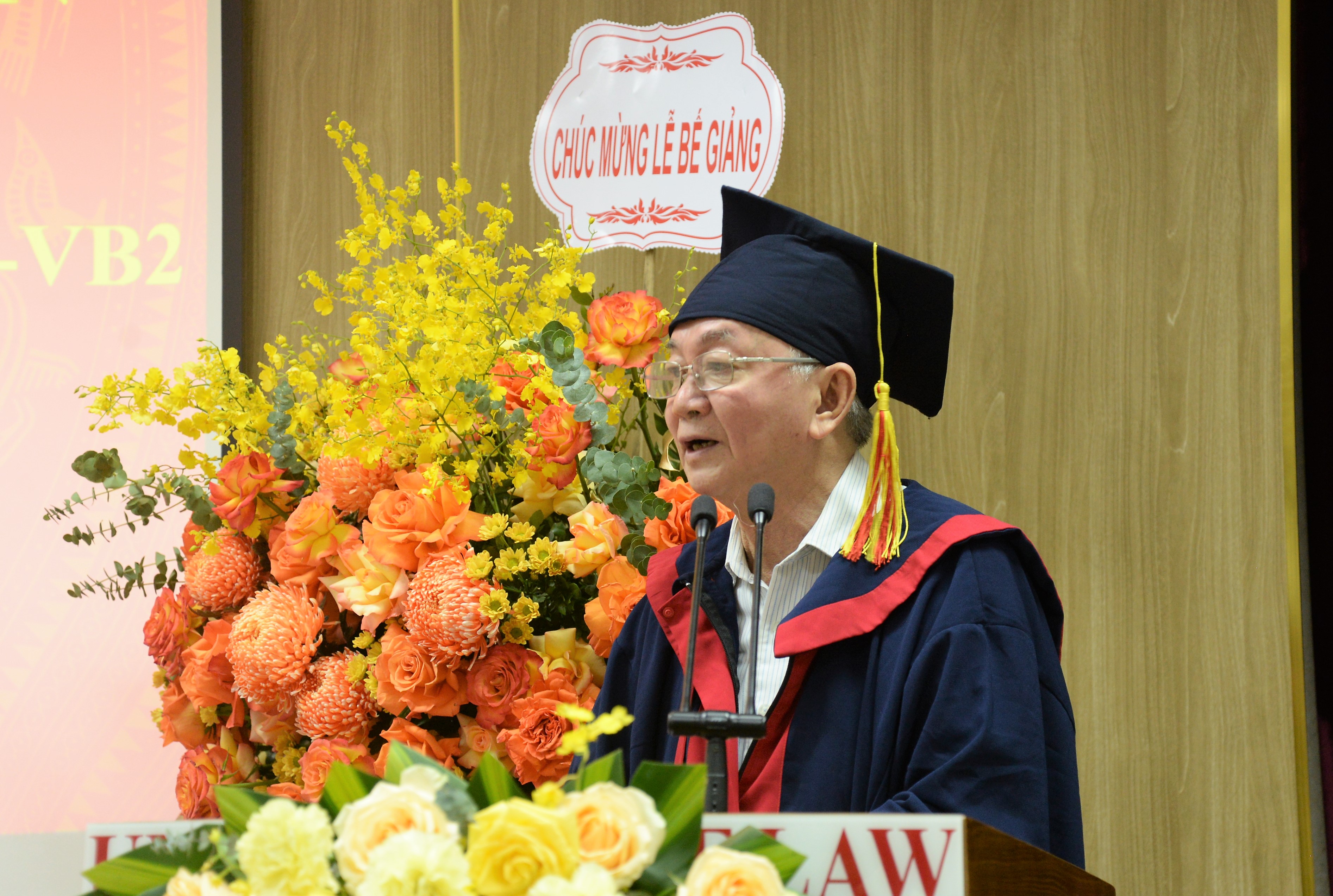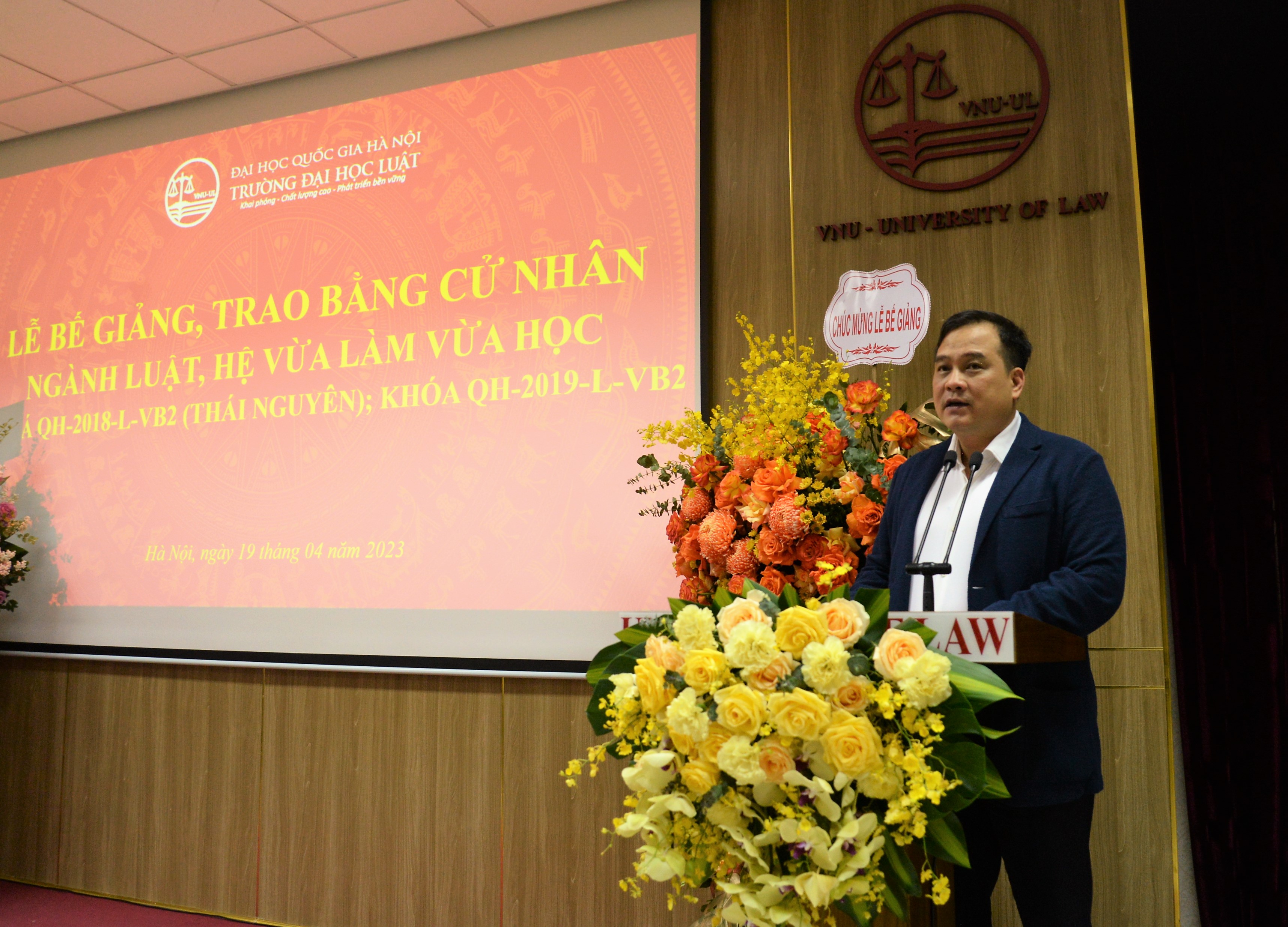 Sau phần nghi lễ chào cờ, khai mạc, thay mặt lãnh đạo Khoa, TS. Nguyễn Trọng Điệp đọc diễn văn bế giảng. Lễ bế giảng và trao bằng Cử nhân cho khóa QH – 2018 – L – VB2 – VLVH đào tạo tại Thái Nguyên và khóa QH – 2019 – L – VB2 – VLVH đào tạo tại Trường trong một bối cảnh hết sức đặc biệt bởi các tân cử nhân nhận bằng tốt nghiệp ngày hôm nay sẽ cầm tấm bằng của Trường Đại học Luật, ĐHQGHN. Khóa QH – 2018 – L – VB2 – VLVH đào tạo tại Thái Nguyên và khóa QH – 2019 – L – VB2 – VLVH đào tạo tại Trường đã khép lại với bao dấu ấn của thầy và trò Trường Đại học Luật. Khóa học đặc biệt với gần 2 năm diễn ra trong bối cảnh dịch bệnh chưa từng có và việc học trực tuyến còn những hạn chế, bất cập và không đồng bộ. Hôm nay là ngày Trường Đại học Luật chính thức nói lời tạm biệt các bạn học viên khóa QH – 2018 – L – VB2 – VLVH đào tạo tại Thái Nguyên và khóa QH – 2019 – L – VB2 – VLVH đào tạo tại Trường, nhưng nhà trường vẫn sẽ luôn rộng mở đón các bạn trở về để tiếp tục học ở những cấp đào tạo trình độ cao hơn, đó là đào tạo Thạc sĩ và Tiến sĩ.