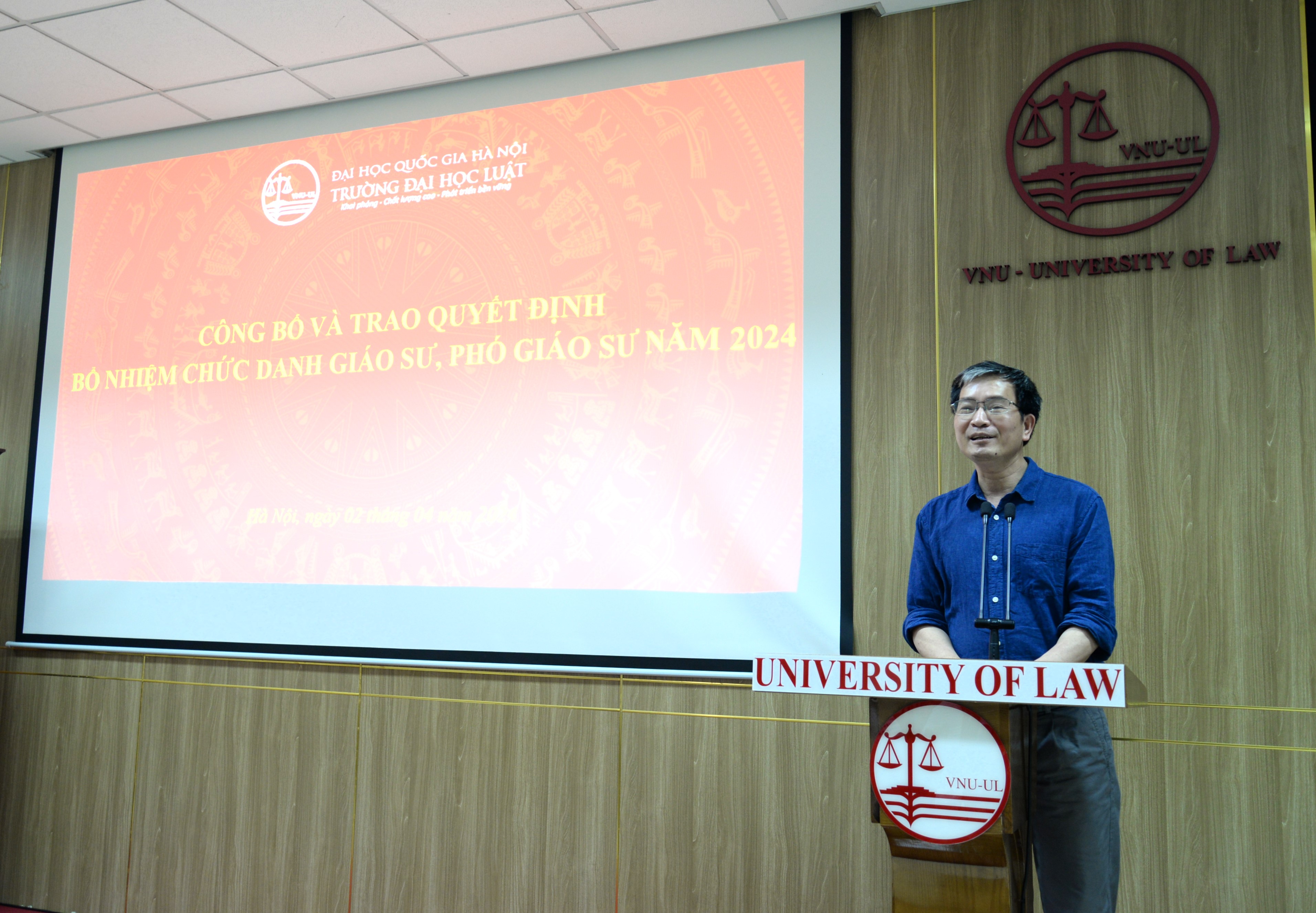Thay mặt lãnh đạo nhà trường, PGS.TS. Trịnh Tiến Việt đã gửi lời chúc mừng các tân Giáo sư và tân Phó Giáo sư, đồng thời mong muốn các nhà giáo được bổ nhiệm chức danh Giáo sư, Phó Giáo sư năm 2023 tiếp tục đóng góp sức lực, trí tuệ cho sự nghiệp giáo dục đào tạo của ngành Luật nói chung và Trường nói riêng. Phó Hiệu trưởng cũng hi vọng các tân Giáo sư, tân Phó Giáo sư có chia sẻ kinh nghiệm, động viên và giúp đỡ các giảng viên đi sau trong qua trình đăng ký xét học hàm trong thời gian tới.