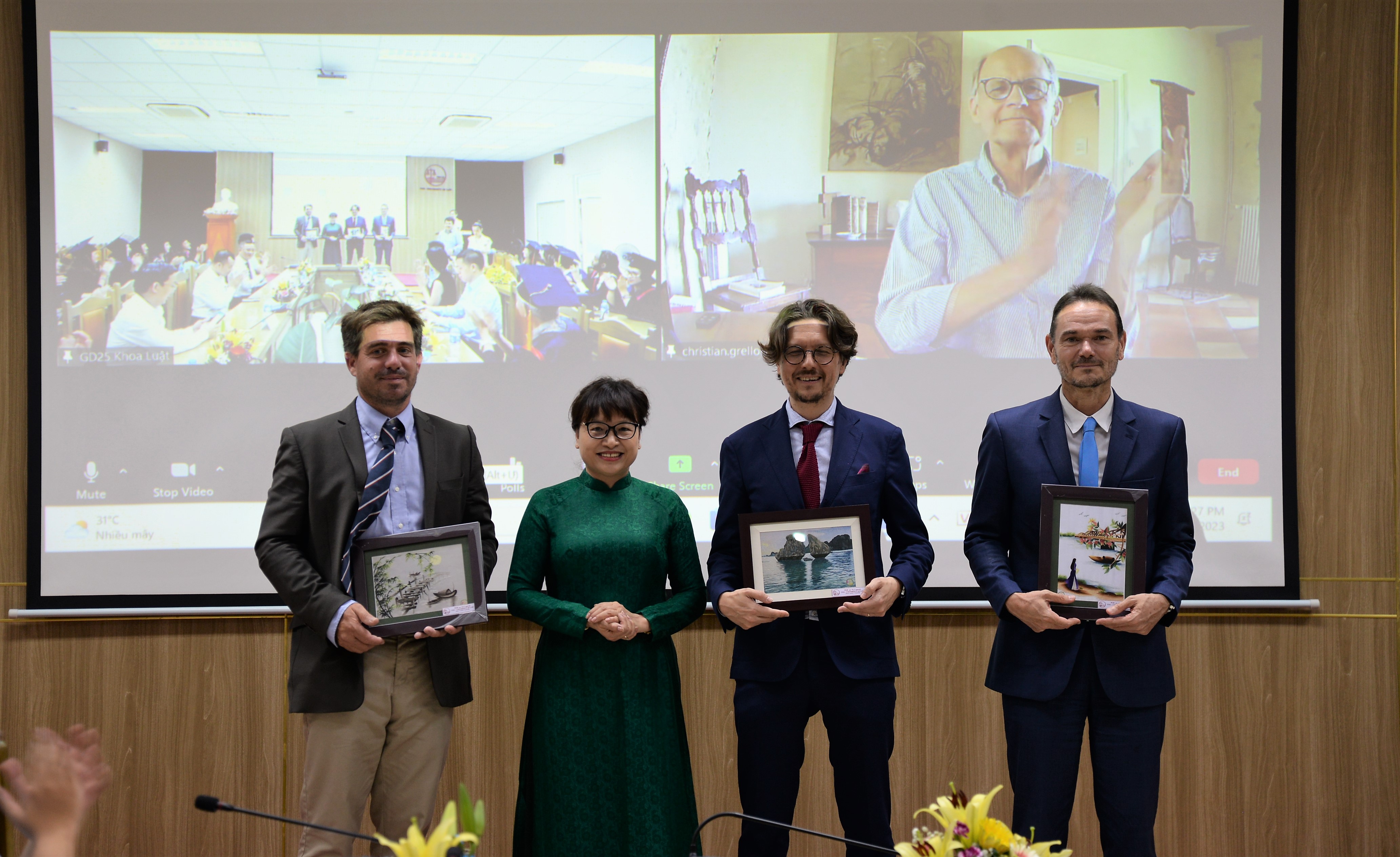 GS. Jean Sagot-Duvauroux (Giám đốc Chương trình) và GS. Christian Grellois (Nguyên Giám đốc Chương trình) đã gửi lời cám ơn tới ĐHQGHN, tới Trường Đại học Luật, ĐHQGHN và đặc biệt là PGS.TS. Nguyễn Thị Quế Anh đã luôn tạo điều kiện, hỗ trợ tốt nhất để Chương trình có thể triển khai hiệu quả. Hai giáo sư cũng gửi lời chúc mừng tới các học viên đã hoàn thành khóa học này và hi vọng các bạn sẽ thành công trên những chặng đường phía trước.